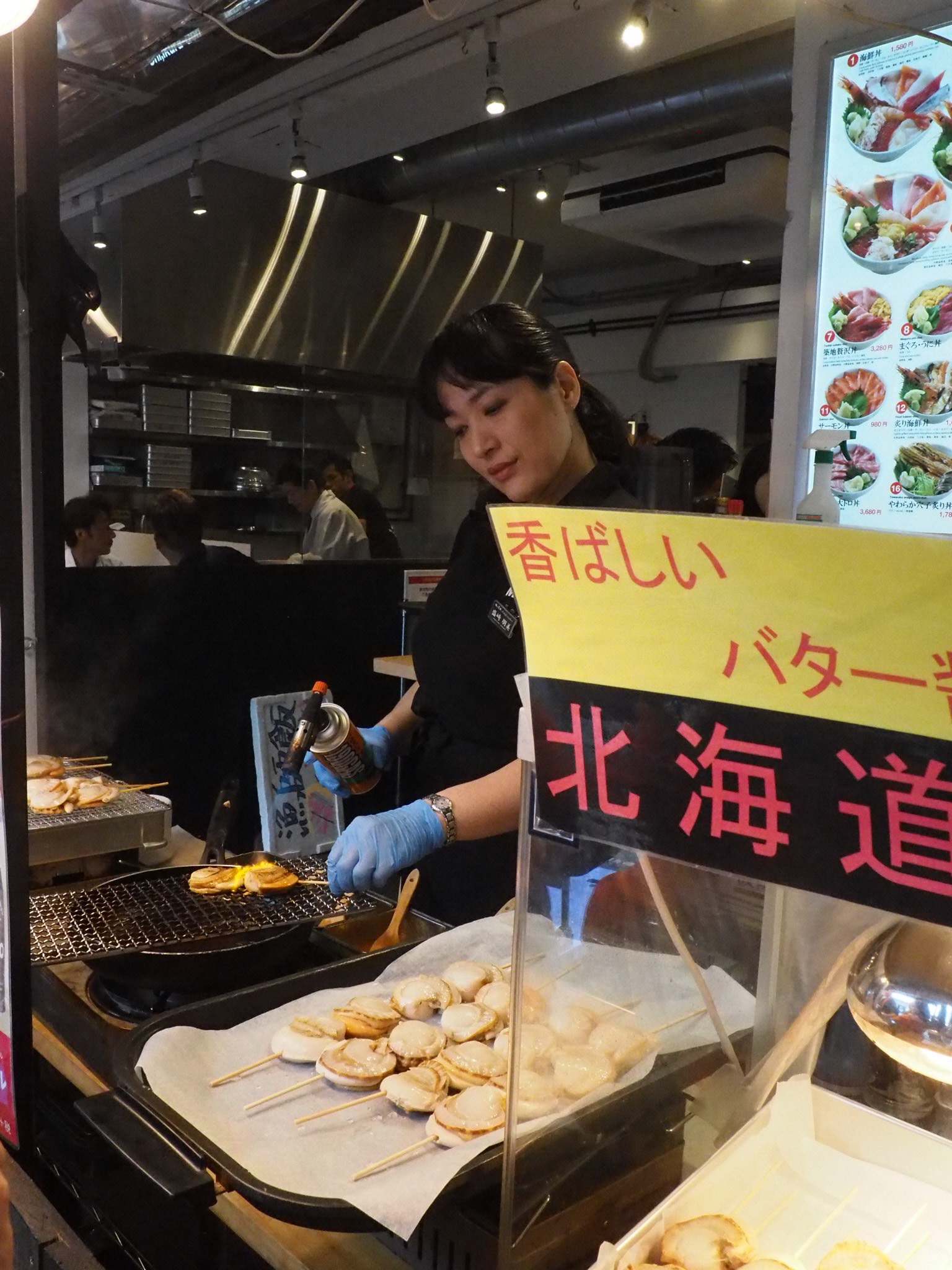 We ate some of the best grilled scallops (above, notice the grilling is done with a mini-blow torch) and a huge piece of unagi (eel) on a stick. Both were delicious.