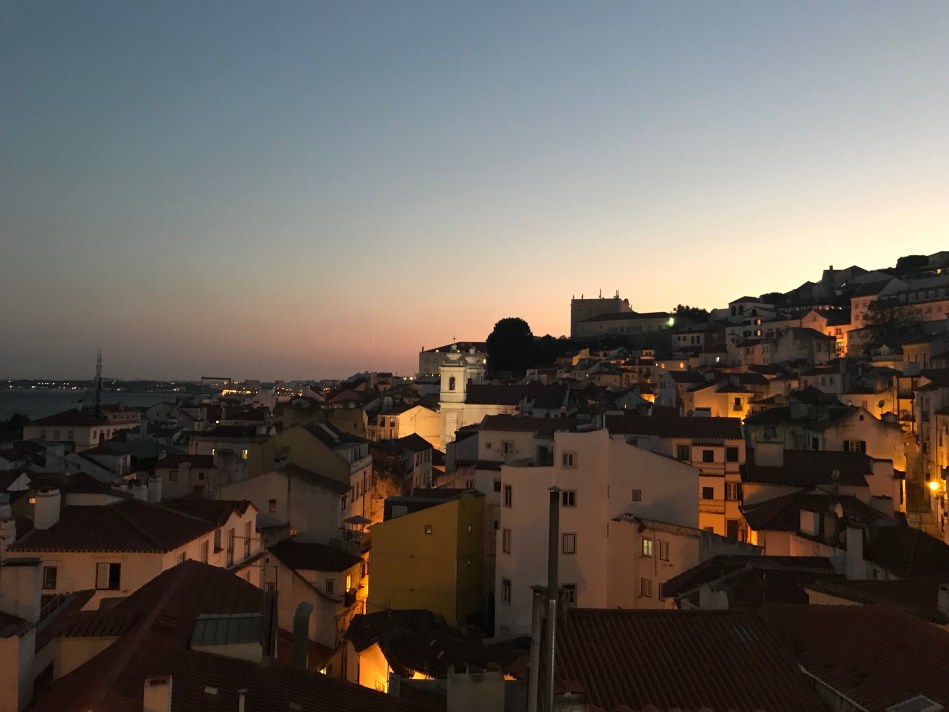 At night, we noticed the second thing we love about Lisbon: the music. Born at sea and then brought ashore in Alfama, Fado “is a form of music characterized by mournful tunes and lyrics, often about the sea or the life of the poor, and infused with a sentiment of resignation, fatefulness and melancholia.” (source: Wikipedia, Fado). It seems everyone here can sing and sing well. The Fado music pours out of bars and restaurants of Alfama, spilling across the cobblestones and rising up into the night air. We were lucky enough to have an Airbnb directly across from such a place with really talented singers and ended each night with a stop in for a listen. There’s also other music too. From our balcony, we listened to wedding music on a Saturday and a reggae-ish (but better) steel drummed African group reverberate down to our balcony from the Miradouro das Portas do Sol plaza each night.