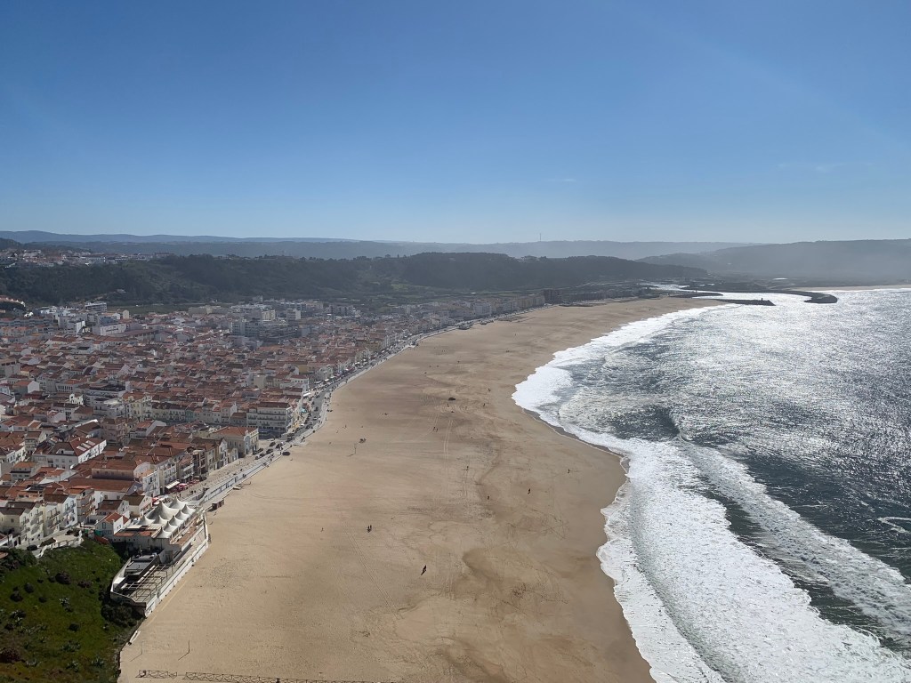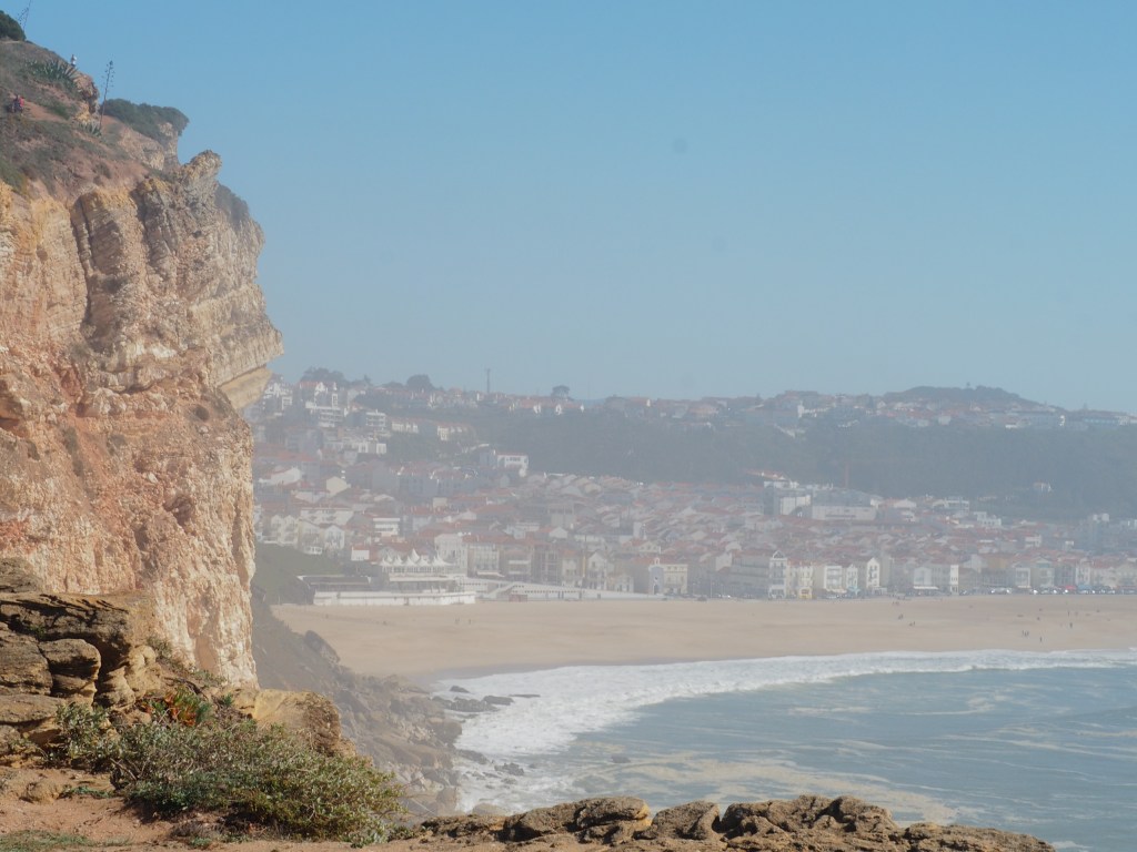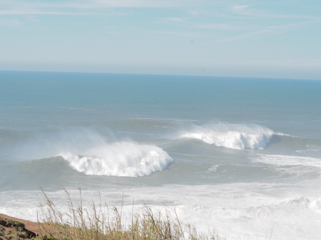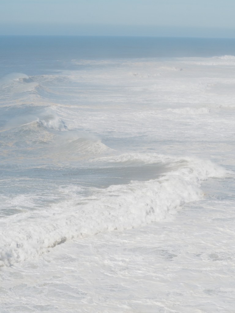 On a Sunday afternoon, the cars stream into town, queueing up and circling to find parking. Some loop twice or more, others circle once then, unsuccessful, search for a spot further away on some back road or in a neighborhood. A light mist hangs in the air, reflecting the sun, as though it were excitement, softening the rough edges of buildings and cliff sides. There’s a festival-like feel to the town. Music plays, vendors in local knit clothes sell their wares, the smell of food trucks wafts into the mist and happy dogs roam the streets freely. The strong wind howls and races up the hill blowing hair and hats out of place. The crowd pushes down the hill, towards the lighthouse overlooking the beach, to see. To see… the waves. Massive waves, too large to fully comprehend without the scale of a surfer or boat against them, born from the depths of the invisible canyon below the surface just off shore and pushed by the wind. The churn from their grandness depositing gallons of foam in the froth and along the beach. This, is Nazaré.