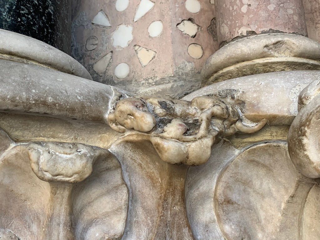 From Ferrari, we went to the Cattedrale de San Lorenzo in which you can see a bomb that was dropped by the British during World War II but did not explode. On the facade, to the right of one of the main doors, look for the dog sculpted into the side of the building. He is known as the dog of San Lorenzo. While the cathedral was being built a small dog was always nearby keeping the sculptors company. He went missing during the last phase of construction and the sculptors created a small carving of him into the side of the church.