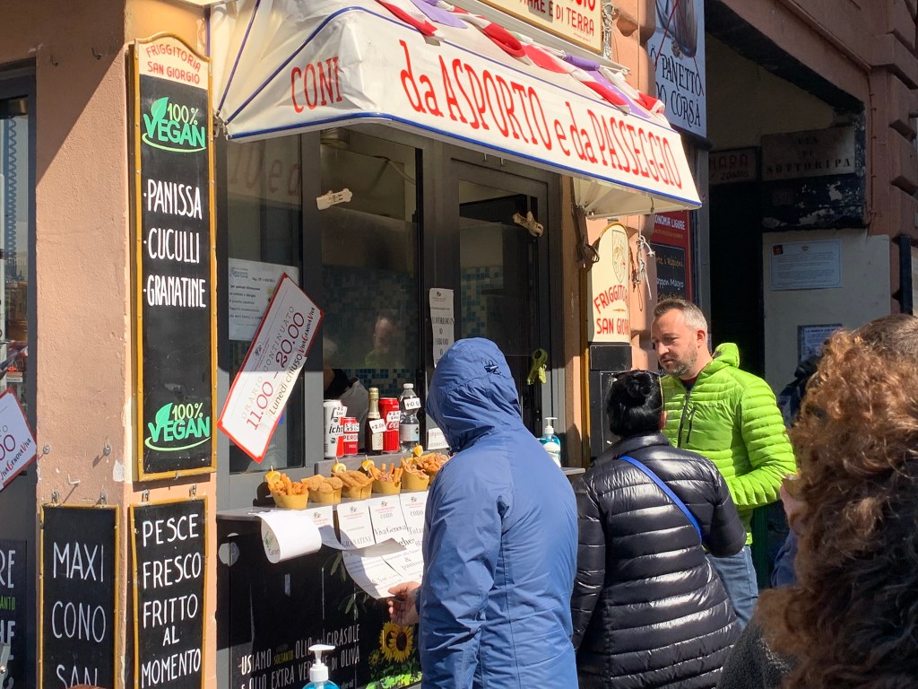 We stopped in Porto Antico at Friggitoria for a Cono Solo Pesce – fried shrimp, calamari and anchovy – not exactly health food, but delicious.