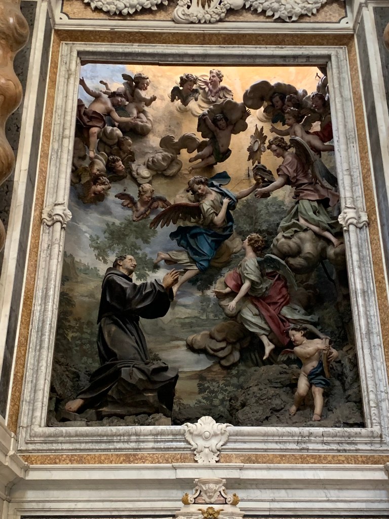 Then, we dove back into the caruggi and headed for the Annunziata church. If you go by, don’t be fooled by the somewhat austere exterior and formal columns. Stop inside for a view of some amazing frescoes, paintings and sculptures on its ceilings and walls. It rivals Saint Peters at the Vatican, in my opinion.