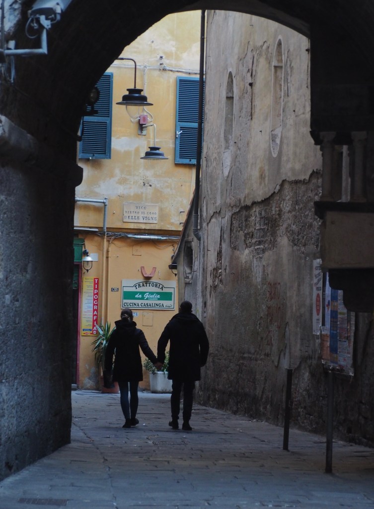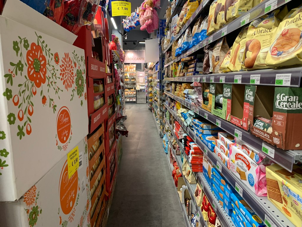 As is our custom, after locating our Airbnb in the narrow alleys of the old town, figuring out how to get ourselves in with a combination of codes, key fobs, lockboxes and keys and lugging our stuff up six flights of a beautiful marble staircase, we hit the closest mini market. Since moving to Europe, we’ve grown accustomed to outdoor markets and mini-mercados. Our local market in Cascais, the Meu Super, is one of our favorite little grocery stores anywhere. In France, we grew attached to the Monoprix. Here, we found a Carrefour with the narrowest little shopping aisles that you wouldn’t think carts would be permitted, but you’d be wrong. We navigated the aisles, finding our various items of cibo (food) for the next few days winding our way among the locals doing their Saturday evening shopping with lots of Pregos, Grazies and Scusis to go around. It was fabulous. Back to the Airbnb through the narrow alleyways passing many a real life Paulie Walnuts, we were instantly in love.
