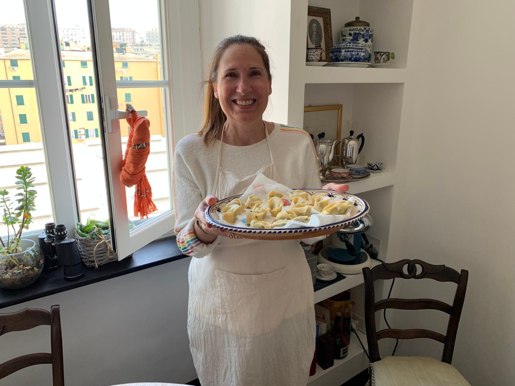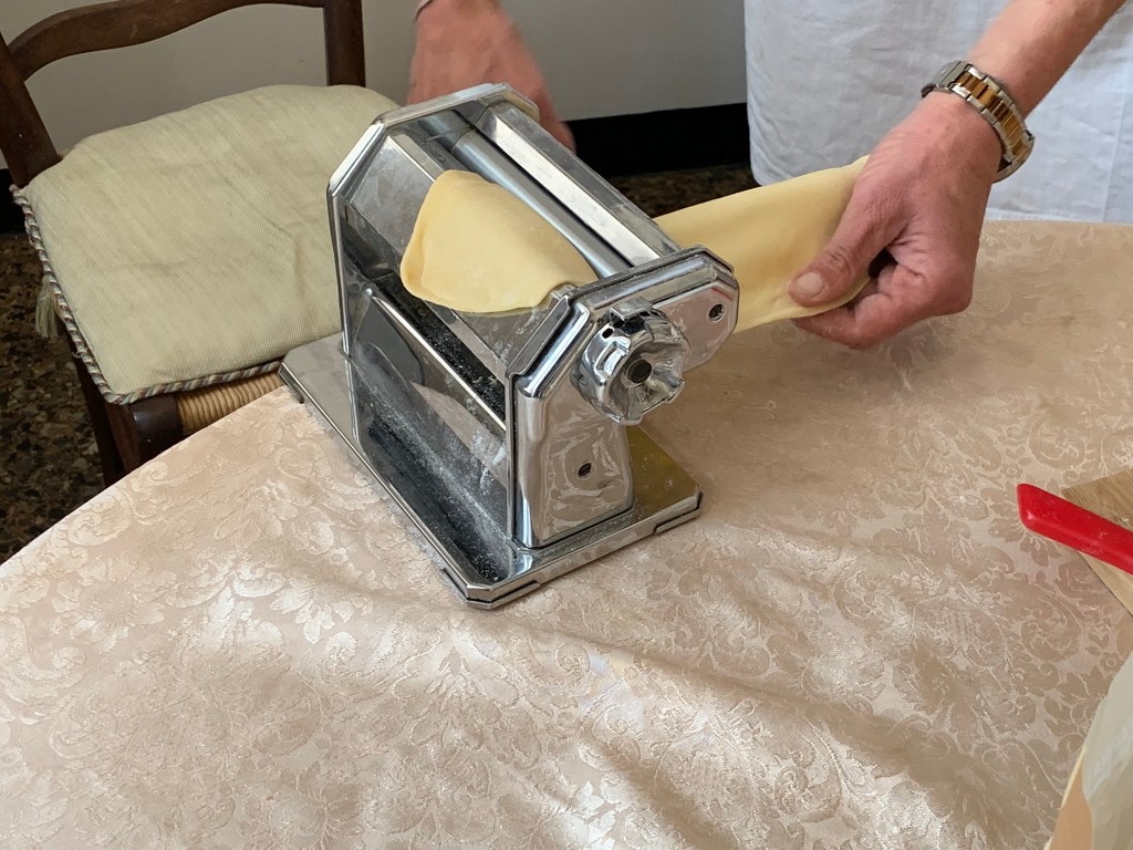 And in keeping with the theme of just how many steps will I need to take each day to keep from having to adjust that belt buckle a little looser, we took an Airbnb experience cooking class. At the home of Daniela, we made pasta and tiramisu. We made a pansotti with red sauce and a homemade thin angel hair-like pasta, called tagliolini, with pesto sauce. All from scratch.