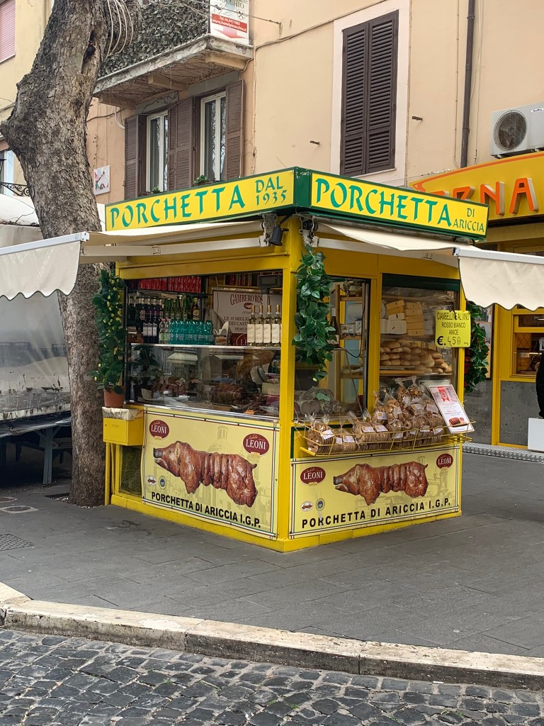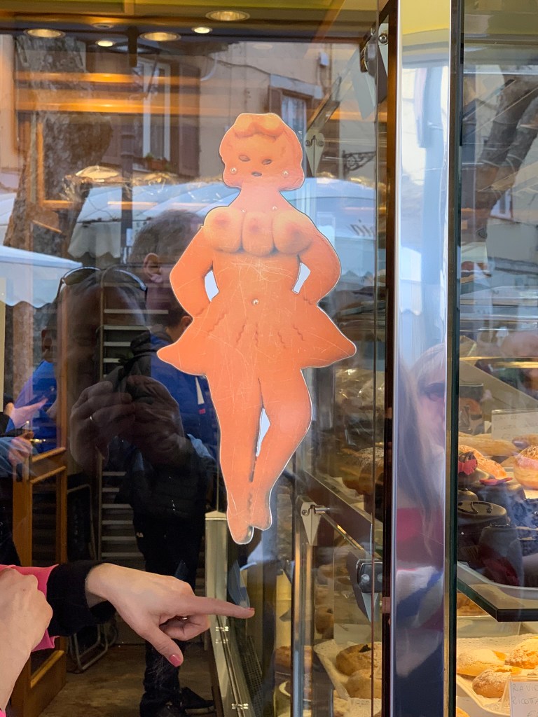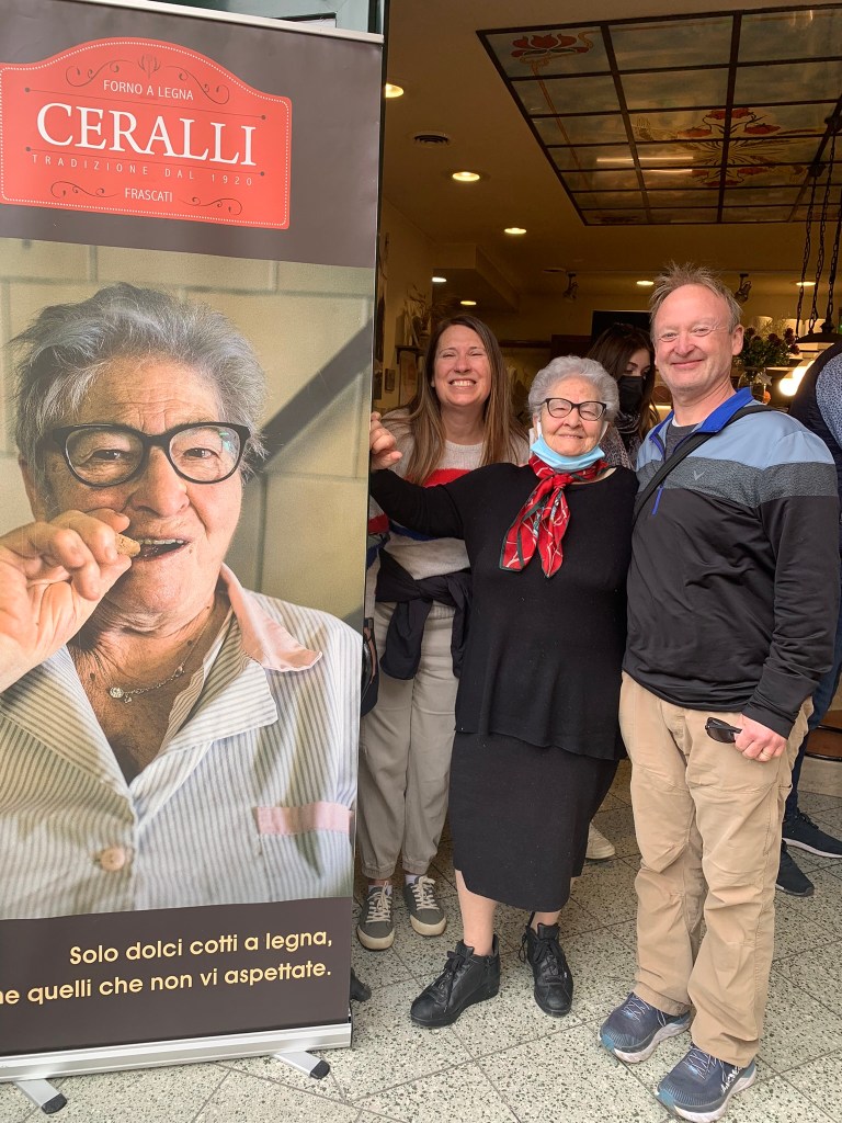 We tried delicious porchetta sandwiches at Ceralli where we met Nonna (grandmother), the matriarch and were introduced to the “most important woman in Frascati”. No, not Nonna nor either Paola (although this may be up for debate) but the three breasted hard biscuit made locally: two breasts for milk and one for wine. (Though Jersey girl two’s honest guess of “pleasure” seemed apropos given the universe of possible answers when quizzed by Paola 2 as to why a third breast would be necessary).