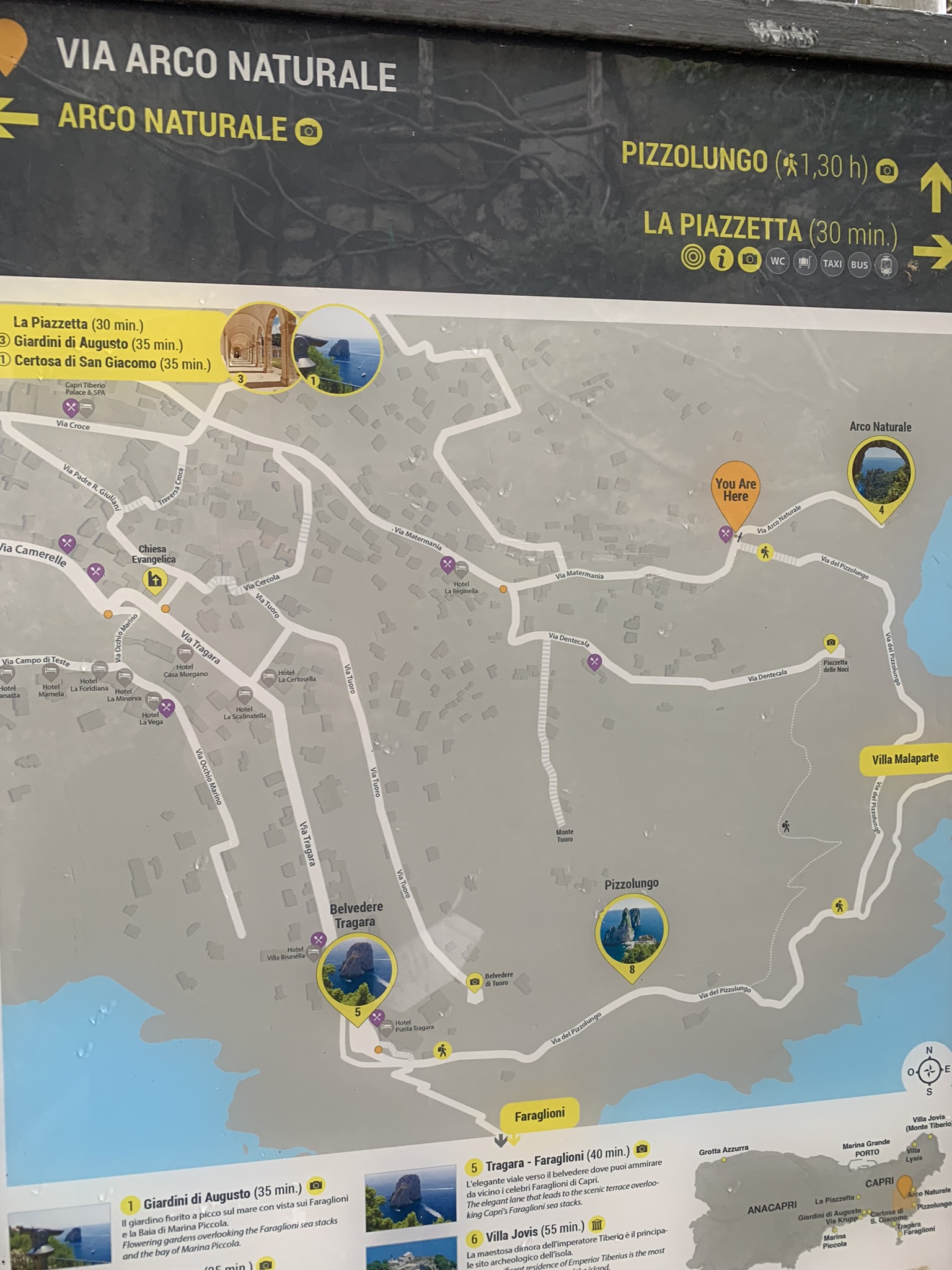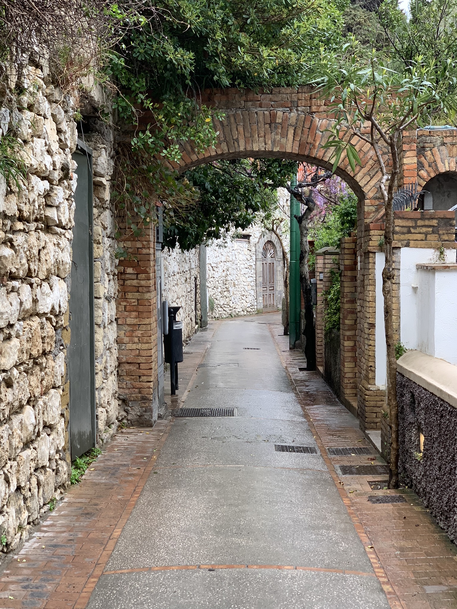 Capri by Land. On our first day, we set out to the town of Capri above. We found the narrow pedestrian (and mini truck and motorbike) pathways to make the climb less a frenetic search for cars, or more so busses, around the corner of the narrow roadway. Hitting town just before lunch time we were amidst an onslaught of the aforementioned day trippers and cruisers but headed past the popular Piazzetta di Capri and its views to the Via del Pizzoluongo a narrow trail way which winds around the cliffs overlooking the Faraglioni Rocks and the Natural Arch. Beyond, we could see the Amalfi coast preparing for our imminent arrival.