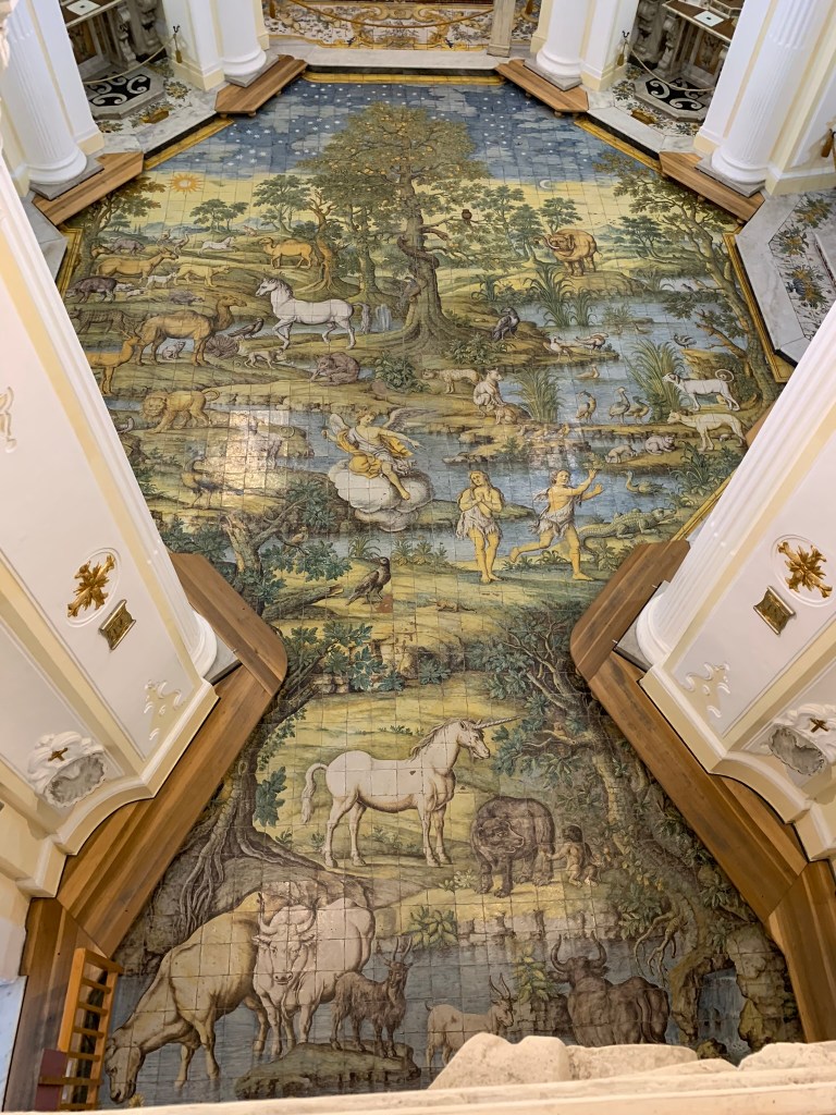 A Rick Steves podcast we’d listened to that morning told me that the floor of the Church of San Michele was worth checking out, so, after rewarding myself with a cup of straciatella gelato, I headed straight there. The reviews are right. The floor is amazing with images of Adam and Eve being driven from the garden of Eden with abundant animals (many with human-like faces) around. You can encircle it on carefully placed wooden boards and then climb the tiny spiral stairway to view it from above.