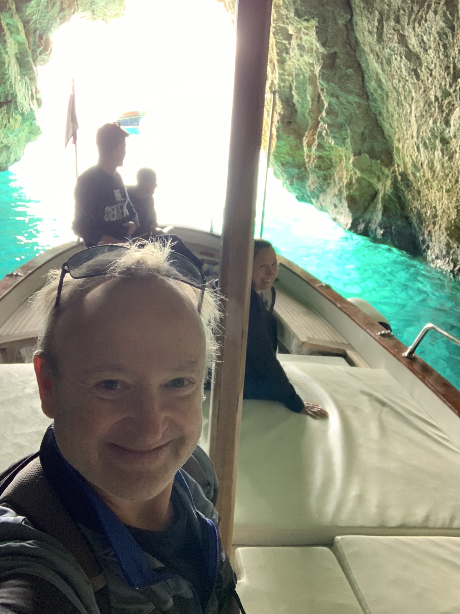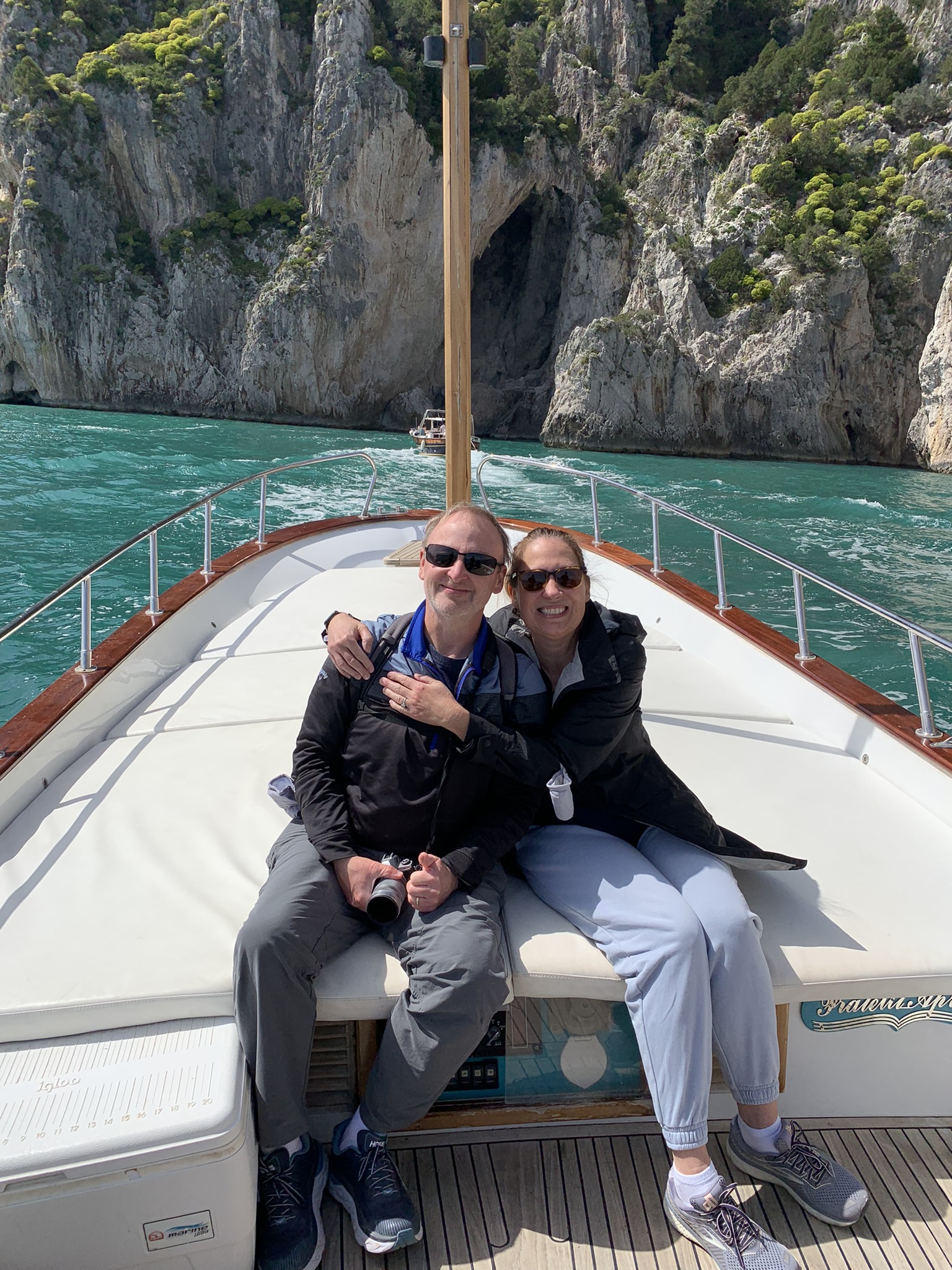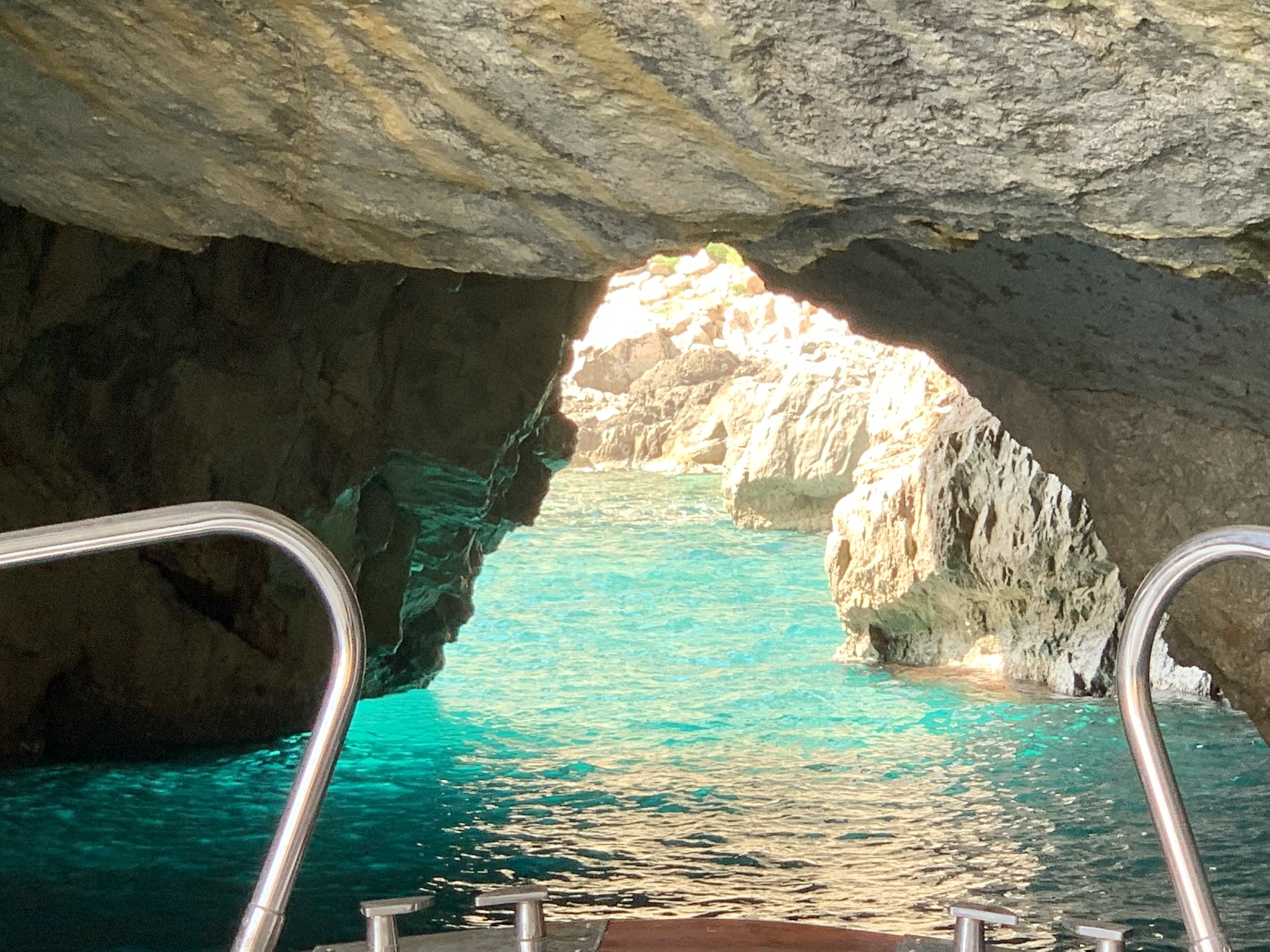After lunch in the port at Ristorante L’Approdo (so good, we went back while we waited for our ferry back to the mainland the next day) recommended by Tony (one of our Airbnb hosts and far enough down the port from the ferry docks to be chosen by more locals than tourists) we were met at the meeting point and ushered aboard a small sailboat with an outboard motor by Manuel and Salvador both natives of Anacapri and both in stocking feet. Manuel narrated our ride around Capri while Salvador, who was training, did most of the driving. We saw many of the famous sights we’d seen from above the day before: the Faraglioni Rocks and the Natural Arch, but got to view and visit the white grotto, the green grotto, the grotto of matrimony and the sailors’ cave. Not to be experienced without a boat, it was well worth it.