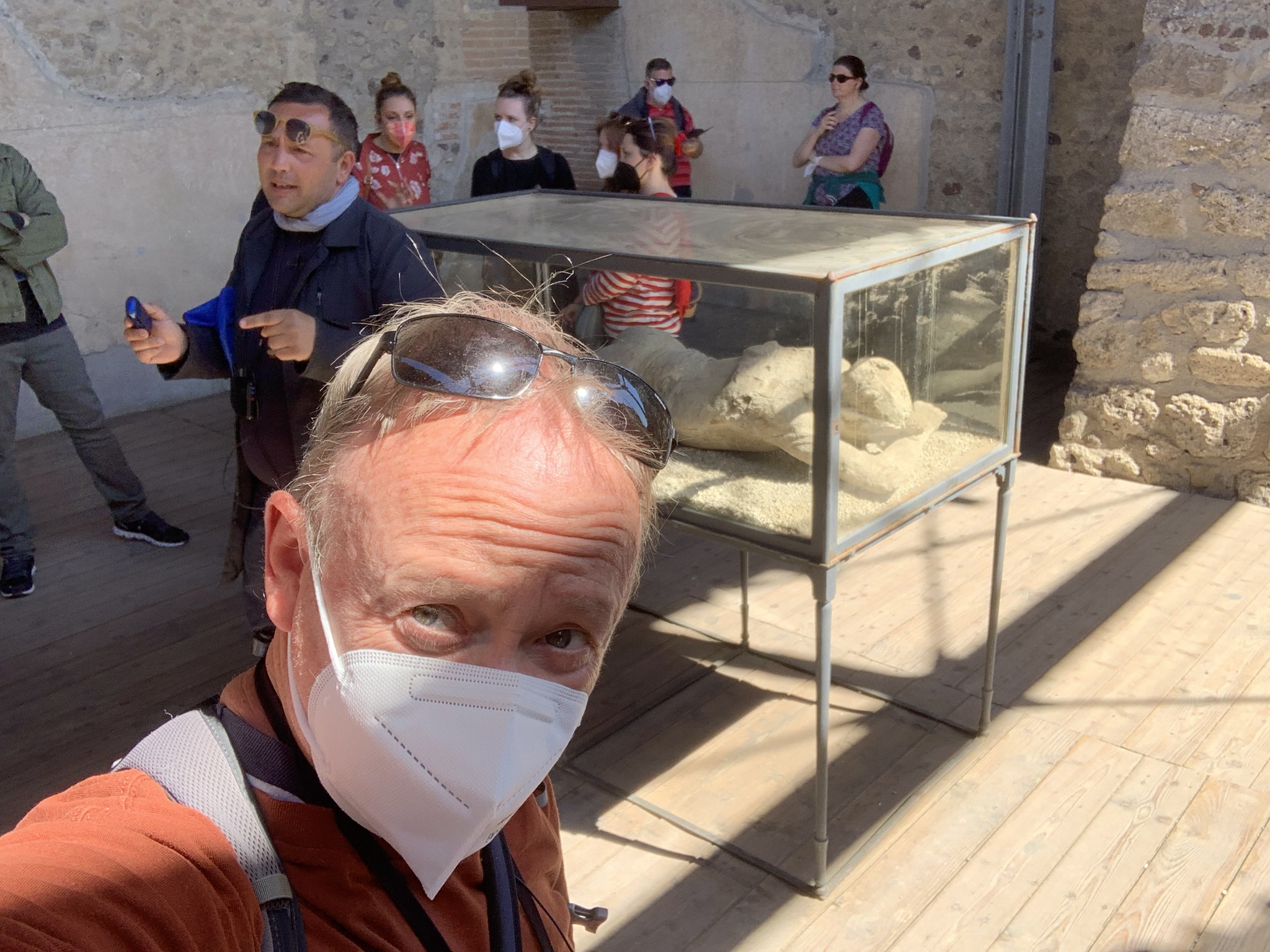 We visited the amphitheater, one of the Termas (bath) and the theaters. He showed us the cast of a sleeping woman buried in the ash and explained how archeologists poured plaster into the cavities left by their disintegrated bodies to recreate the positions they were in on the dark day in AD 79 when the city of Pompeii was covered with an average of 5-7 meters of ash.