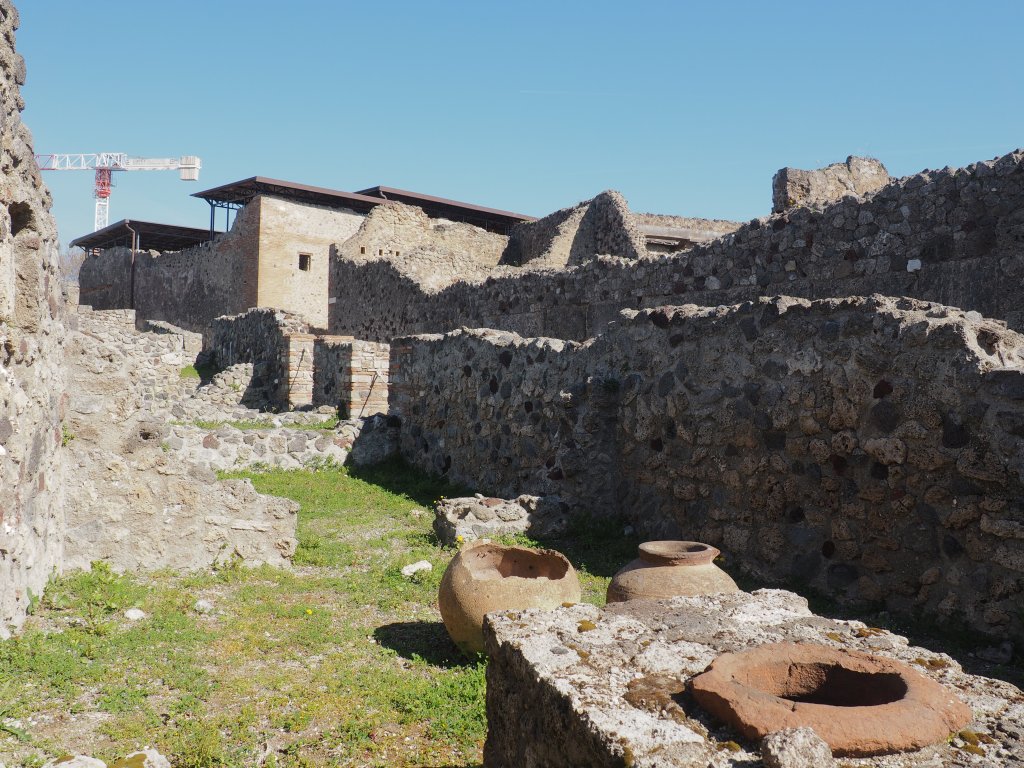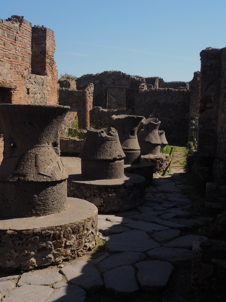 He described the scenes of commerce on the Via Marina and Via Dell’Abbondanza. Showed us how we could recognize a bakery or find the brothels and their menus of service (like we found in the Archaeology Museum of Naples’ secret rooms a couple of weeks ago) by following the pointing phalluses up the road.
