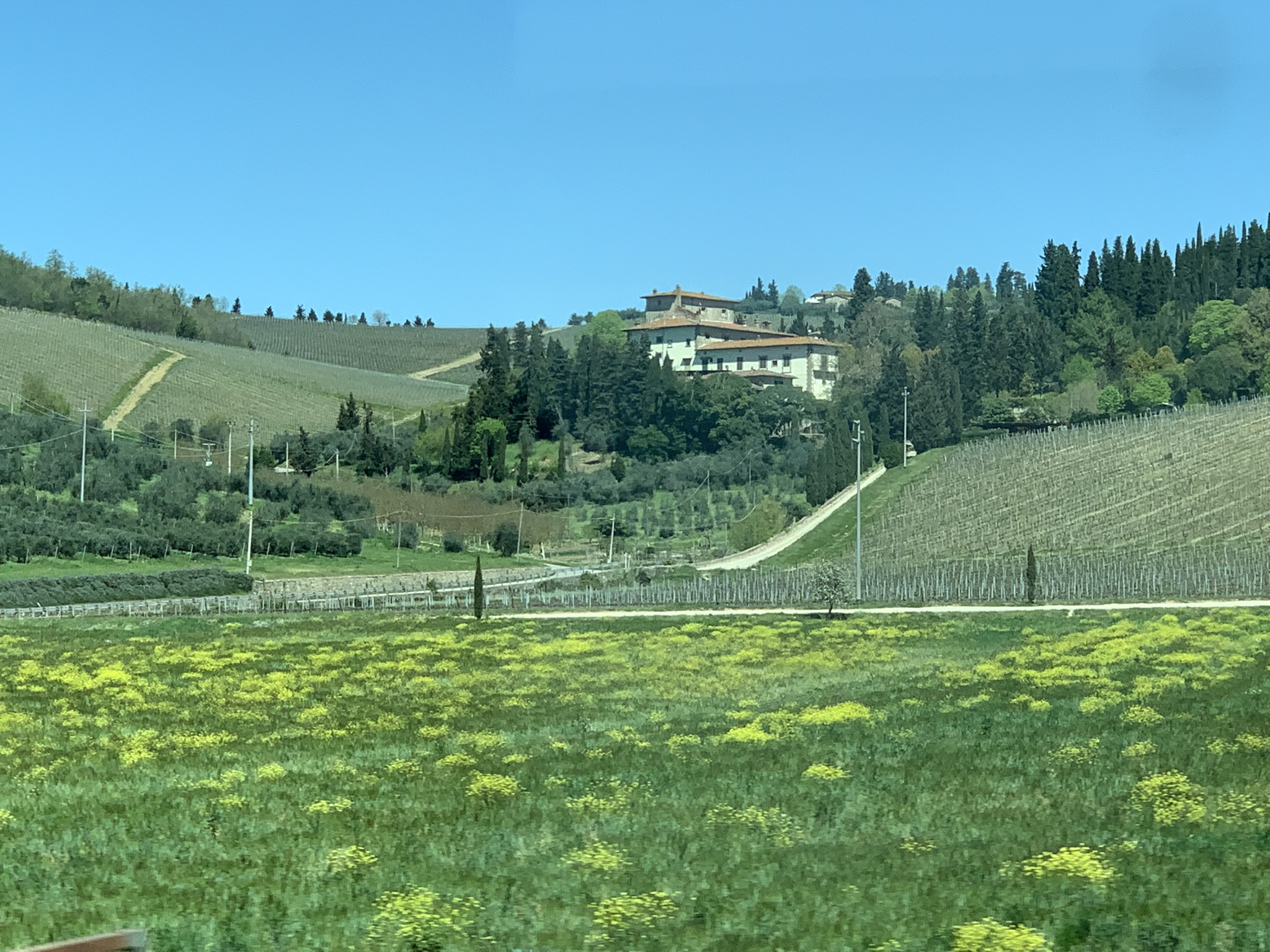 From Siena, we detoured off the direct path to San Gimignano to have lunch in Greve in Chianti. Traveling through a combination of modes of transport (car, train, ferry, etc) enables a variety of different view points of a region and now, with a car, we wound our way through the hills of the Chianti region with its stereotypical, but not to be minimized by that word at all, views of the countryside. Tuscan cypress trees, miles of vineyards and olive groves, bright green budding and flowering trees, yellow flowers splitting lines of grapes: words can’t capture it. It does look like the movies.