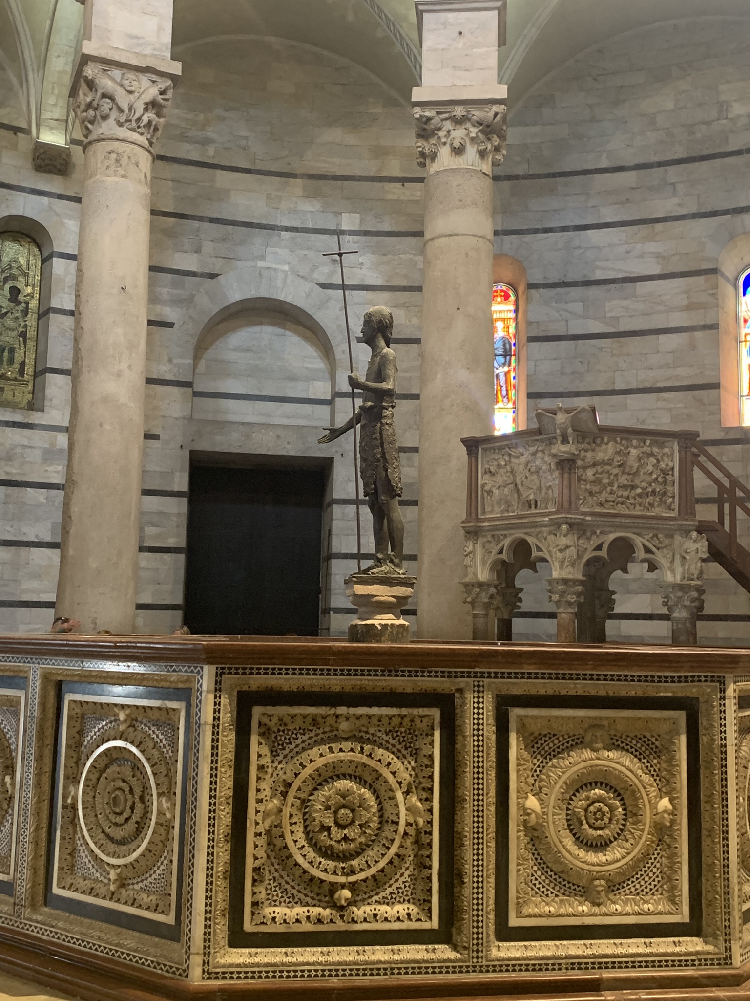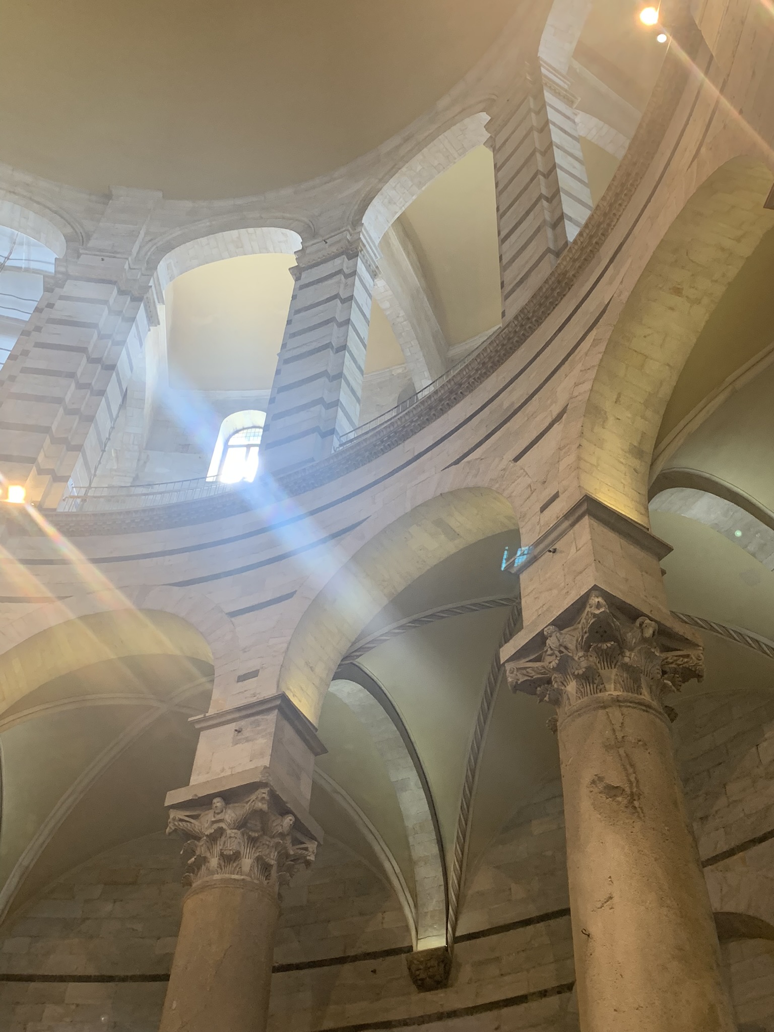 From San Gimignano we rode west towards our last stop in Tuscany, Lucca. On our way, we visited Pisa. After our obligatory “holding up the tower” photos (hard to resist, and everyone’s doing it, man) we visited the Bapistry and the Duomo. The Bapistry has Roman arches, a large dome and the light from the windows and lighting above filters down on the central statue of Saint John the Baptist and the arches in, dare I say, a Holy way.
