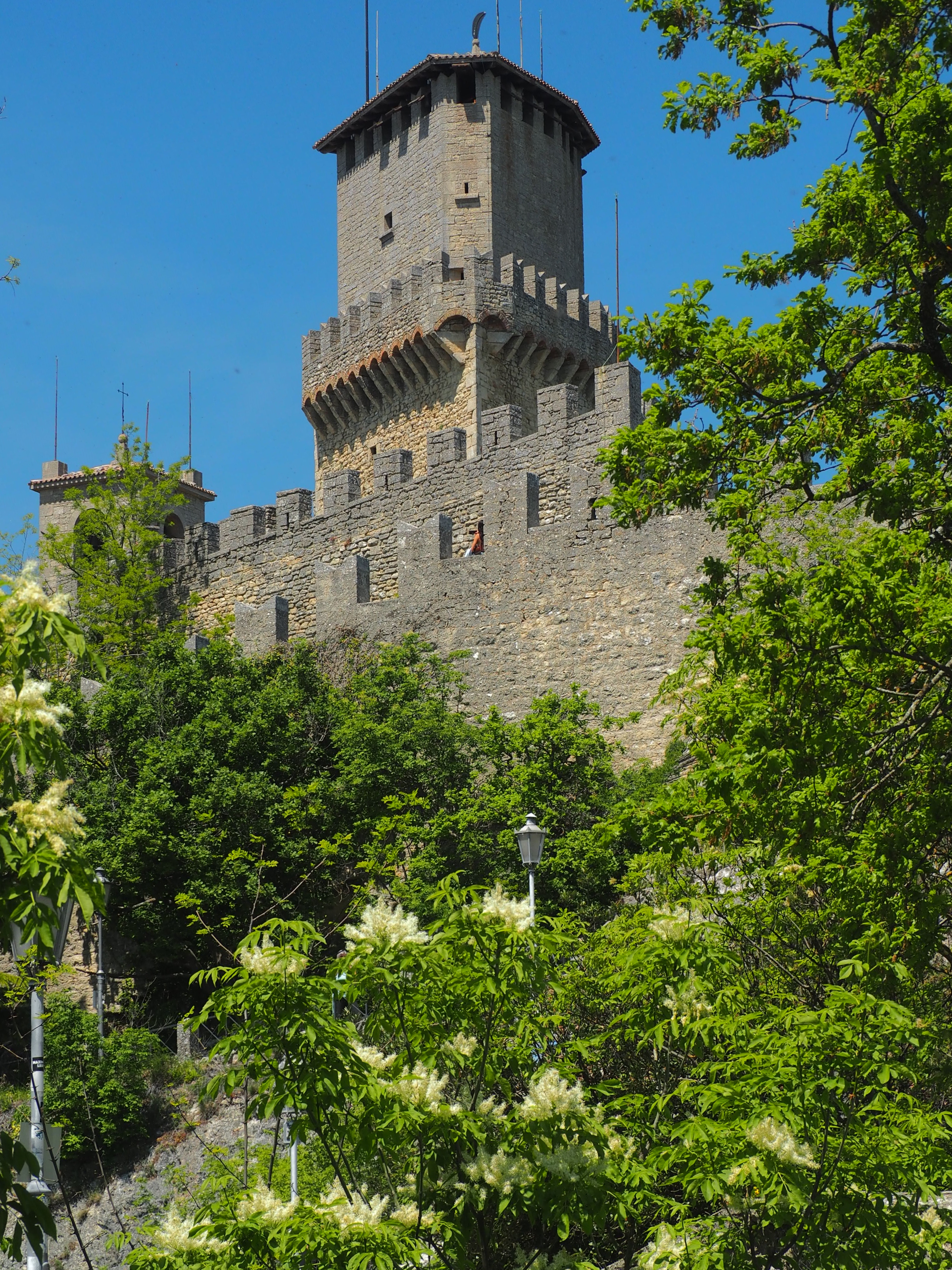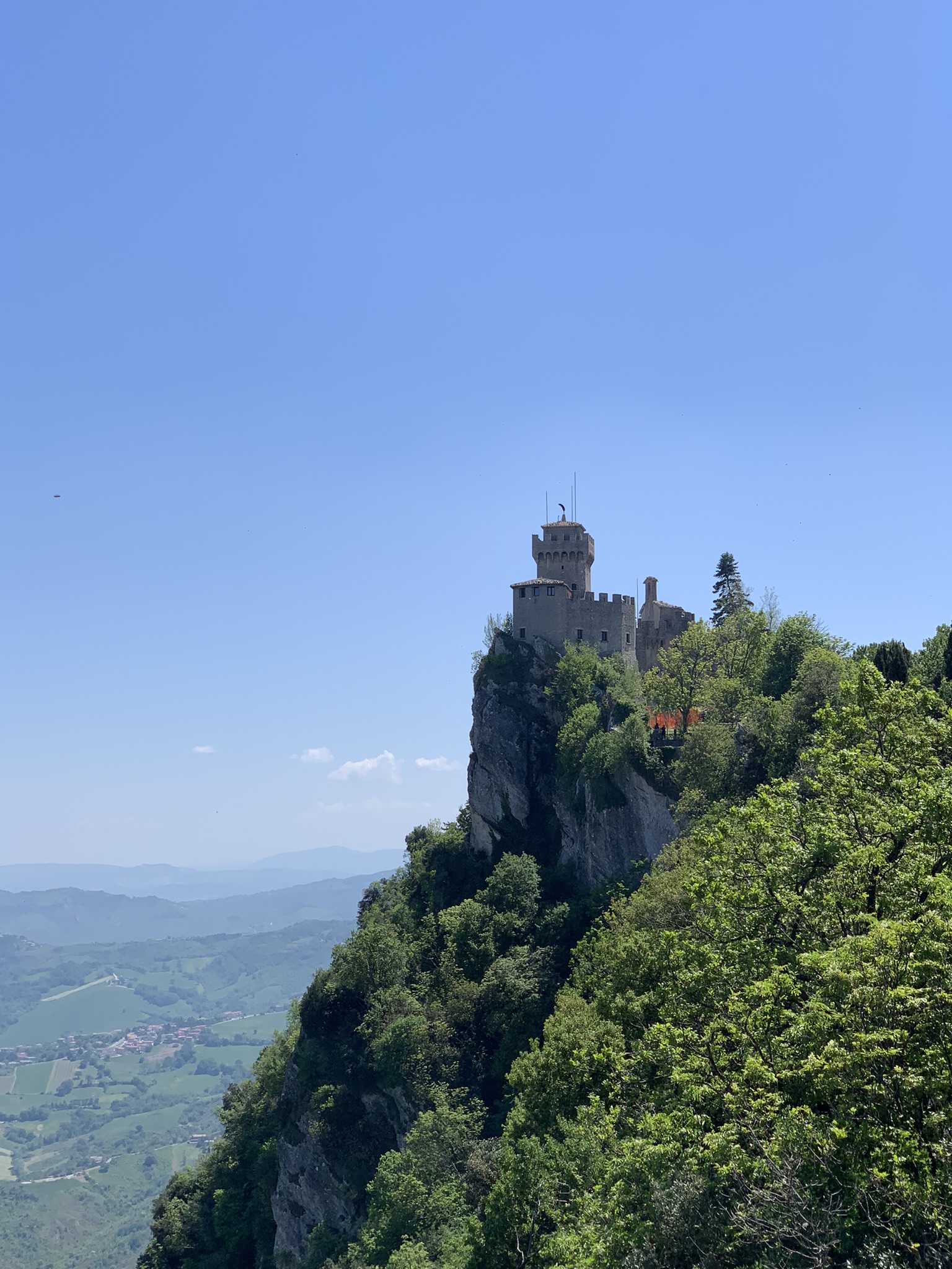 You can take a train to Rimini, on the coast, and a bus from there or you can drive. We drove, parked and took the quick funicular up to the heart of the capitol city of San Marino, also called San Marino. Surrounding the Titano Mountain, on which the capitol lies, are villages and farms and other mountains and because so much of the surrounding area of Italy is mostly flat, you can get some pretty killer views from the towers and walkways of this small city.
