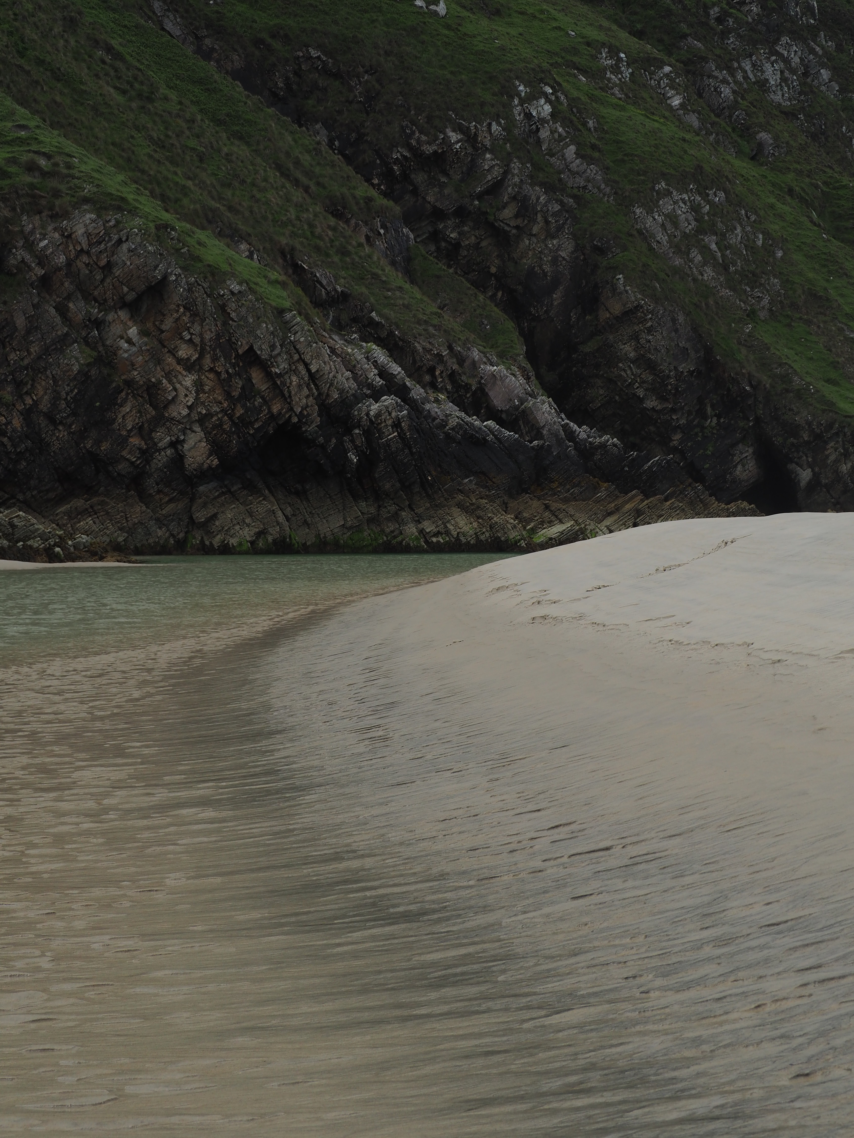I’d read about Maghera Strand beach and caves in the aforementioned guidebook. Just near Ardara about 10k down a windy and very narrow road you reach a waterfall with goats and sheep grazing above, a swimming hole below and a few solemn gravesides around. Stop and dip in the cold cold water and then keep going, you’re only just getting started. The small parking lot for the beach cost €3 per car and was well worth every penny. The wee lad collecting the fee was almost apologetic when he gave us the rate. If you arrive at low tide, you’ll be well rewarded. Pass through the grass adorned and wind whipped dunes to the beach proper. Head to your left towards the caves. The mix of browns, yellows, greys and blacks on the rocks of the cliffs descending to the beach and sea where the last high tide left algae on their banks is breathtaking. Multicolored tidal pools and rivers stream back towards the sea and the firm, wind sculpted sand makes walking easy as you admire the designs of black, light brown and yellow sand left behind when the sea receded. Pictures don’t do it justice.