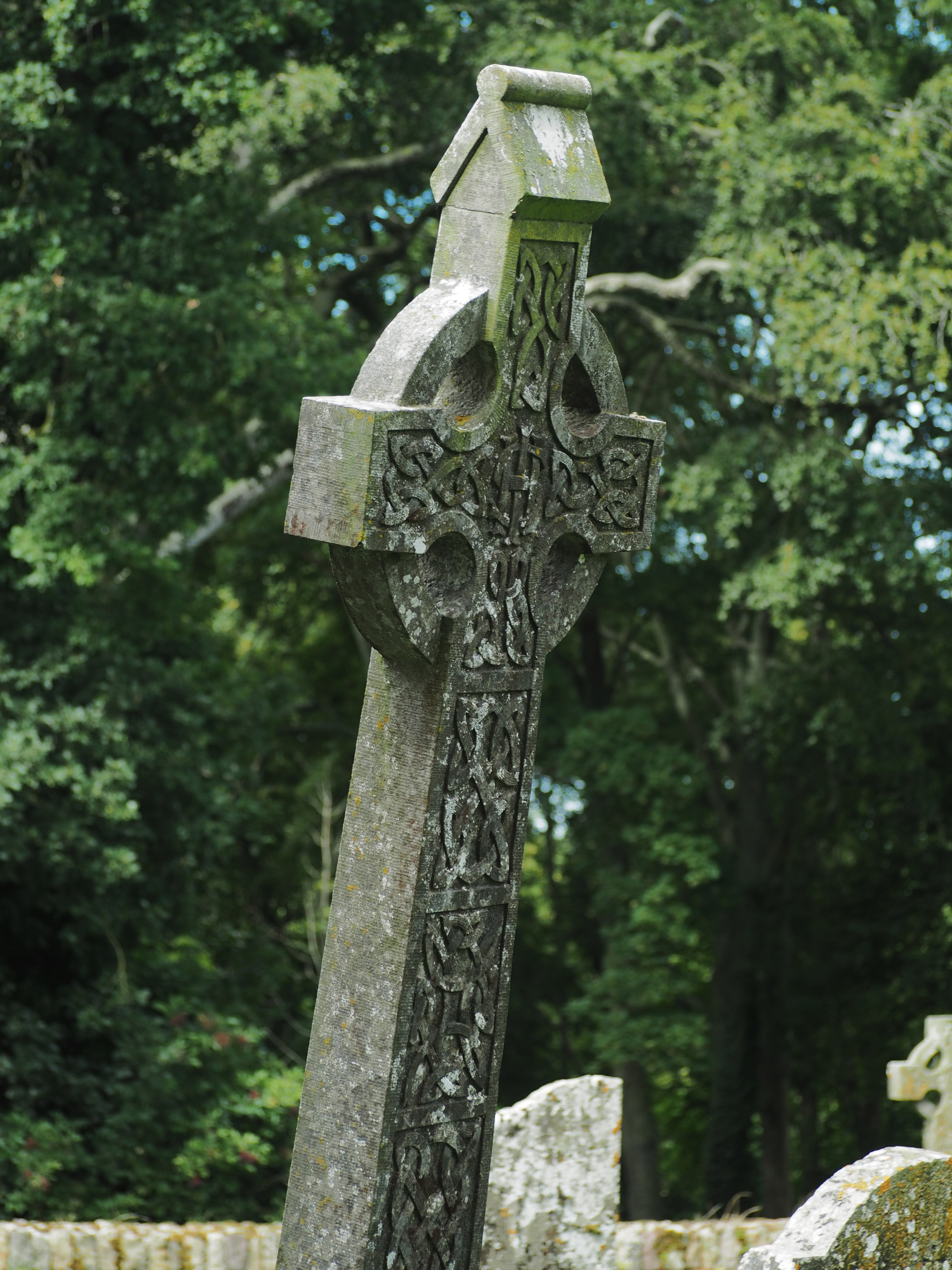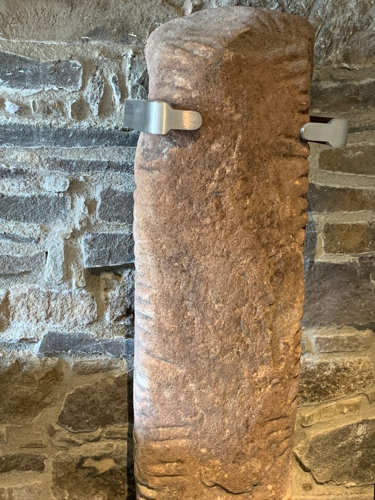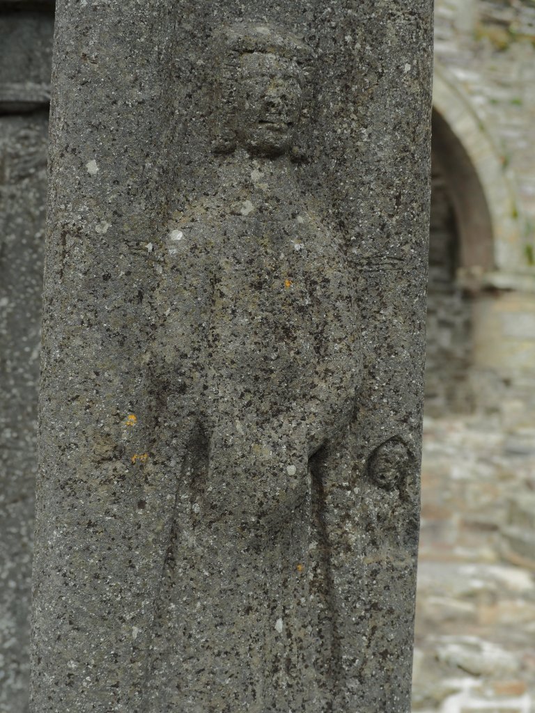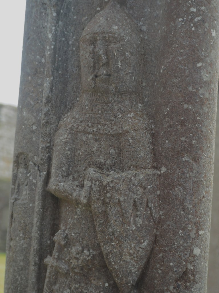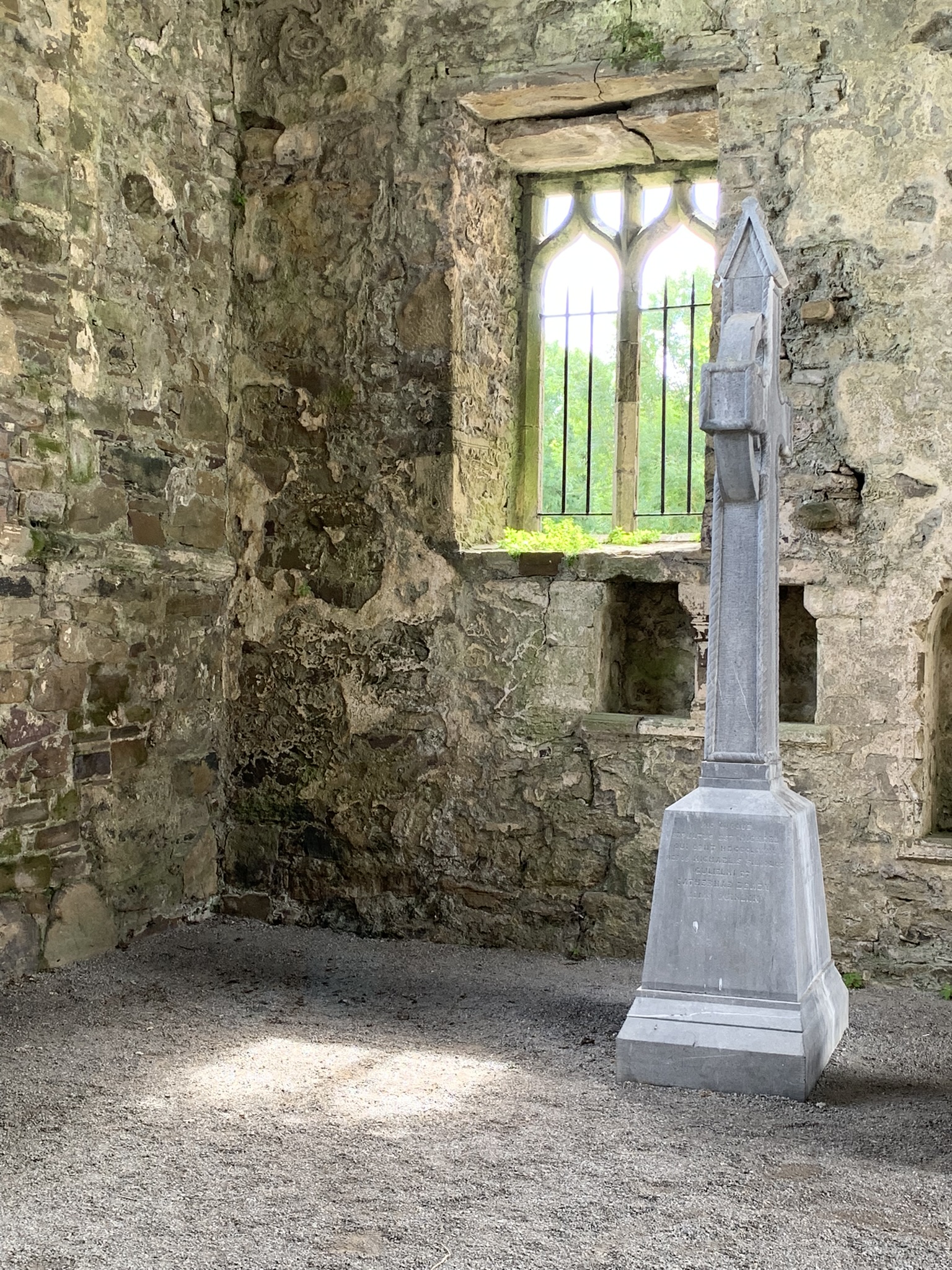 So, as we drove northward just south of Thomastown and I saw Jerpoint Abbey coming upon us around a bend, I pulled over to stop. We parked and went in and Gerry enthusiastically explained the history of the abbey, explained the carvings on the arches of the cloister, told us the story of the Fitzgeralds and the Butlers who “when they weren’t fighting each other were marrying each other” and the carvings of two who’d married on either side of a stone pillar both with the family’s pet monkey who, as the story goes, saved their baby from a house fire. He showed us the column housed inside the Abbey with the early Irish language carvings and talked about the remains of the paintings on the walls inside.