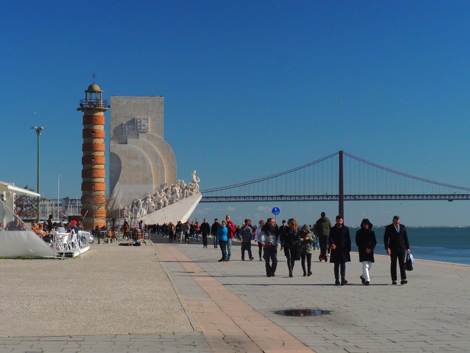 2. River Walk. A quick stroll through the Jardim do Praça Império directly in front of the monastery, will bring you to a subterranean passageway which deposits you on the banks of the Tejo (Tagus in English, which is the Latin name) river. While you’re still basking in all things navigational, stop at the Monument to the Discoveries (you can climb to the top for a fee and a view). Henry the Navigator (who was not really much of a sailor nor a navigator but was influential in the Portuguese age of discoveries and in building lighter ships which could sail faster and for longer distances) is depicted on the prow of the ship. On the sides of the monument, to his east are the great explorers of Portugal and to the west are those who supported the “discoveries”.