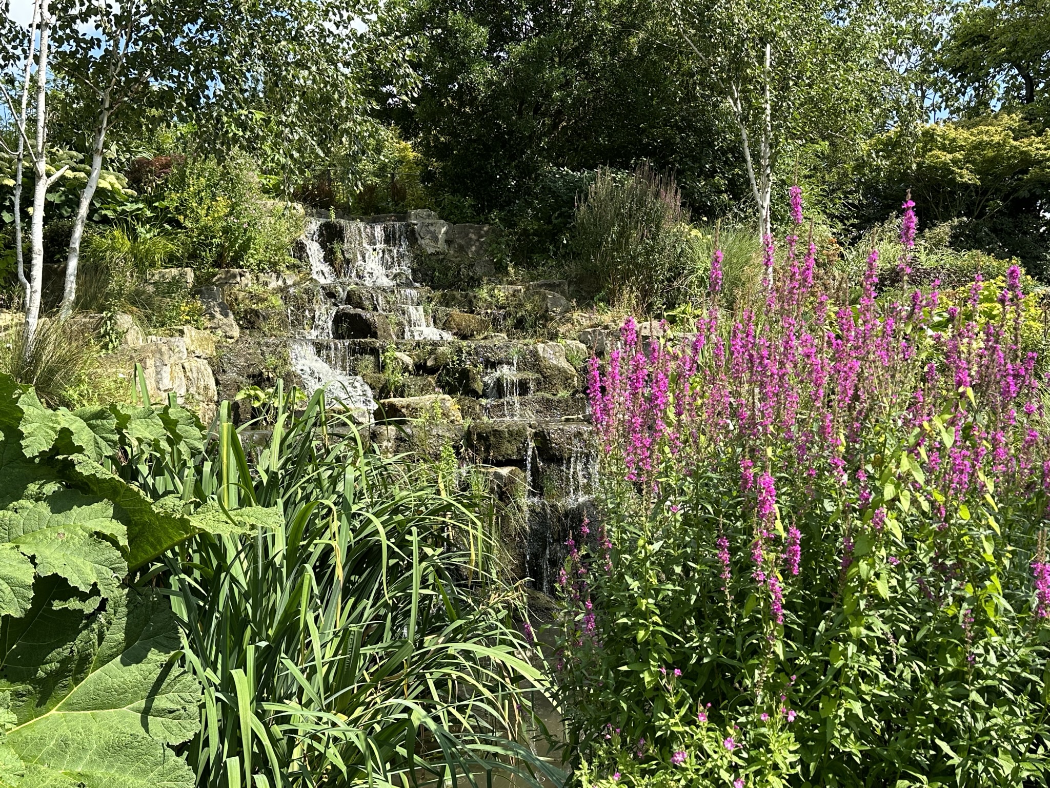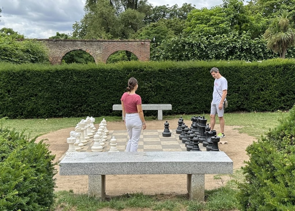 Day One: Holland, Kyoto, The Ritz and Six. Our first day had two real items on the agenda: provisioning for our UK tour (a proper rain jacket as I’m told it can rain here from time to time, hiking boots, some road cooking utensils to overcome strange Airbnb shortcomings, etc.) and the musical Six. En route to shopping we detoured into Holland Park (free to visit). After paying homage to Lord Holland and his pet pigeons we made our way to the Kyoto Gardens of Holland Park which feel authentically Japanese smack dab in the middle of London. From there, we passed through the Dutch gardens with neatly organized rows of flowers and a massive human sized chess set.