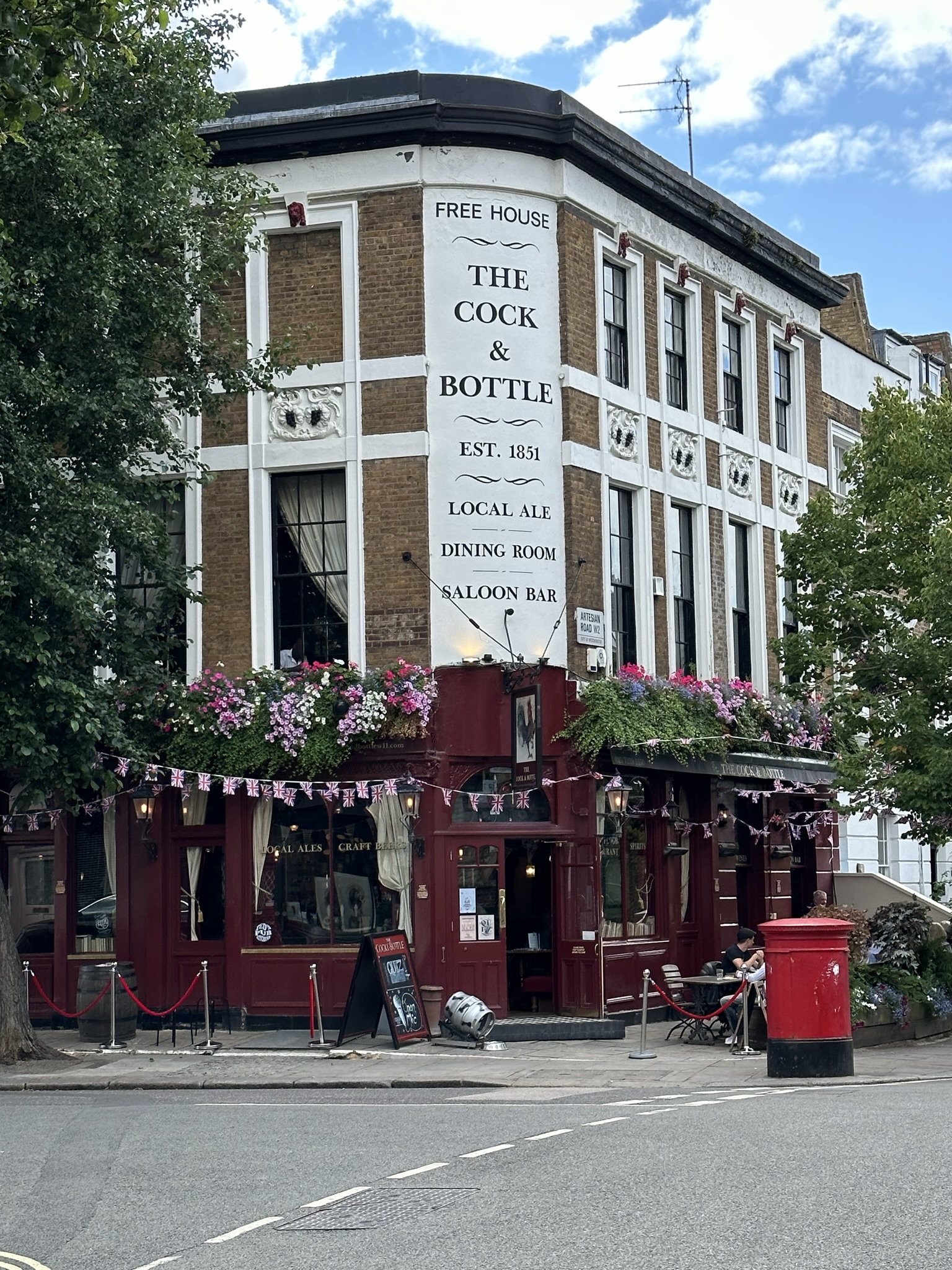 London has some of the best middle eastern and Indian food on the planet, except (I assume) in the Middle East and (I can attest to) in India. So what better way to kick off our five day return to London and the UK than with a Lebanese meal. According to Londonist, El Waha is “the best Lebanese restaurant in London”. I’d reserved a “table by the window” which I had, of course, forgotten with all the reservations we’ve made for our upcoming many weeks of UK touring. Fortunately, Maher our waiter and host had not forgotten and we were quickly seated at the “best table in the house”, to which we can now attest. We left our order in Maher’s hands and started with the Mhamarah Red Peppers, the Fatoush salad and the Hummus Khawarma with lovely bits of grilled lamb buried within. All that was followed by the spicy version of the Sea Bass and paired with a Lebanese Sauvignon Blanc. Delicious. And of course, no first night would be complete without a visit to the neighborhood pub which, in our case, was the Cock & Bottle.