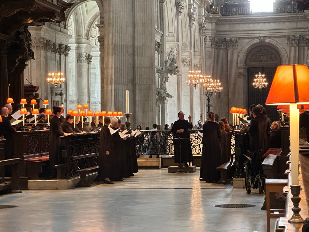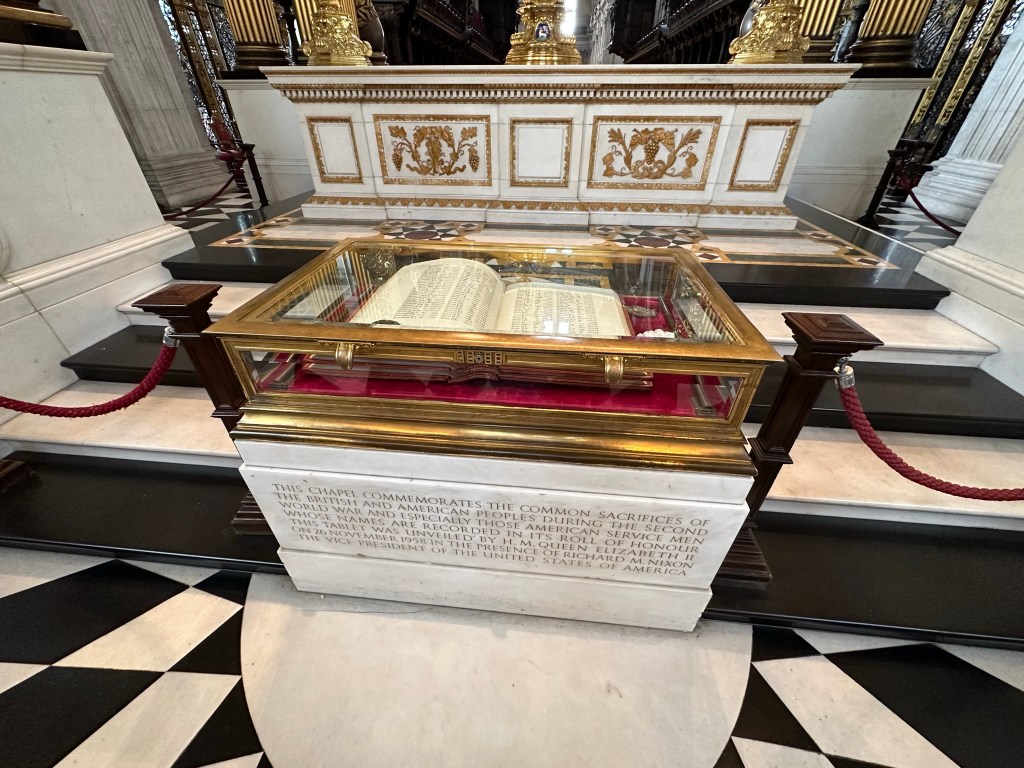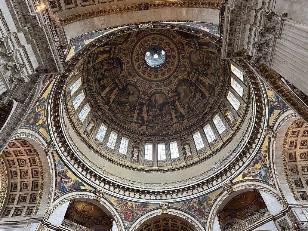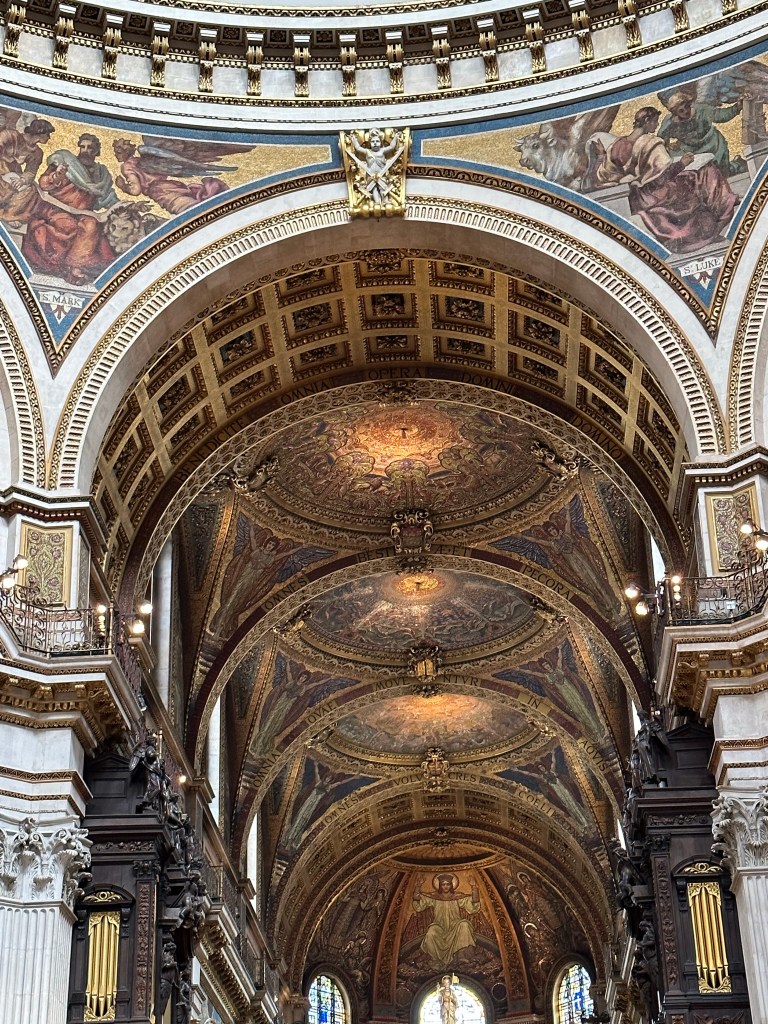 While Melissa worked, I set off in the afternoon to visit Saint Paul’s Cathedral (free to worship, admission fee to tour – advanced purchase for a discount and recommended). She’s not a huge fan of crowded, cramped, winding staircases to the top of towers and, well, I am. With Rick in my ears, I toured the chapel, viewed the dome from below and checked out the altar and the American Memorial chapel. My visit was accompanied by a choir practicing for that evening’s service, an added bonus.