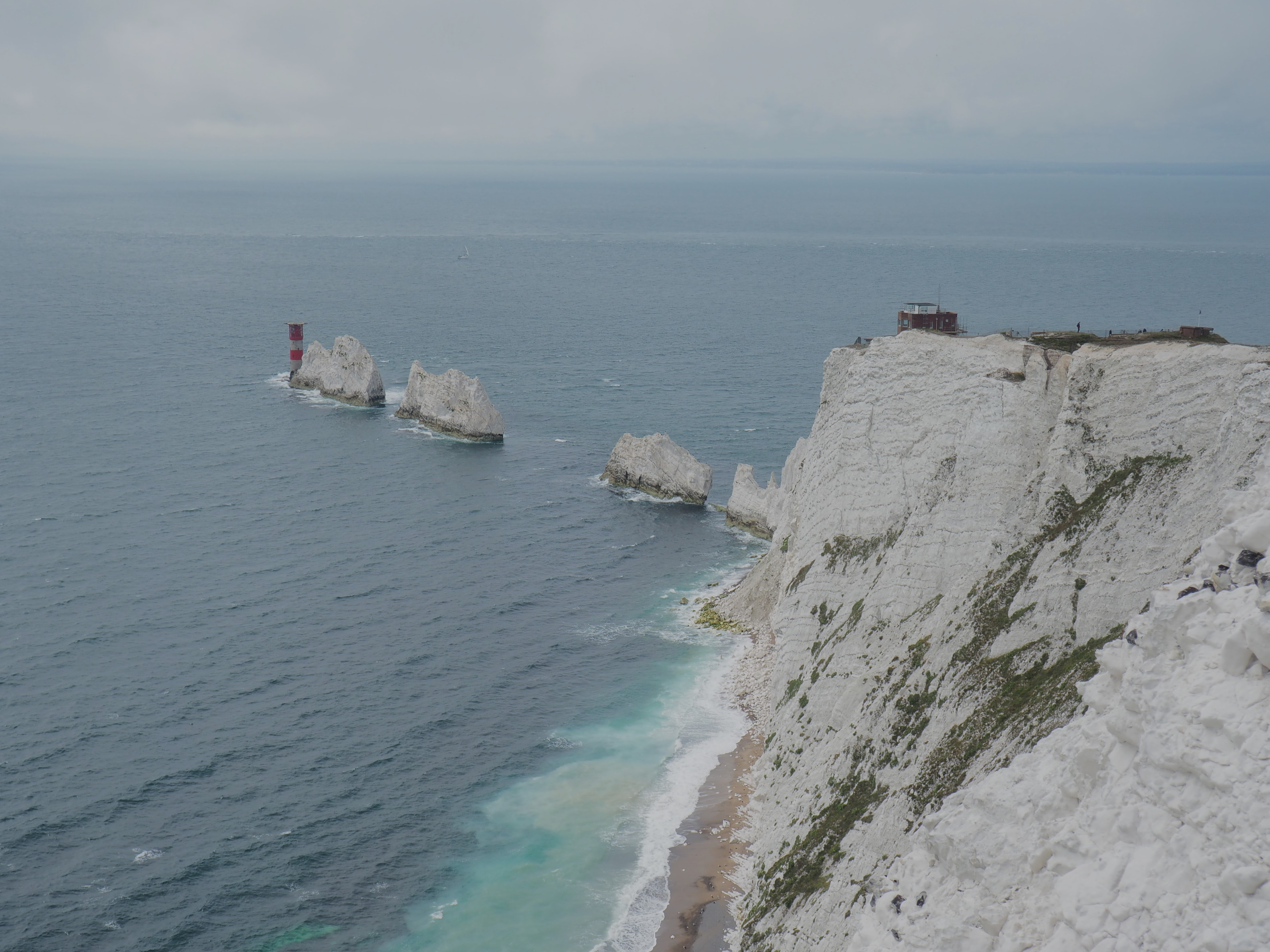 Leaving Osborne, we ate lunch at The Lunch Box in East Cowes and then set off for the Needles, a peninsula jutting into the sea with tall white chalky rocks standing perpendicular to the water at the land’s end. The site was once a battery used to defend this narrow strait between island and mainland and was used to test rockets manufactured in East Cowes. Now, it’s a National Trust tourist site with a functioning lighthouse which operates 8 hours daily with volunteers who receive calls from ships in distress off the coast.