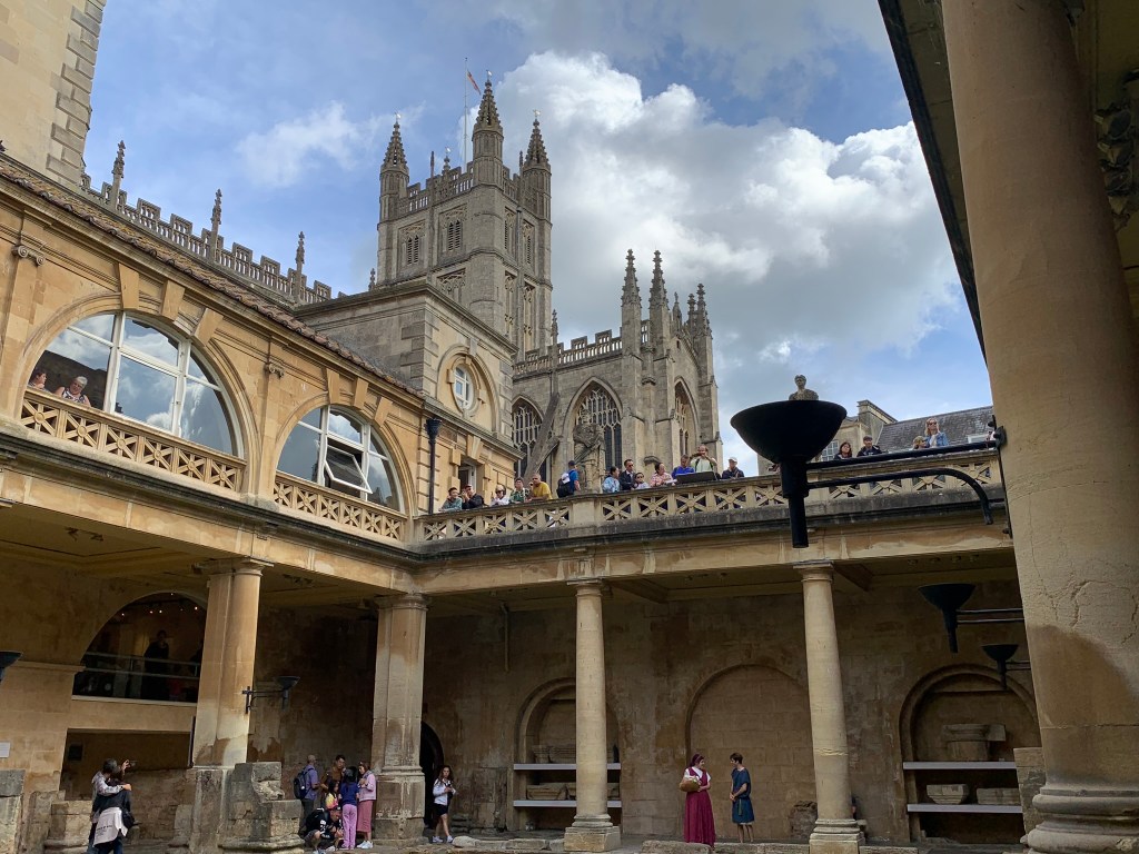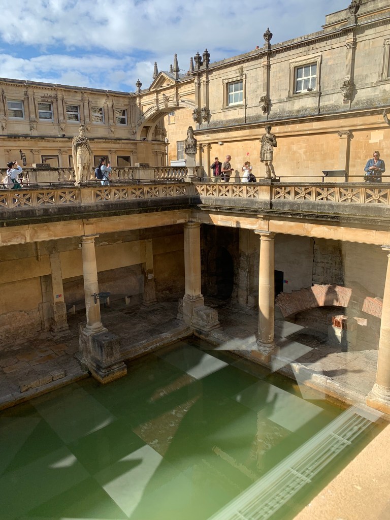 Touring the Roman baths, you begin above ground with views of the central Great Bath, where men and women would meet for socialization, business (and, well, other business) after spending time soaking, scrubbing and relaxing in the baths to the east for women and to the west for men. After viewing the site from above, you descend into and tour the east and west baths and have multiple viewpoints of the Sacred (hot) Spring, which bubbles up at 115 °F [46 °C]).
