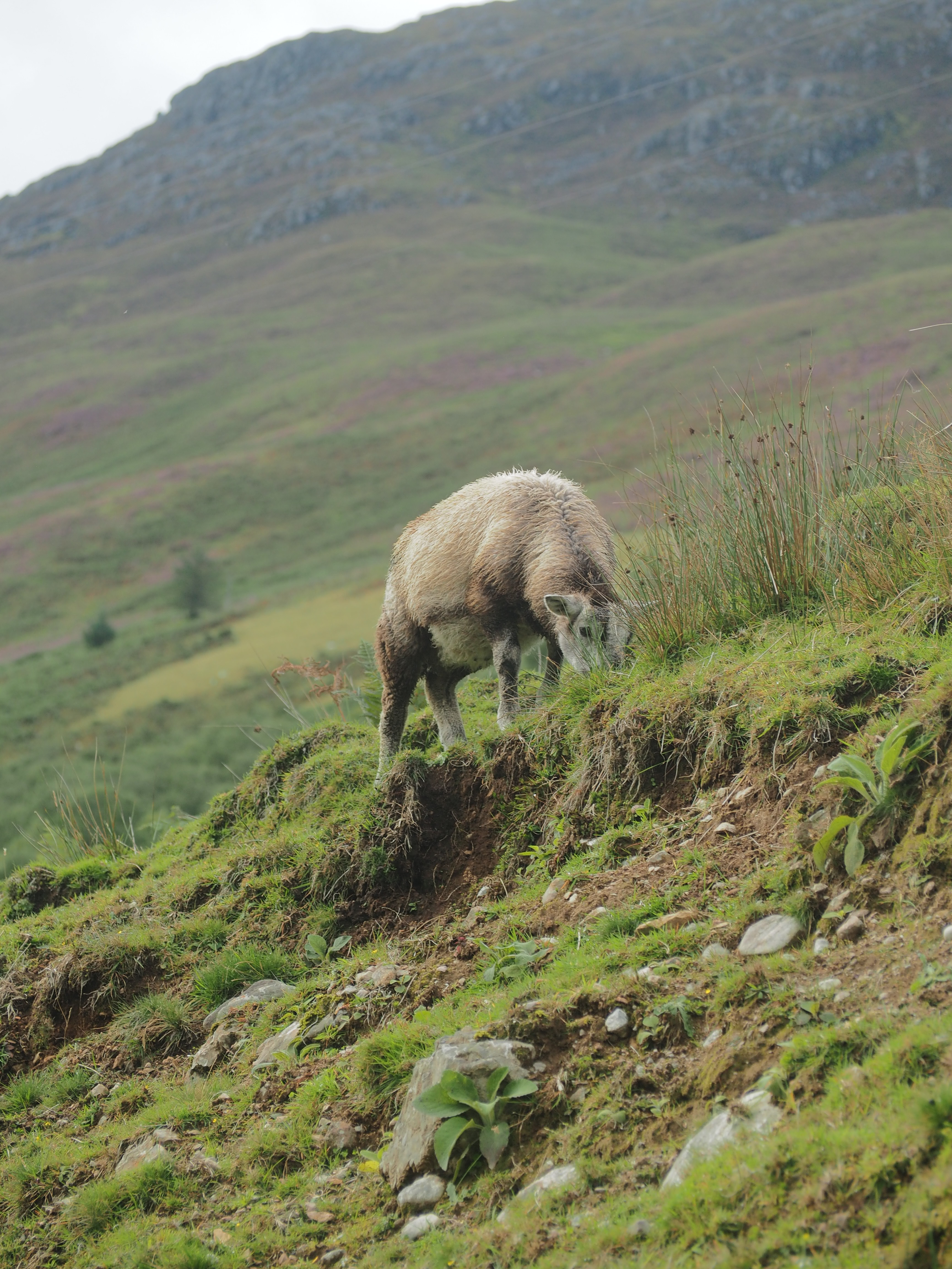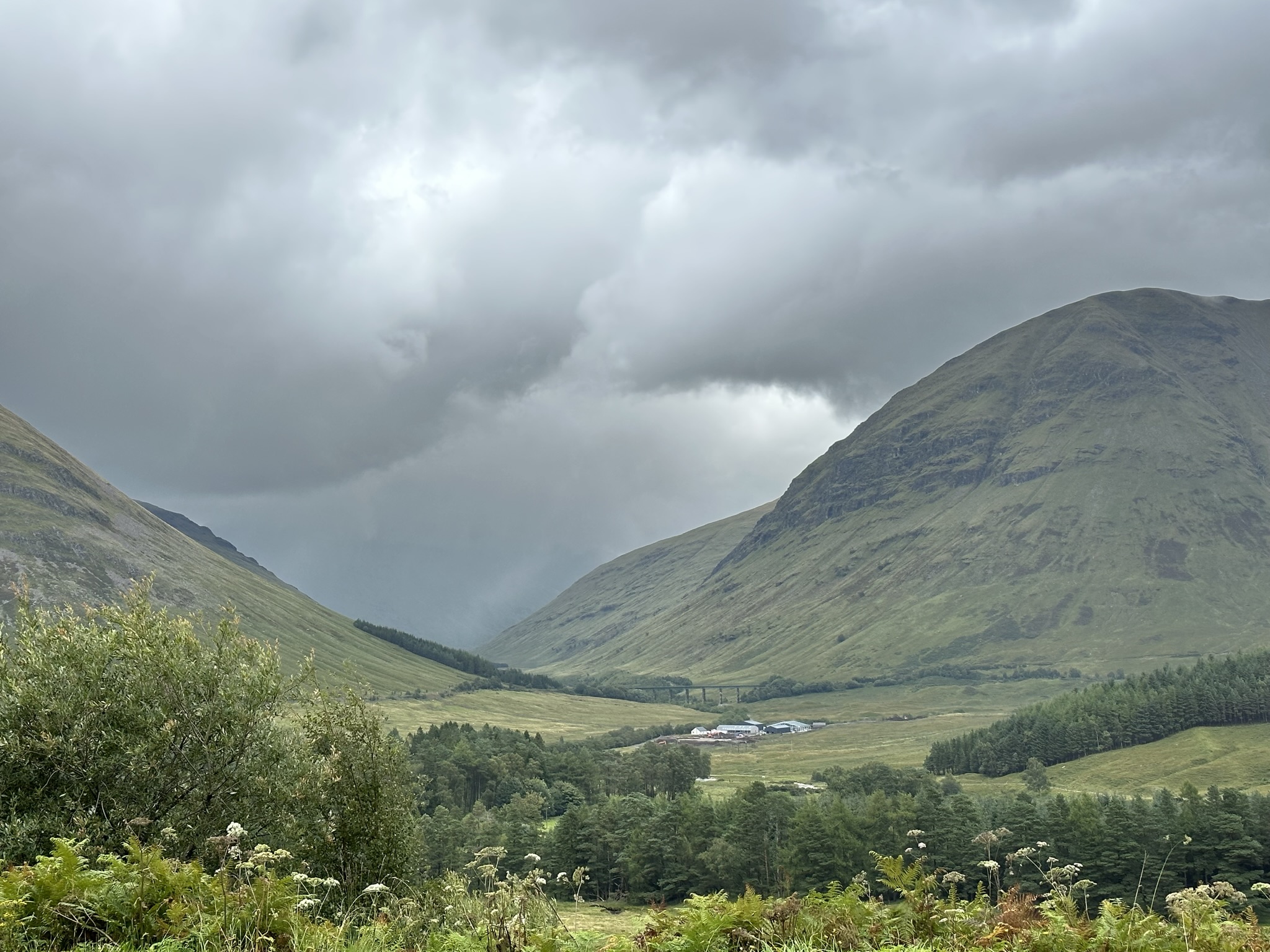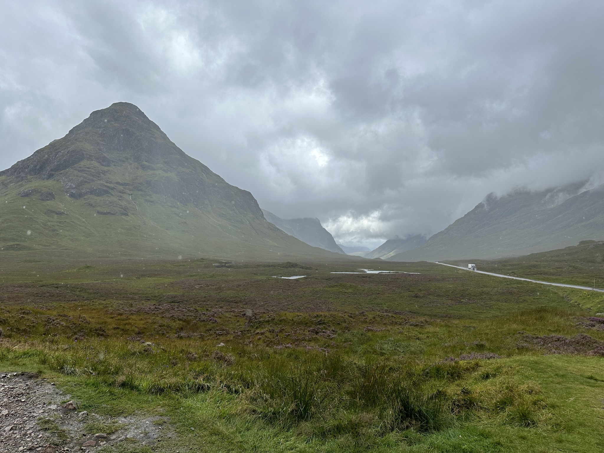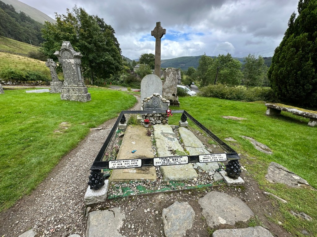 We departed Glasgow and headed north through the Loch Lomond and the Trossochs National Park. It doesn’t take too much time to get out of the city and feel like you’re in a totally different world. Looming mountains, narrow, long and deep lochs (body of water, not just a lake. Could be an inlet), lush green fields dotted with mostly purple and a sprinkling of orange and yellow flowers, grazing sheep, horses and highland cows on hillsides. We’re not in the concrete and steel of Glasgow anymore Toto. We wound through the hills, between the lochs and into little villages. We stopped off in Drymen for some fantastic sandwiches at the local bakery and visited the gravesite of Rob Roy, poet laureate of Scotland, in tiny little Balquhidder and then ascended into the highlands near Glencoe through driving rain passing through high alpine fields and between massive hilltops and mountains.