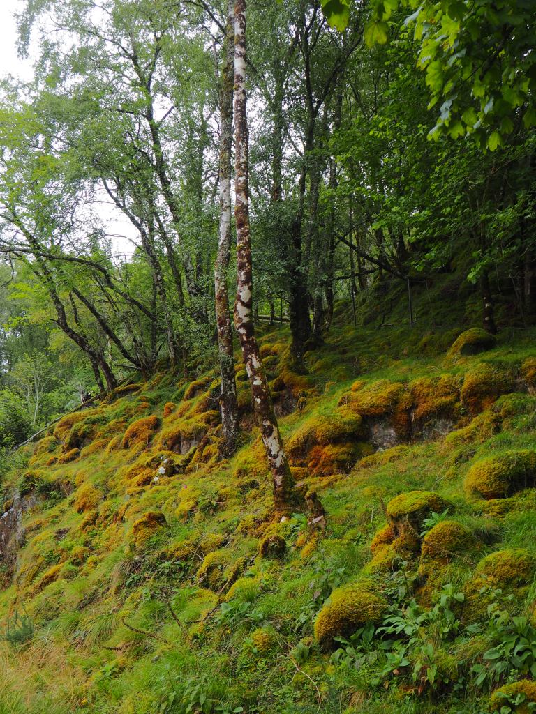 After watching boats pass through the Loch Oich swing bridge, we set south along the trail which is flat. Up the hillside, grow monstrously large rhododendron plants, lush fields of ferns and waterfalls of all sizes tumble down from above seemingly every fifty feet. Moss covered rocks line the hillsides and run down to the shores of the lake. It’s an easy walk and as long as you want to make it. There’s a parking lot right by the swing bridge that’s a good starting point.