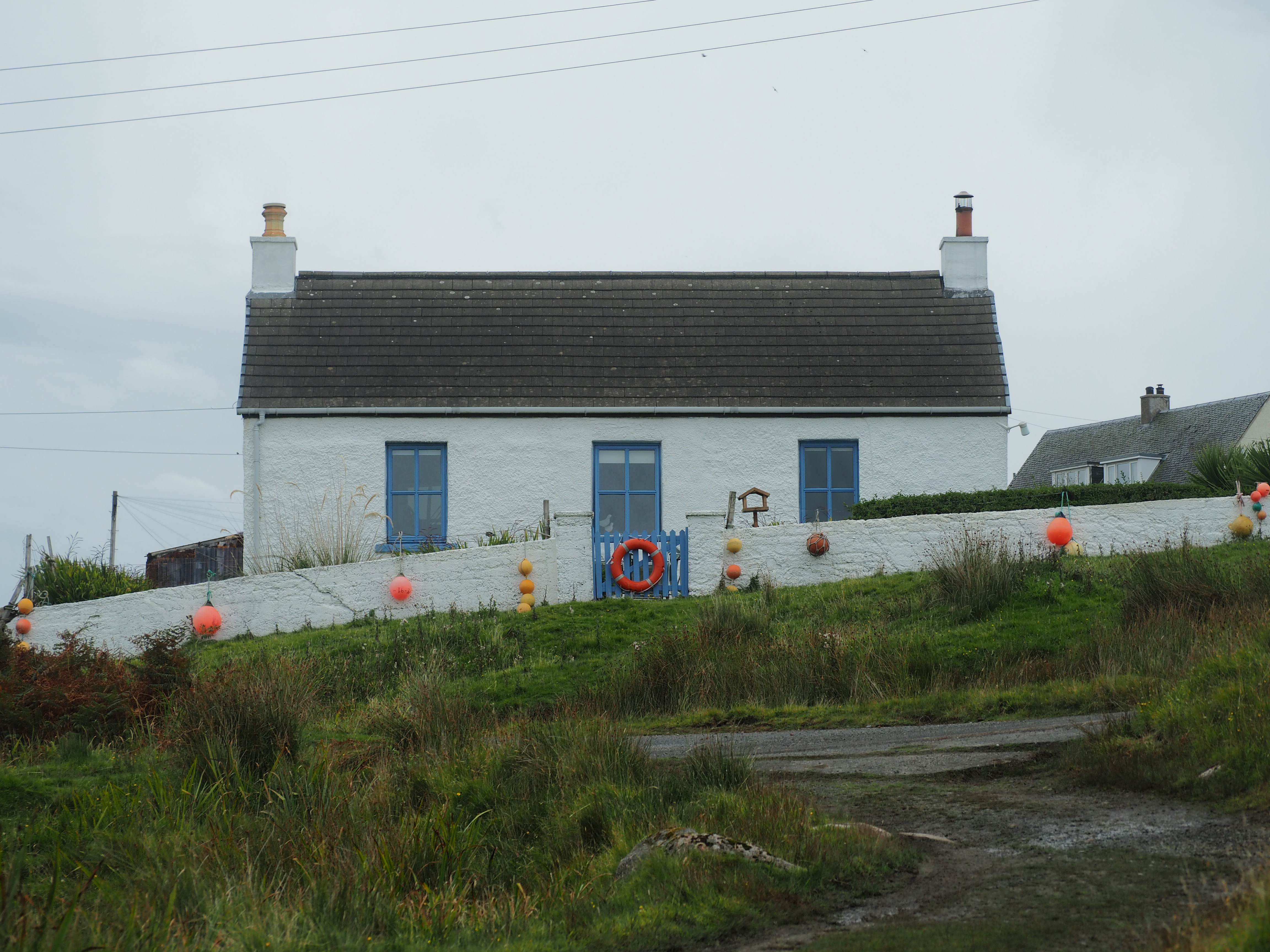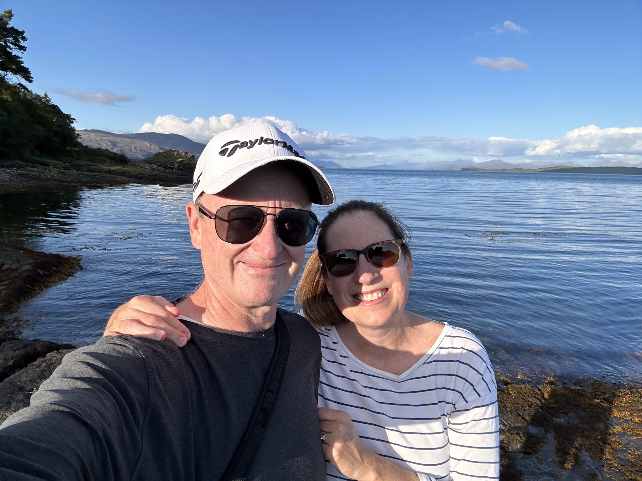 Remote Mull and Iona. We arrived at our hotel, unpacked and struck off for a walk down a dirt path past Torosay Castle to a little point on which a solitary celtic cross sits and then hit the hopping Craignure Inn pub which only got fuller and fuller (and the non-local patrons more impatient, sadly, with the lone barman who was hustling to make drinks, take food orders, change the tables for a wired-tight Brit and a pretentious Canadian who had previously placed orders but changed their seats afterwards (seriously?) and cash people out). We quaffed a couple of drinks, left a tip and marched back to our hotel to eat sandwiches we’d made for our dinner that morning with views of a beautiful sunset out our window.