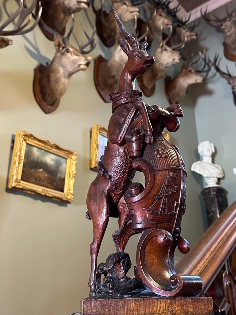 The site of the castle was long a fortress on the Isle of Arran, dating back to the Viking Age and before. During Robert the Bruce’s war for Scottish independence, he took over Arran and the castle which sat here (a portion of which makes up the current castle). When Oliver Cromwell’s parliamentarian forces overran Scotland, Arran was taken over from the Hamiltons (its owners at the time) and used it as an English fortress. The castle was returned to the Hamiltons after the war. The 12th Duke, William Hamilton, was a gambler, a horse racer, a boxer and a hunter in his day, using Brodick as a hunting and entertaining palace. He also nearly bankrupted the family forcing the sale of the castle and much of its contents. The Scottish Trust does a nice job at painting the fascinating family history without either denying or whitewashing the sources of its wealth in the colonial American days.