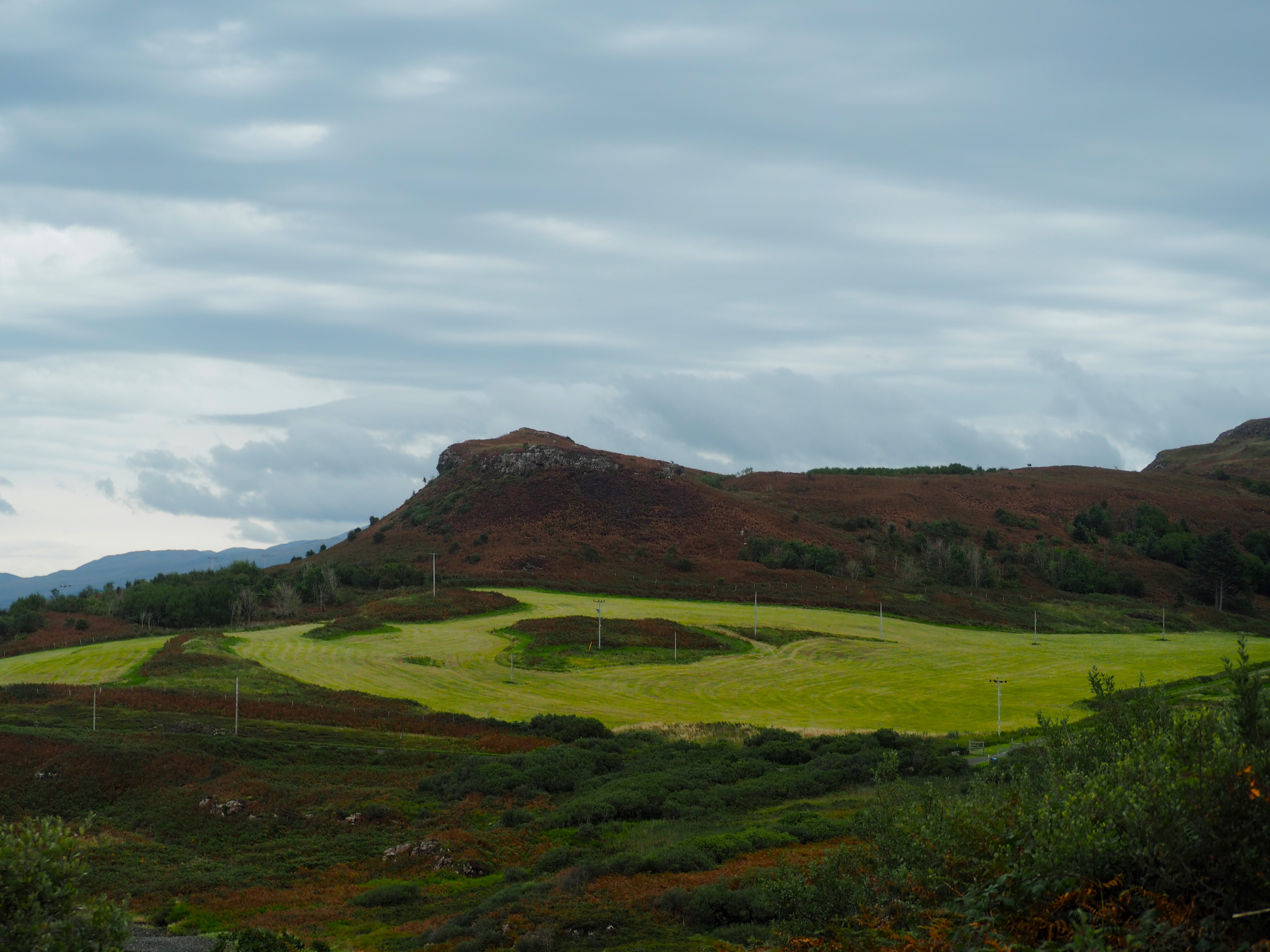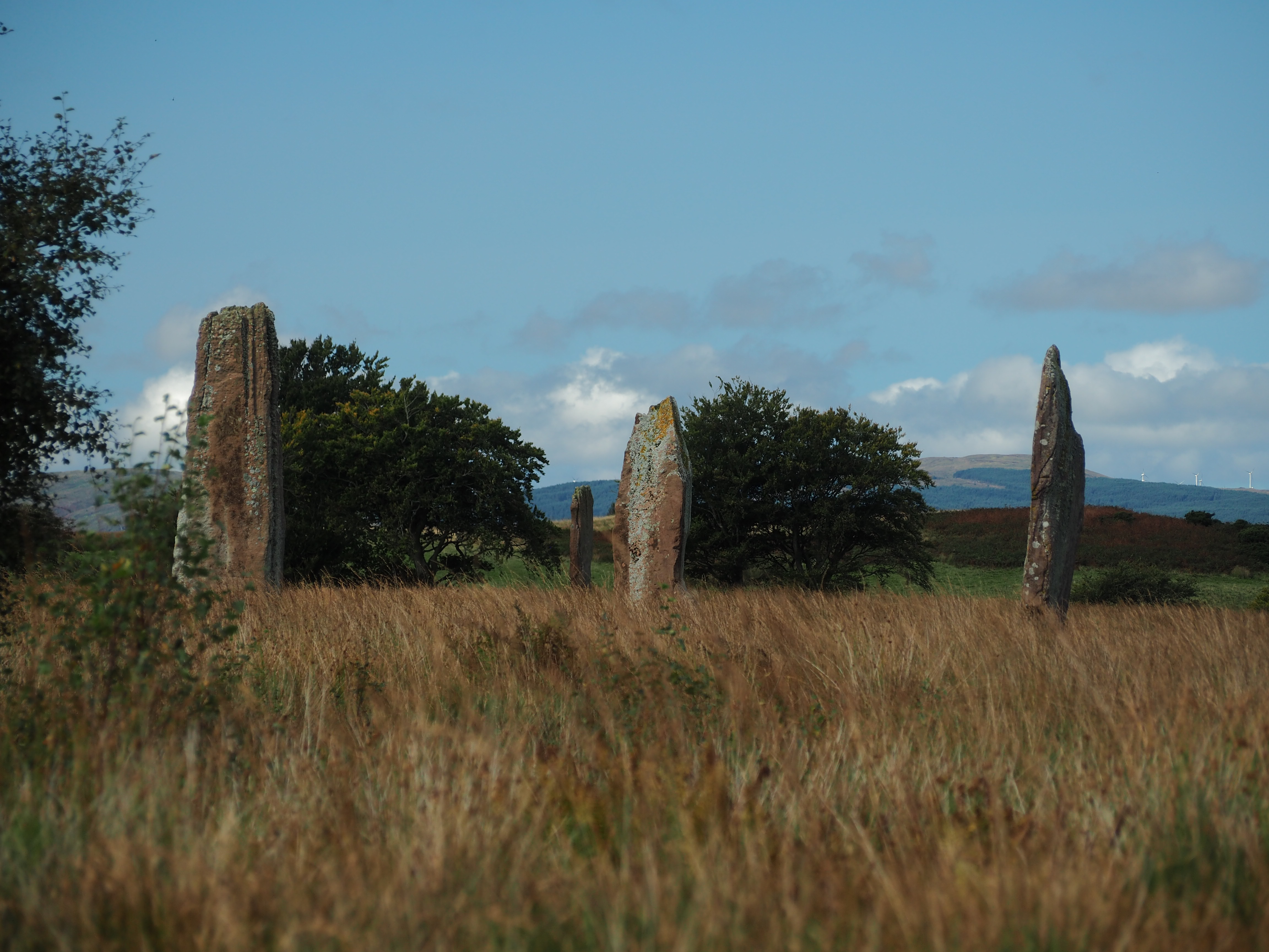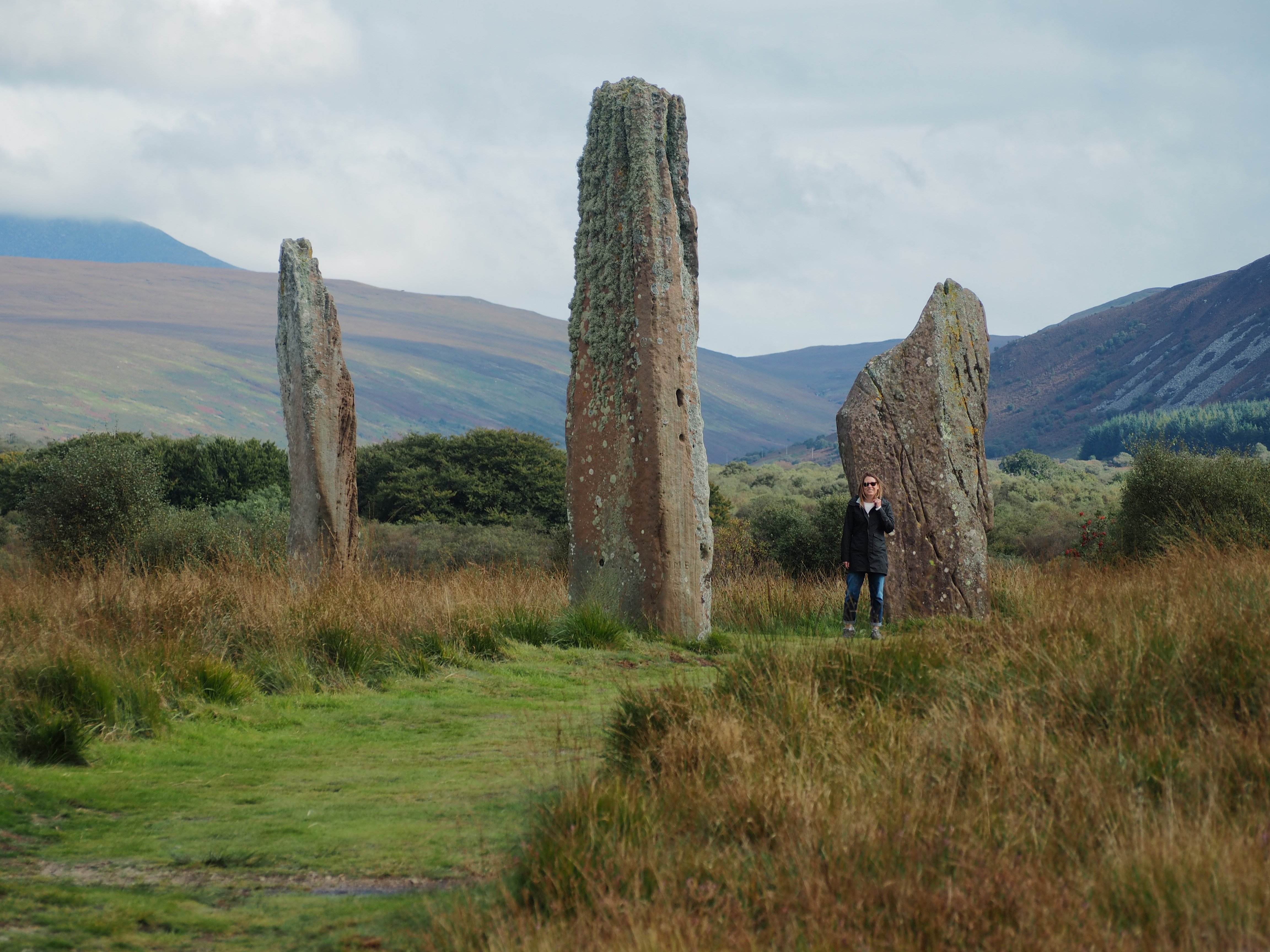 Well-fed and rested, we rose the next day ready to tour Arran. We began at the Machrie Moor standing stones, a set of six stone circles and monoliths dating to 1800 BC. Families lived here in around 2000 BC, farming barley and wheat and keeping animals like sheep. The stone circles were preceded by some wooden ones which are no longer visible. As with Stonehenge, the stones here are of different types and appear to have had some unknown special magical significance to their use. The stone circles are about 2 kilometers from the parking lot through sheep fields to the stones and we arrived early enough that we had the place to ourselves.