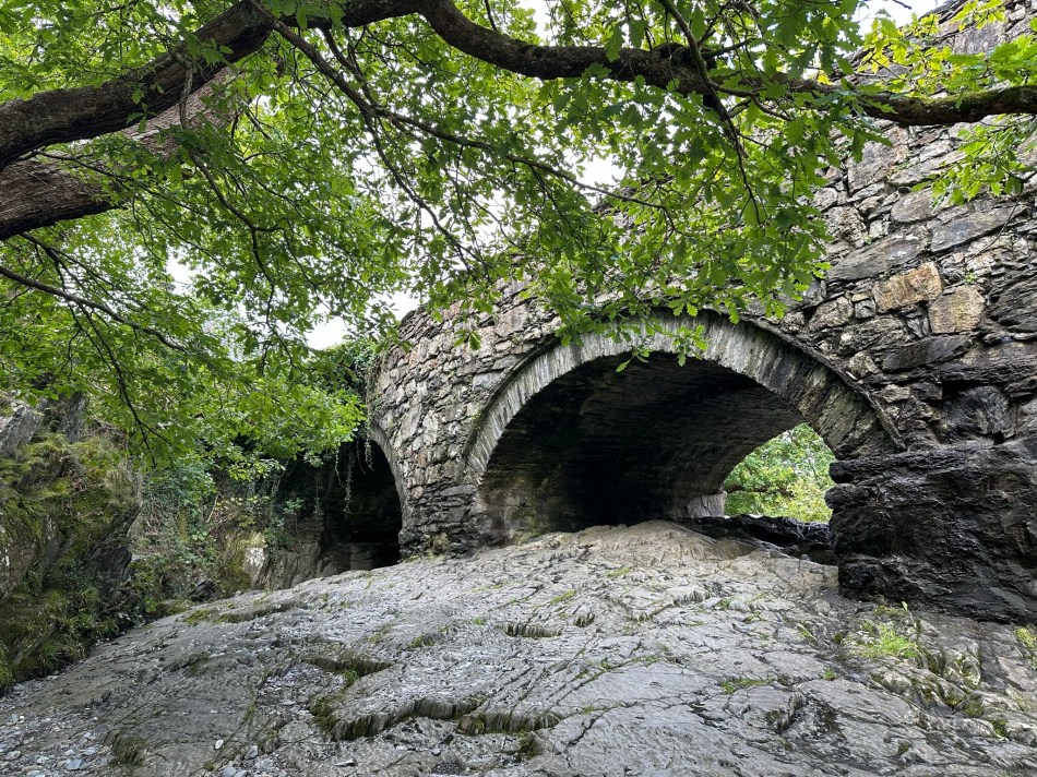 But I digress… my selected “moderate” trail was. It started off at a parking lot by a bridge and waterfall in charming Betws-y-Coed. The first bit was on a boardwalk and then through a pasture along the Llugwy river. The trail departs the riverside climbing through a field with marvelously tall Douglas Fir trees and ascends to a paved single-track road for a spell then winds back down through the forest to run cliffside above the river dropping you into the area of the falls which are peaceful and beautiful. The trail, as mapped on AllTrails, continues on to another parking lot, but I turned at the falls returning to the town and caught up with an amazing grey heron (I think) wading in the churning waters of the falls under the Pont-y-Pair bridge.