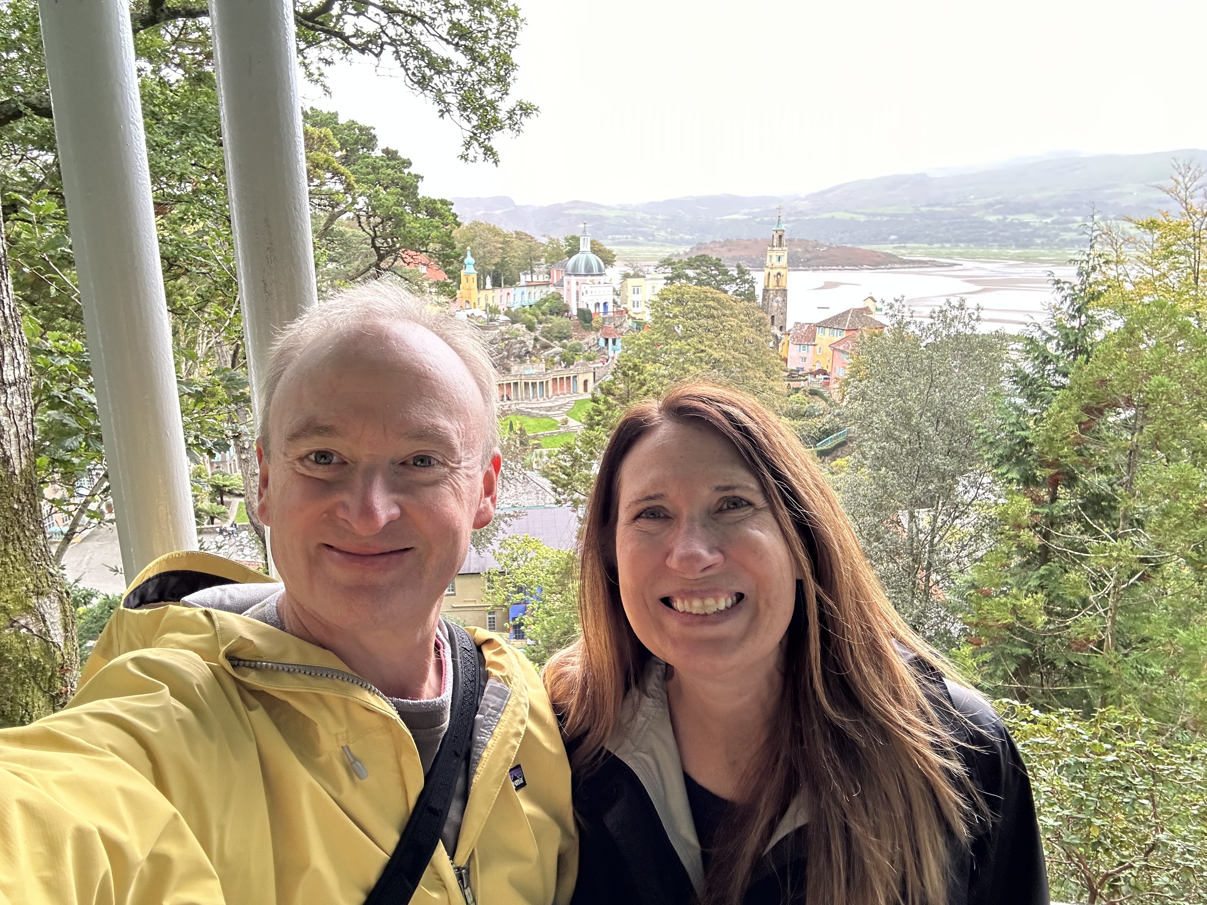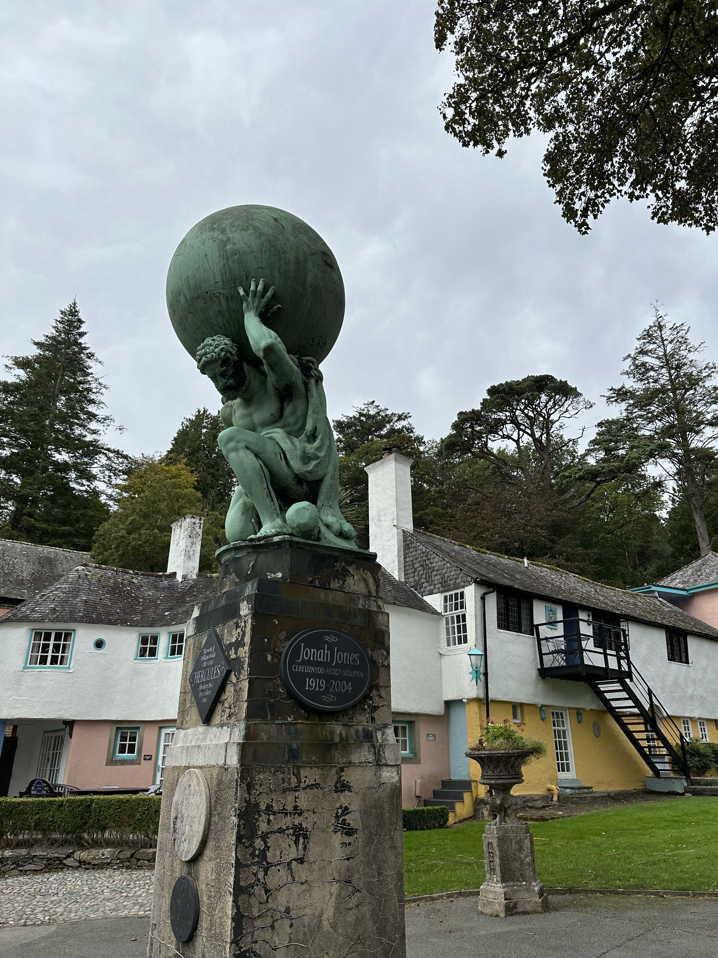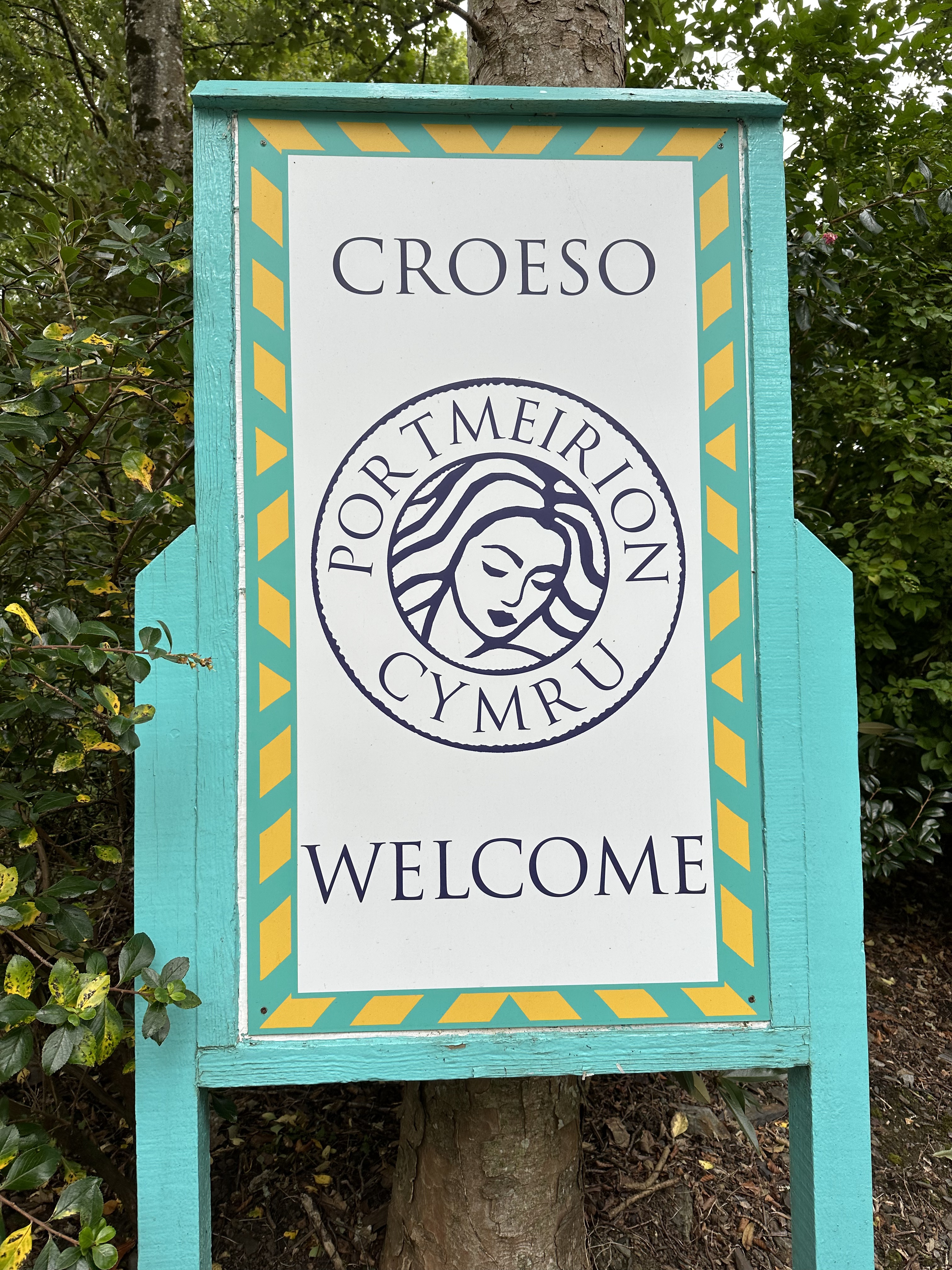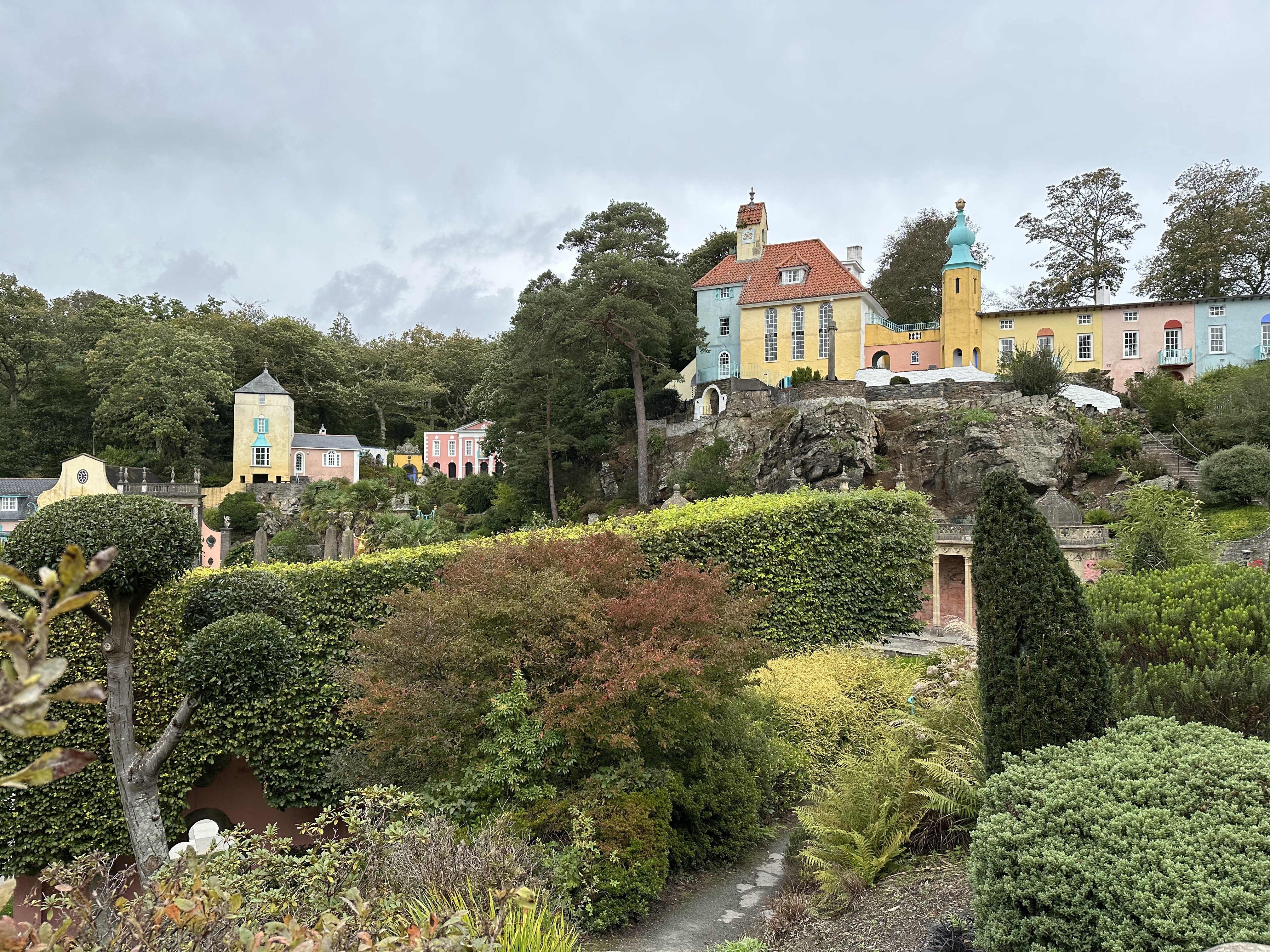 Portmeirion. On our way south, we stopped in Portmeirion. I’d seen pictures of it, and my barber the day before recommended it as a stop. I’d imagined a mix of Portofino-like cafes and Sintra’s Pena Palace-like buildings. We googled to try to find a place to eat and the results list was odd. We parked in the free lot and paid the substantial admission fee to enter the town a little head-scratched.