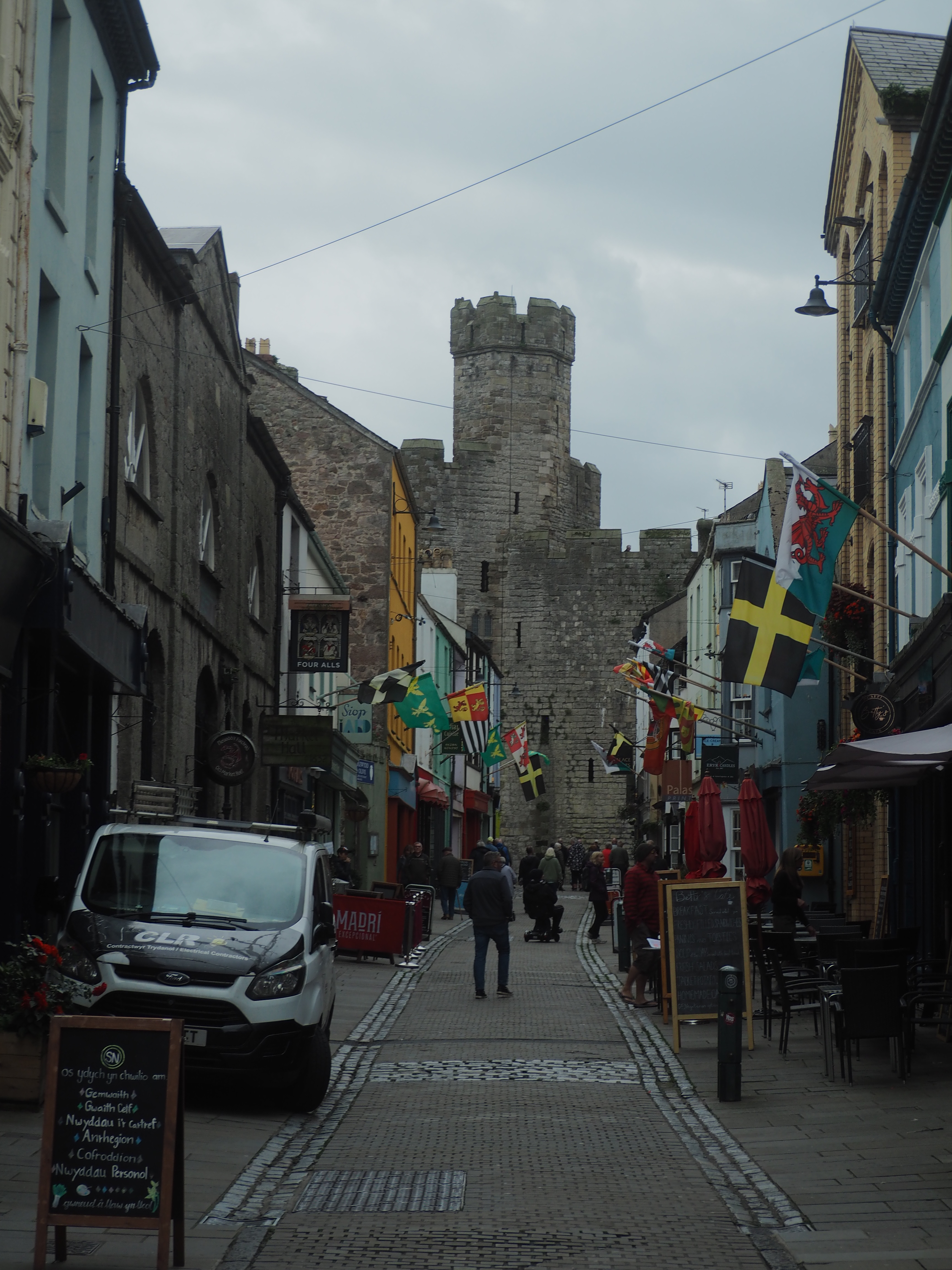 Caernarfon Castle. Before departing for the UK, we learned on an episode of Dan Jones’ Secrets of Great British Castles that Caernarfon is where the title “Prince of Wales”, given to the first-born son of the monarchs of England originated. We thought, well, we’ll be right there, we ought to go check that out. Allegedly, Edward I (the same Edward who fought the Scots at Stirling in their war for independence) “promised the Welsh that he would name ‘a prince born in Wales, who did not speak a word of English’ as Prince of Wales”. When his wife, Eleanor, a Castilian from Spain who was instrumental in the design and construction of the castle at Caernarfon (hence its three-towered Castilian-looking “Eagle tower”), was pregnant with their 14th (yes, 14th) child, Edward summoned her to come to Caernarfon to give birth here. Many of the 14 children had not survived and when Edward II (the eventual heir) was born at Caernarfon only one male heir remained (he died shortly after Edward II’s birth). Edward’s birth was a relief to the royal couple, and as newborn Edward the heir, who was born on Welsh soil and spoke no English being fresh from the womb, was proclaimed the “Prince of Wales”, the trick was complete (the Welsh would get their day in the sun in the games of one-ups-manship, however, when Henry VIII’s Tudors of Welsh descent came to the English throne).