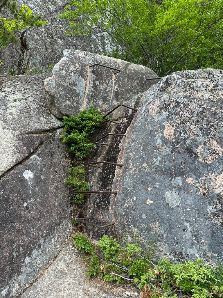 I arrived at the parking lot to find it moderately full on a cool, cloudy, breezy mid-June day, which felt more like late April or early May, and set off. I hadn’t taken the time to read about the loop trail and this loop started with a trail called the Dorr Mountain ladder. That should have tipped me off, but I seem to get dumber every year. Ladder and stairs, I guess. It goes straight up. I mean straight up. It gave me a sense of how ominous the task was to lug and position the stones which make up the stairway and a sense of awe for those who did so.