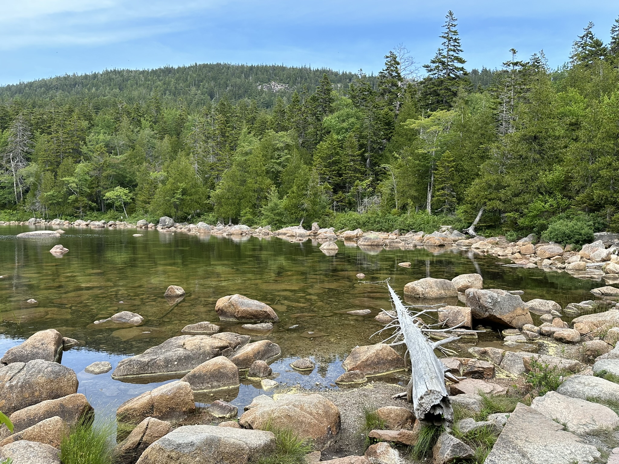 Jordan Pond. A much easier hike is the loop around Jordan Pond. This hike and area is VERY popular. We arrived around 10:15am on a Tuesday (albeit in mid-June) and there was not a parking space to be found and a lot of aggressive position jockeying taking place in the relatively small public lots which provide access. Not to be deterred, we reversed our planned sequence of events headed to Bar Harbor for an early lunch and came back after 3pm.