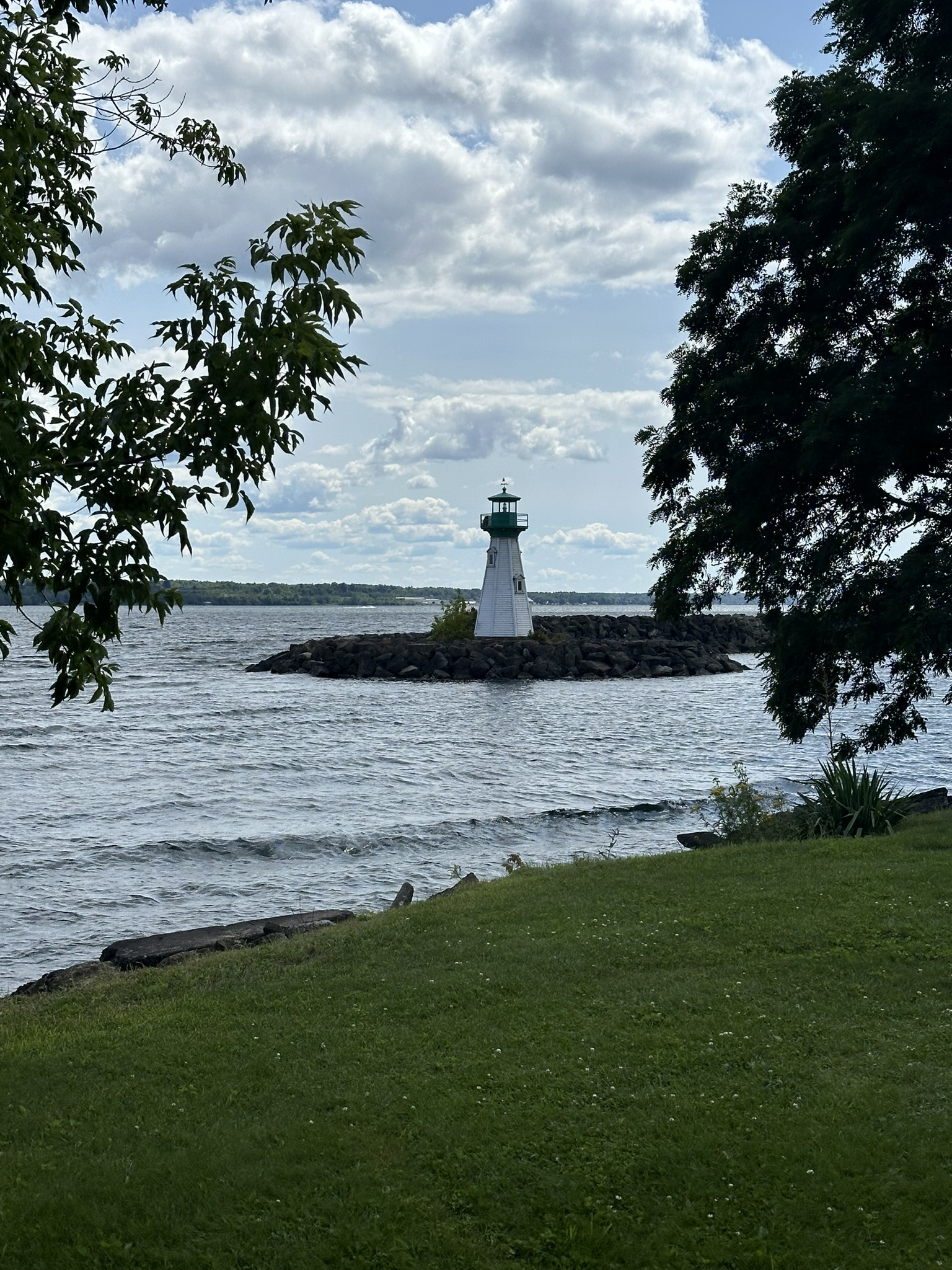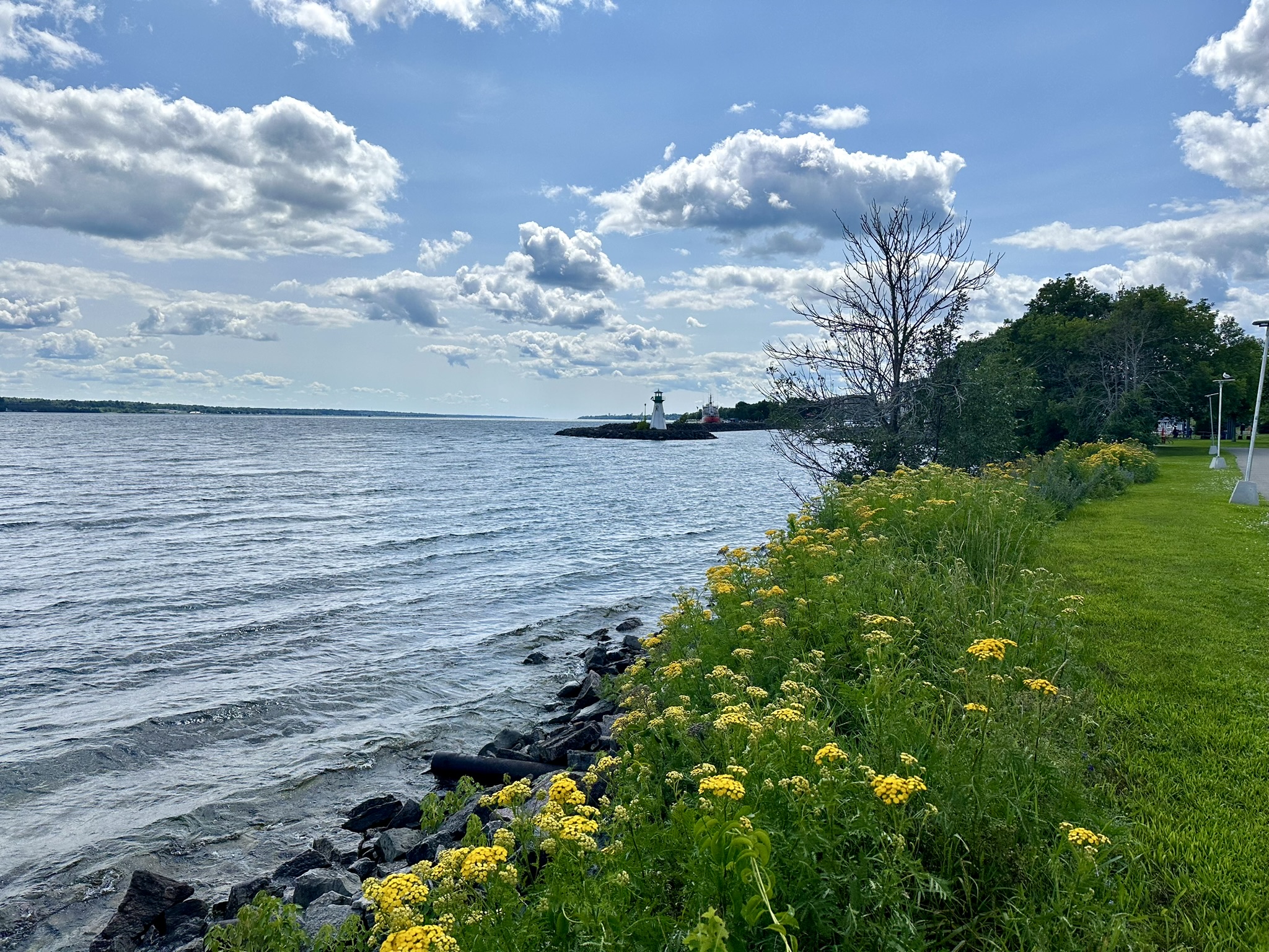 Back to the St. Lawrence. We returned to the banks of the St. Lawrence River and pulled off the highway to stretch our legs, and kill some time, as we would arrive at our destination before we could check in, at Prescott. It’s a cute little river town across from Ogdensburg, New York. We walked along their River Walk for the better part of an hour before resuming our drive west. Prescott also offers a summertime Shakespeare Festival, if thou doth like such things.
