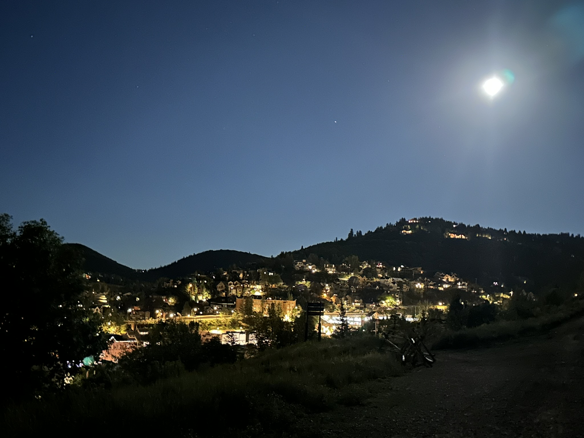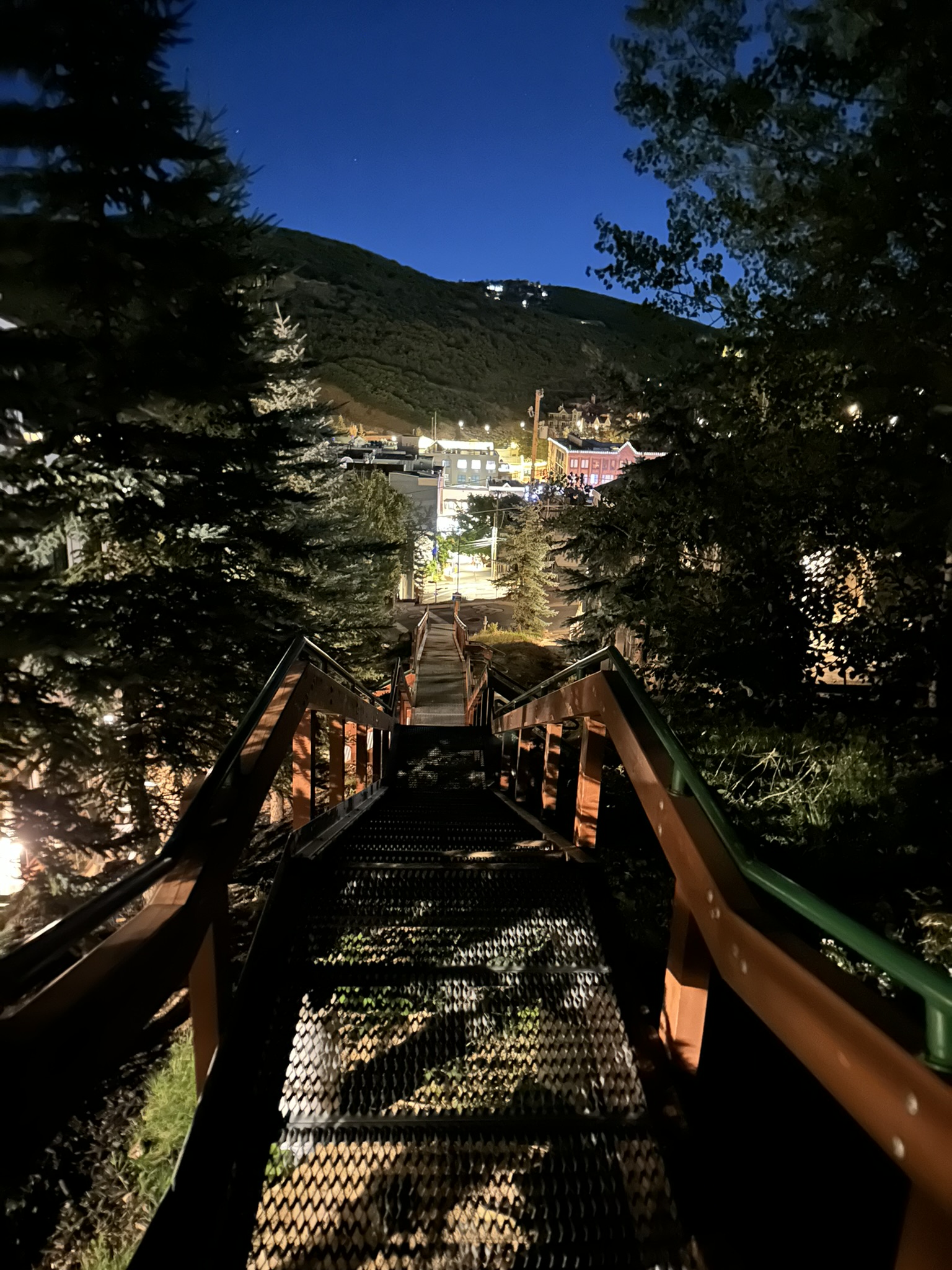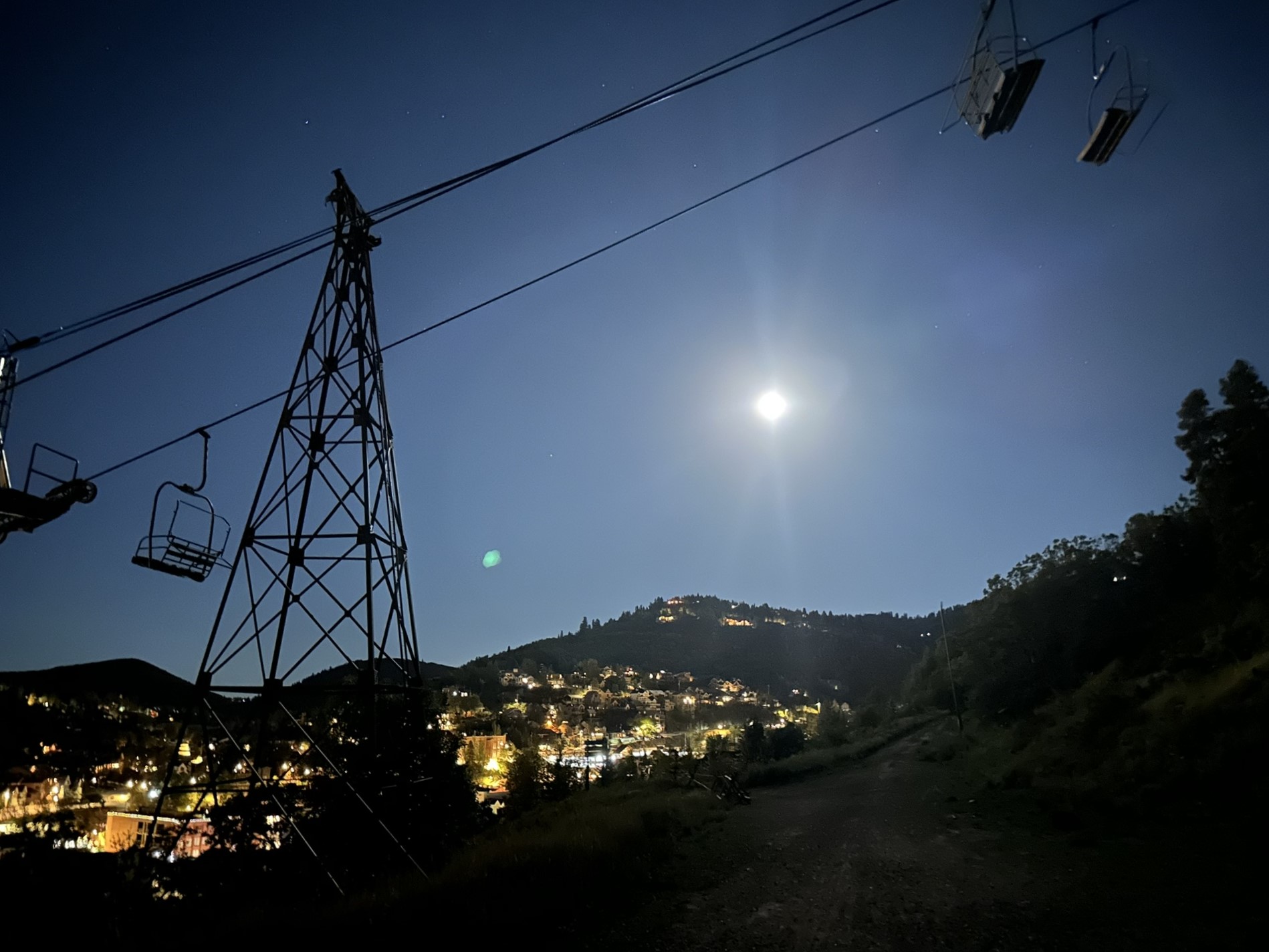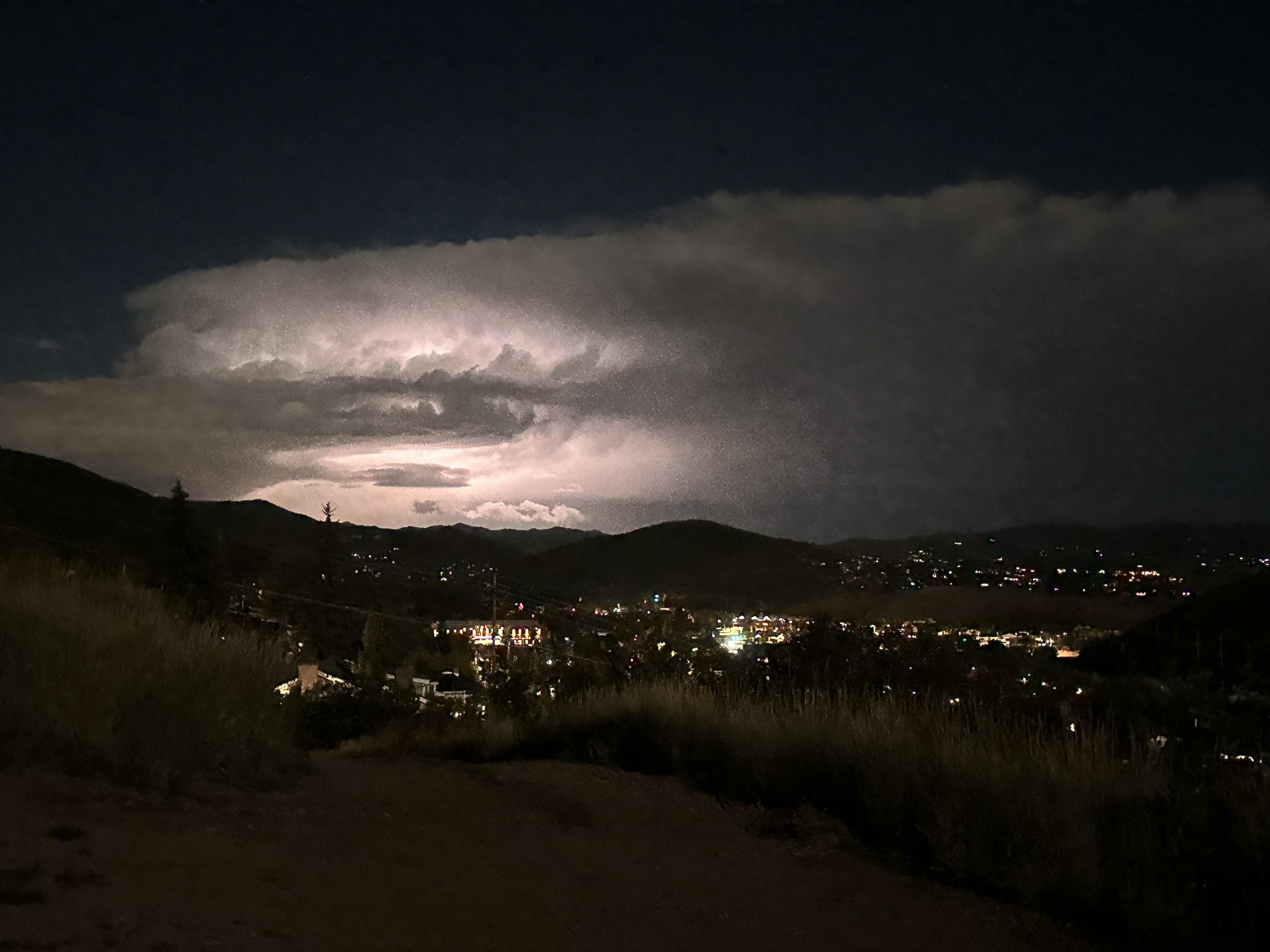 In addition to strolling Main Street, we ate out at our go-to: Fletchers. While we’ve eaten at several of Park City’s restaurants, we are by-far no experts. However, this place is our favorite. And as a blue moon rose over the town and a lightning storm raged to the northwest, I climbed several of Park City’s metal stairways to take in the beauty of nature at work.