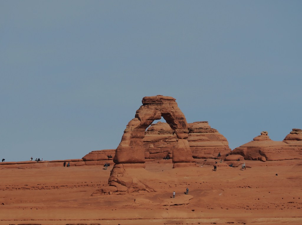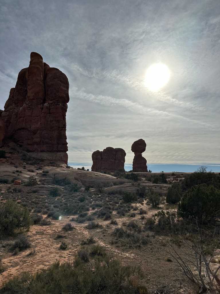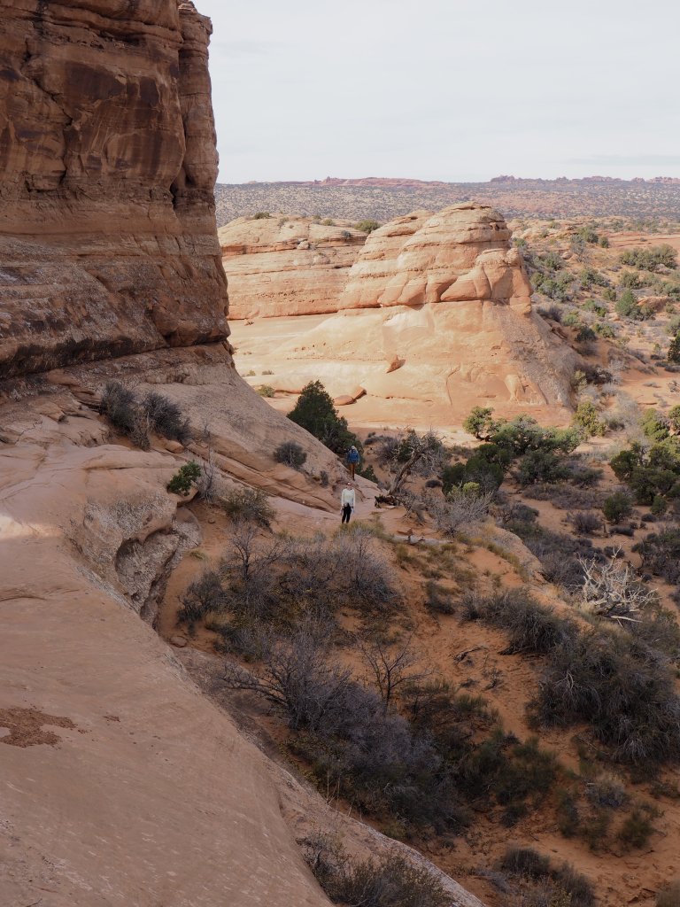 For our visit, we bee-lined past several overlooks and viewpoints for the Delicate Arch trail. Delicate Arch has been featured on a US postage stamp and on Utah state license plates, so it may look familiar. There are two ways to see it, one is to take the 3-mile round trip, mostly uphill on the way-out trail along a sandy path and across smooth rock, or the also mostly uphill but significantly shorter viewpoint trail. Despite seeing the arch with our own eyes, we were told by a fellow hiker that the arch had collapsed. Not only our eyesight but the internet can attest that it still stands (the arch that collapsed, most recently, in August of 2024 was actually Double Arch in the Glen Canyon area), though there are several questionably sourced internet stories which will tell you that Delicate fell.