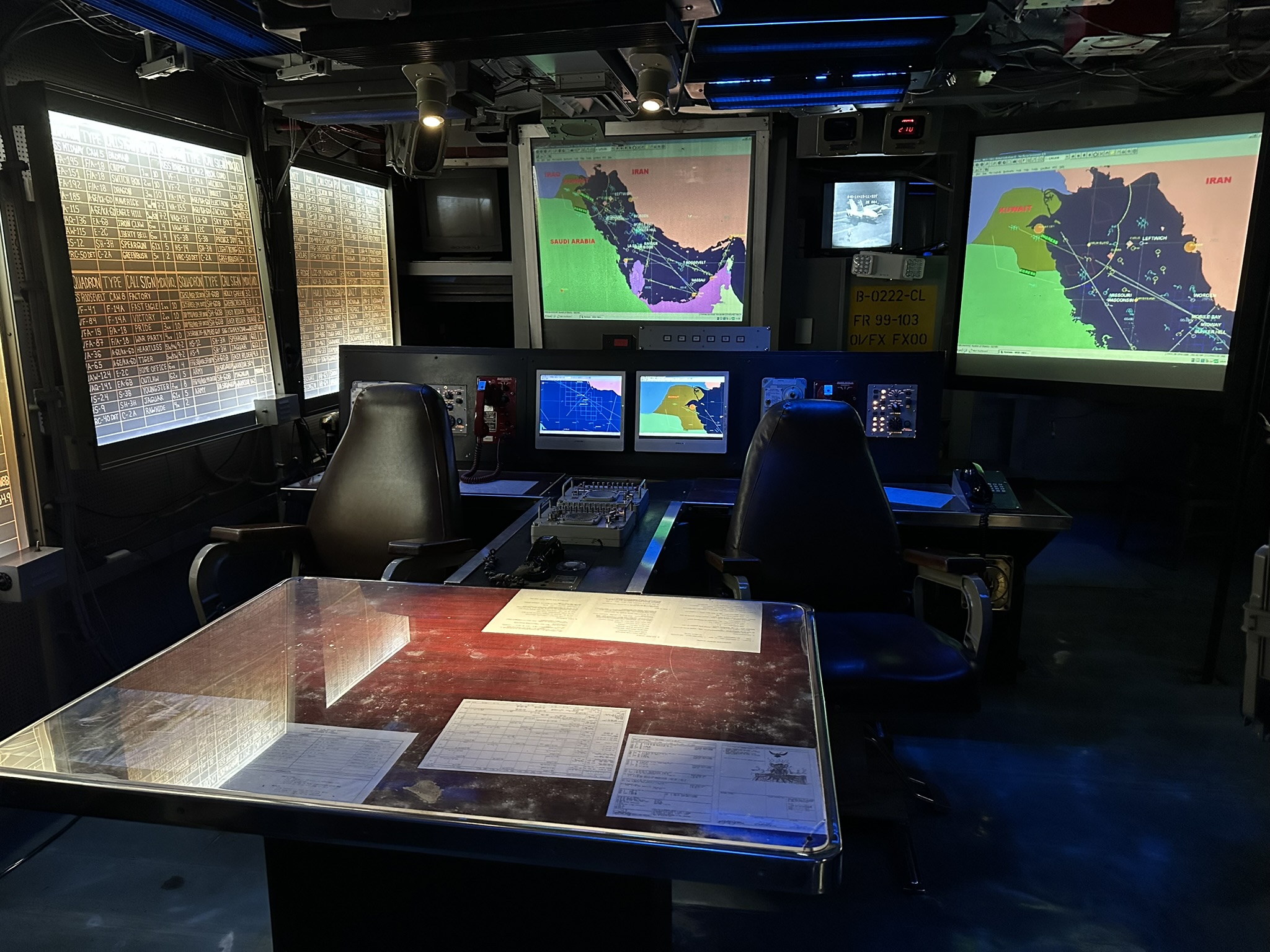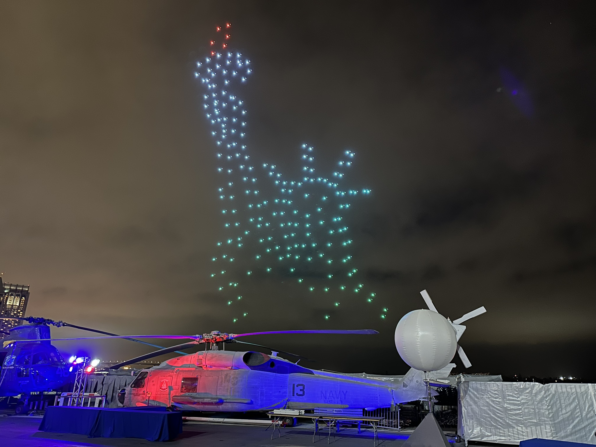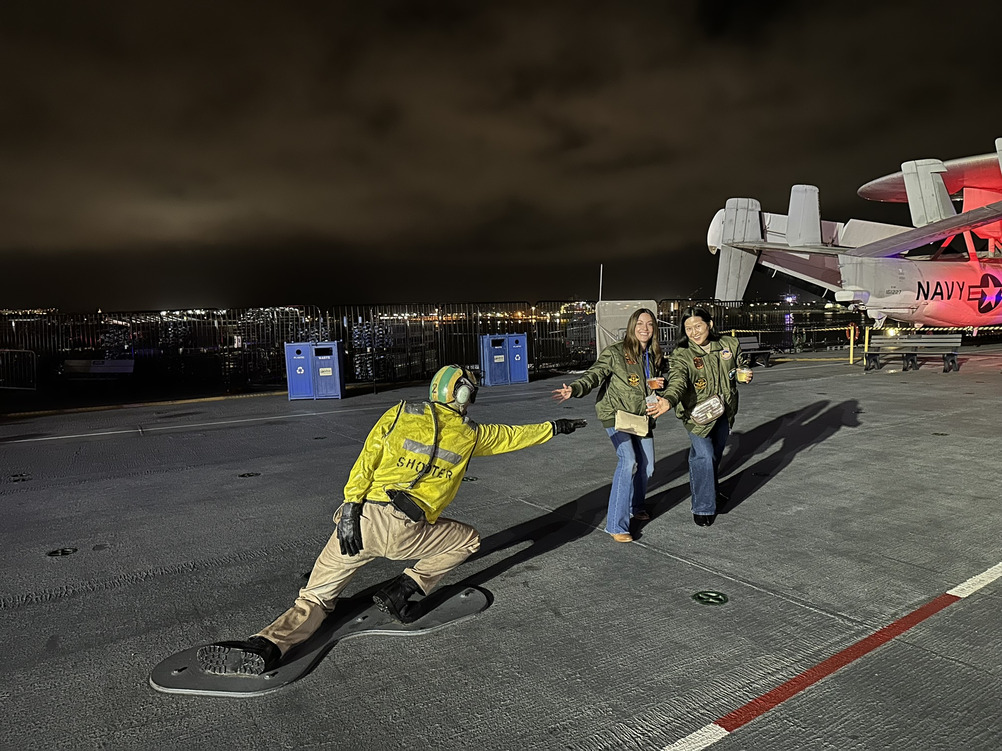 Our night on the Midway included the wearing of souvenir bomber jackets (a necessary amenity in the cold winds of a February night on deck), a tour of the Admiral and Captain’s quarters and rooms from which Desert Storm was planned and overseen, a delicious mashed potato bar, a drone show and dancing to the diverse sounds of Liquid Blue, a local band procured for the event.