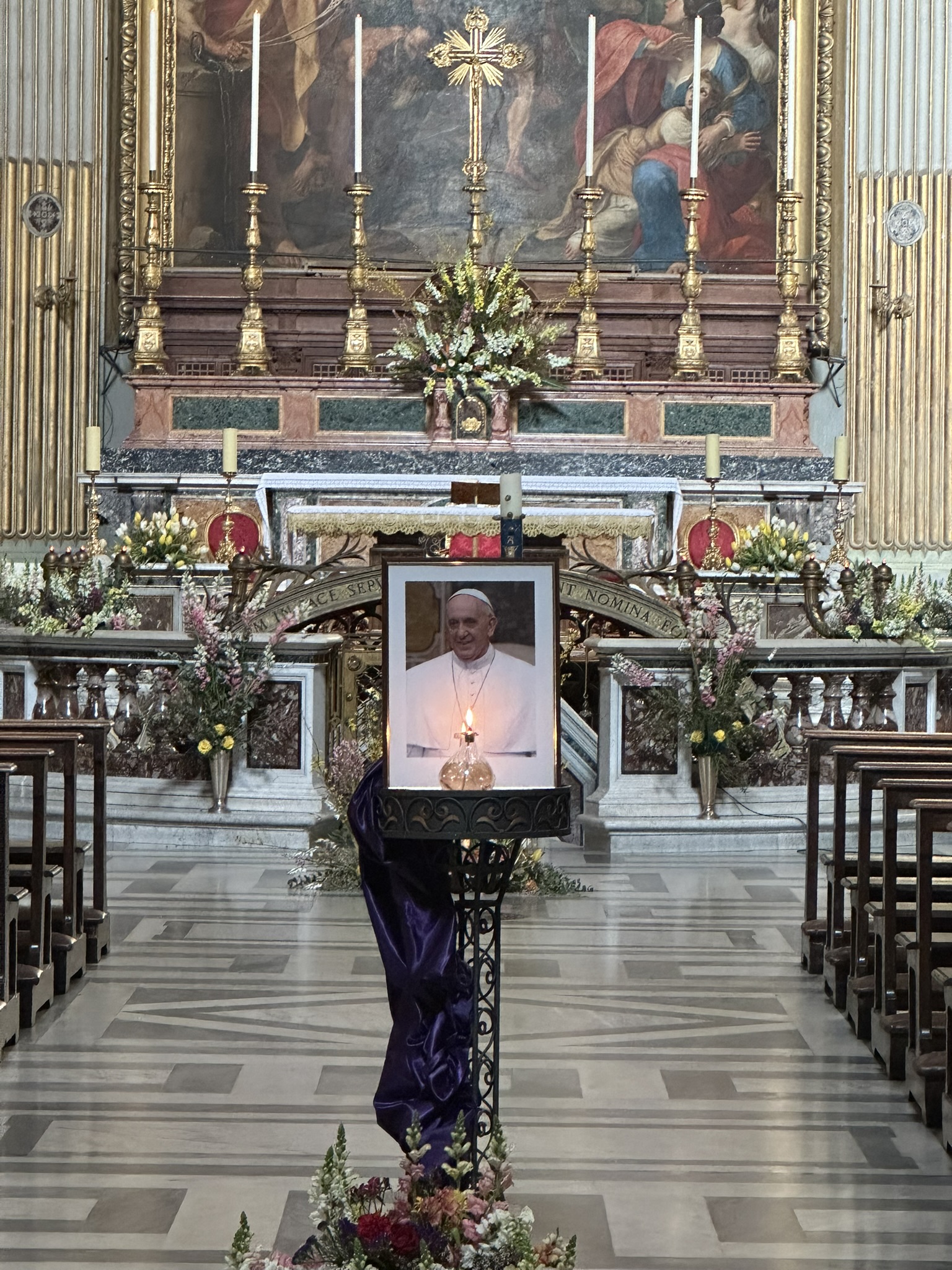 And as we’d arrived in the wake of Easter during a Jubilee year (the every 25 year-celebration when Catholic pilgrims flock to Rome to pray, reflect and seek penance) and the death of Pope Francis and on the cusp of his funeral and the Conclave gathering to elect a new Pope, reminders of Francis were everywhere. We visited Vatican City to experience the scene, skipping the five-hour wait to view his body, but were washed over with the sentiment and feeling not only of mourning but of celebration of his life. And whether it was in the airport or the small quiet solitude of the Chiesa Santi Apostoli, remembrances of Francis were everywhere.