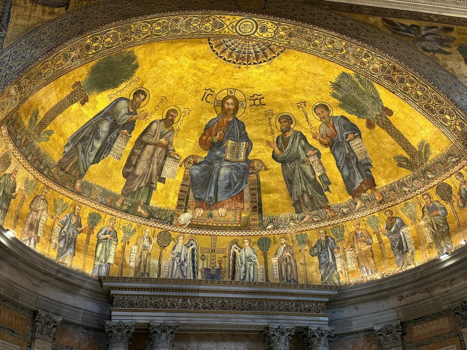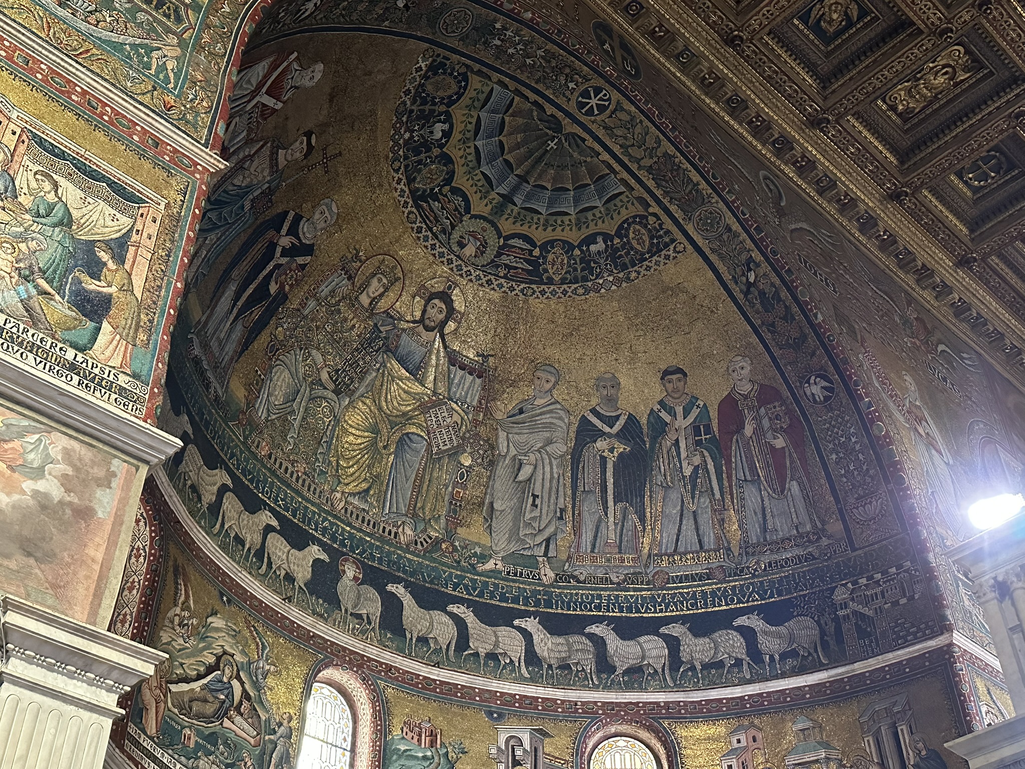 The exterior portico is decorated with early Christian symbols from the catacombs of Rome and in the mosaic behind the main chapel Mary sits prominently at Jesus’ side in between the first two Popes with sheep representing Jesus and the apostles at their feet.
