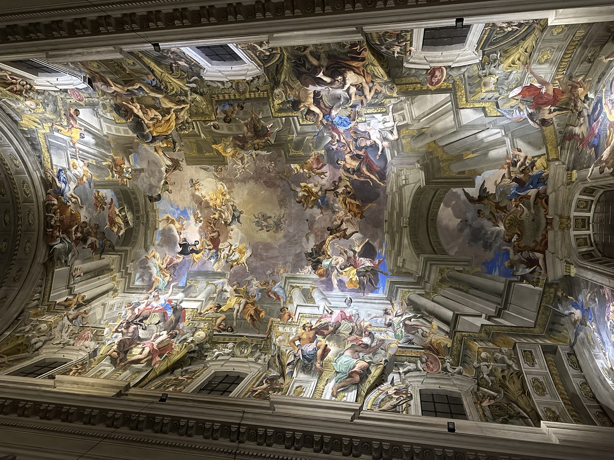 We came for the ceilings. Our guide of the Catacombs told us that the oil painted ceilings by Andrea Pozzo, a Jesuit lay brother, were worth seeing. While it is free to visit, long queues wrapped around the church for a viewing during the day, but after dinner, in the quiet of night when the church is open until midnight for viewing, we returned to take them in.