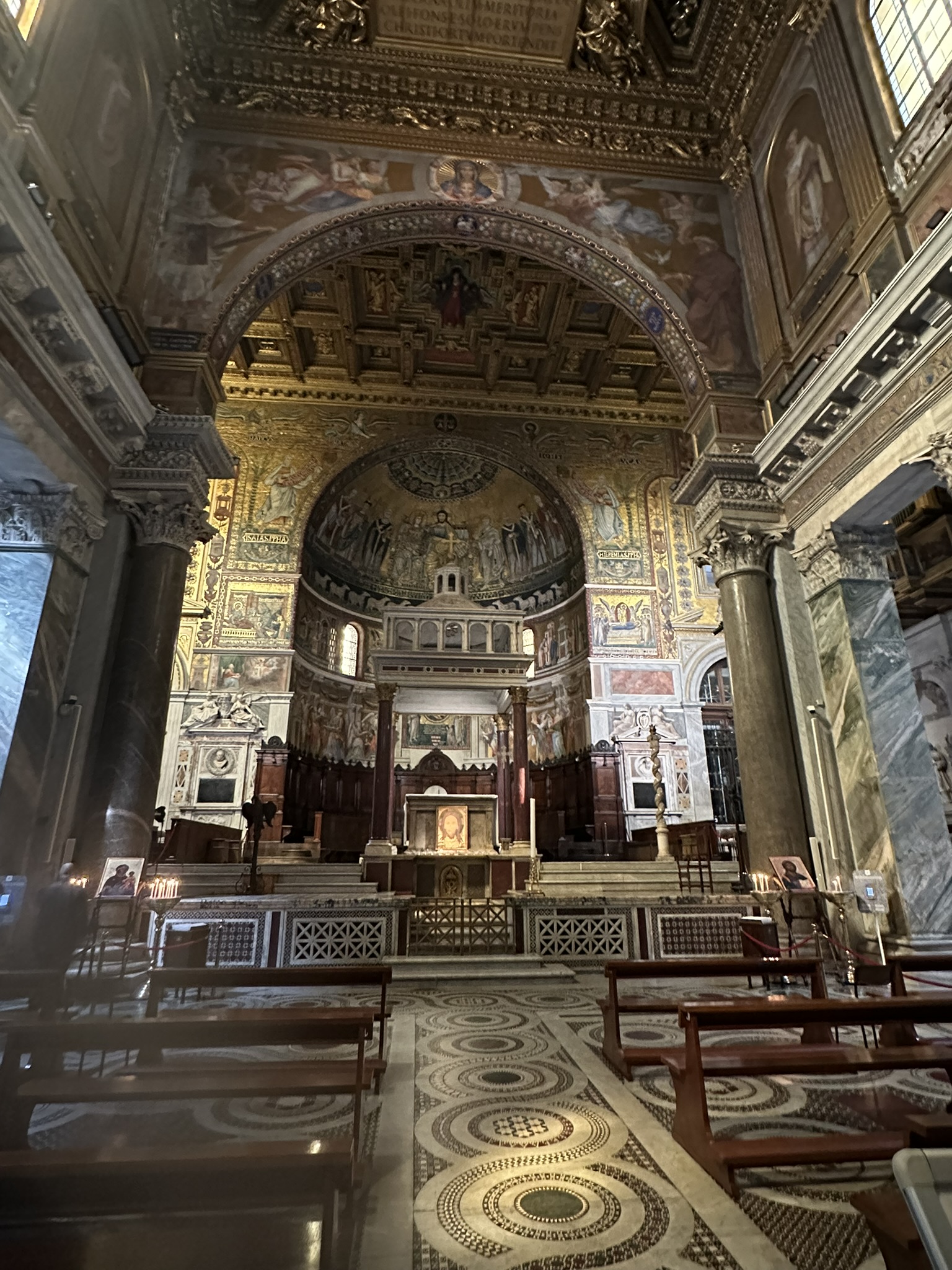 Basilica of Santa Maria in Trastevere. When we were here three years ago, we discovered Trastevere using the Rick Steves’ audio tour of the neighborhood, and on that day, the church was closed. This time, it was not. The current church was built starting in 340 AD and it claims to be the first Roman church dedicated to Mary, mother of Jesus.