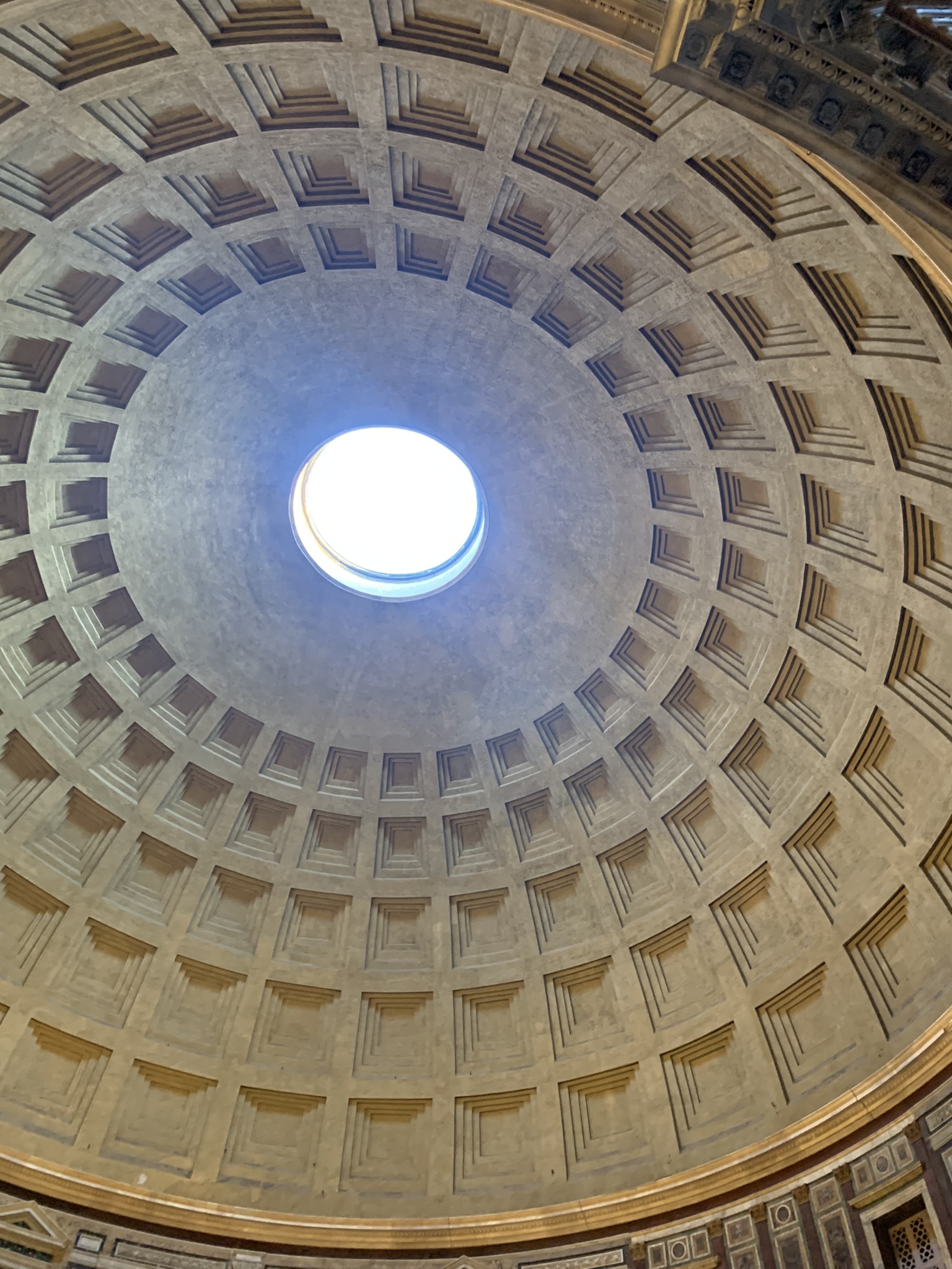 The Pantheon. This is our favorite site of ancient Rome in the city. Just to step inside brings a kind of solace and serenity from the madness of the world. The original Pantheon was built by Agrippa in 27 BC, but it was replaced by this one in 120 AD by the Emperor Hadrian. It is constructed of brick and concrete and is as tall as it is wide. The thickness of the walls are part of the engineering mystique of the place. At the top, the walls are narrower (5 feet wide) and lighter than at the base where they are 20 feet wide, enabling them to create a self-supporting structure. The dome of the Pantheon was the model for the dome of the cathedral in Florence, that for Michaelangelo’s dome at St. Peter’s in Rome and provided inspiration for the U.S. Capitol dome. Holes in the floor of the Pantheon drain away the rainwater which falls inside through the portico in the apex of the dome.