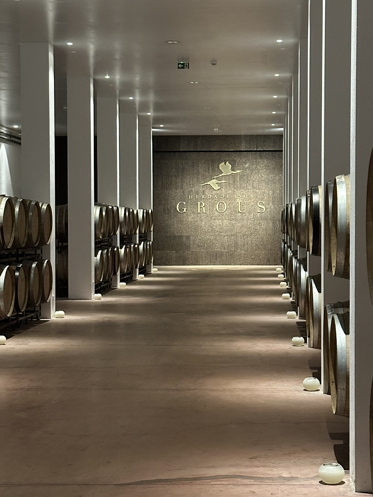Herdade dos Grous, Beja. One of the larger-production vineyards on this list (they produce and export about 1,000,000 bottles per year as of this writing in 2025). Herdade dos Grous is owned by the same German company which owns Vila Vita Parc in the Algarve, which is on our list of its coastal resorts. With traditional Portuguese style (albeit built in the 1990s and 2000s) and Bavarian decorative touches, Herdade dos Grous is a huge property with an impressive usage of every square inch for farming, livestock and irrigation. Storks nest and sweep over the fields and marshes, horses graze in fenced pastures, cattle roam to the northwest end, an impressive man-made lake offers recreation, views and irrigation, chickens, ducks and an ostrich share an abode. The wines are incredible, the service top notch, and the restaurant is the best of those listed here (and one of the best ones we’ve eaten at in all of Portugal).