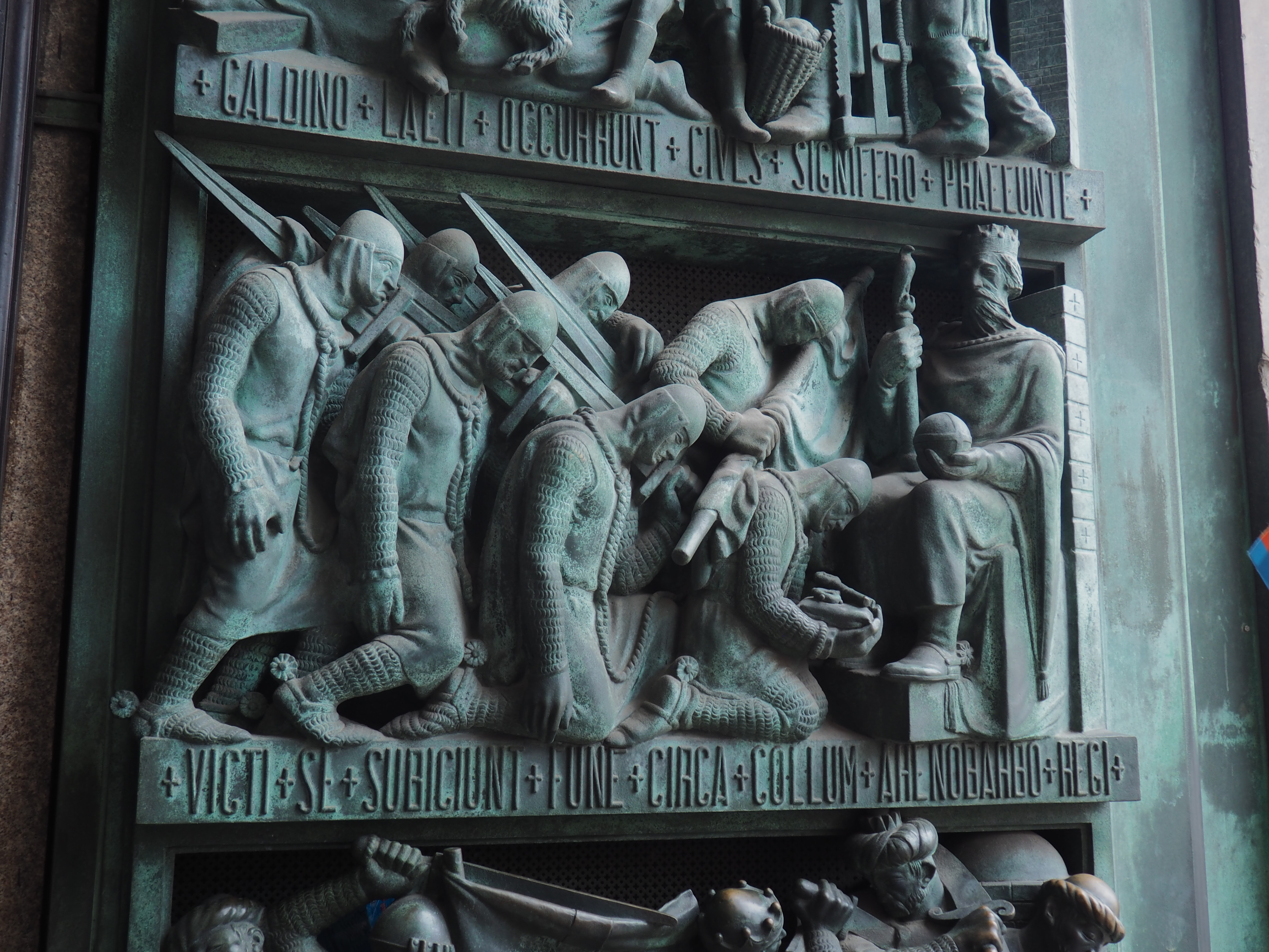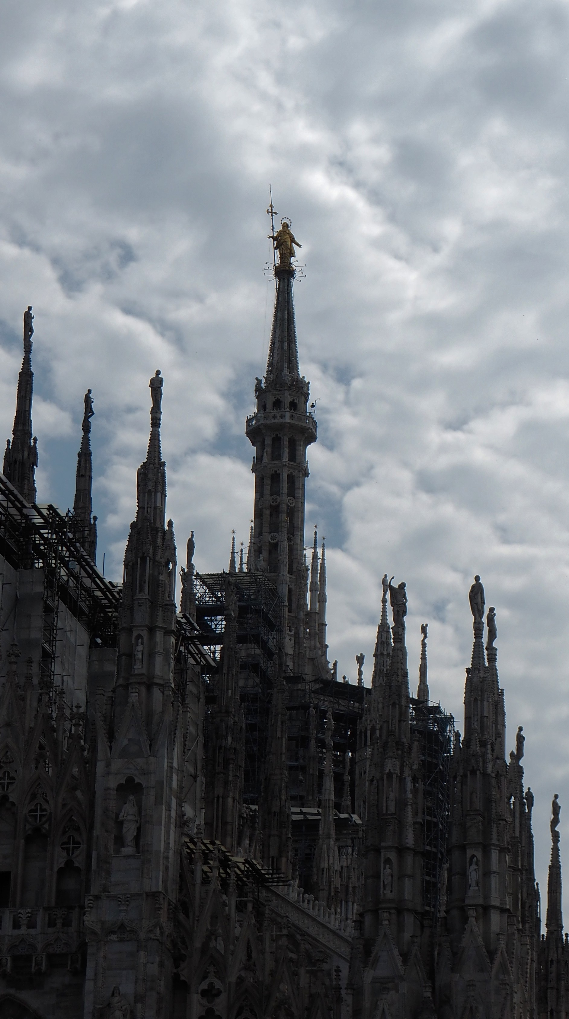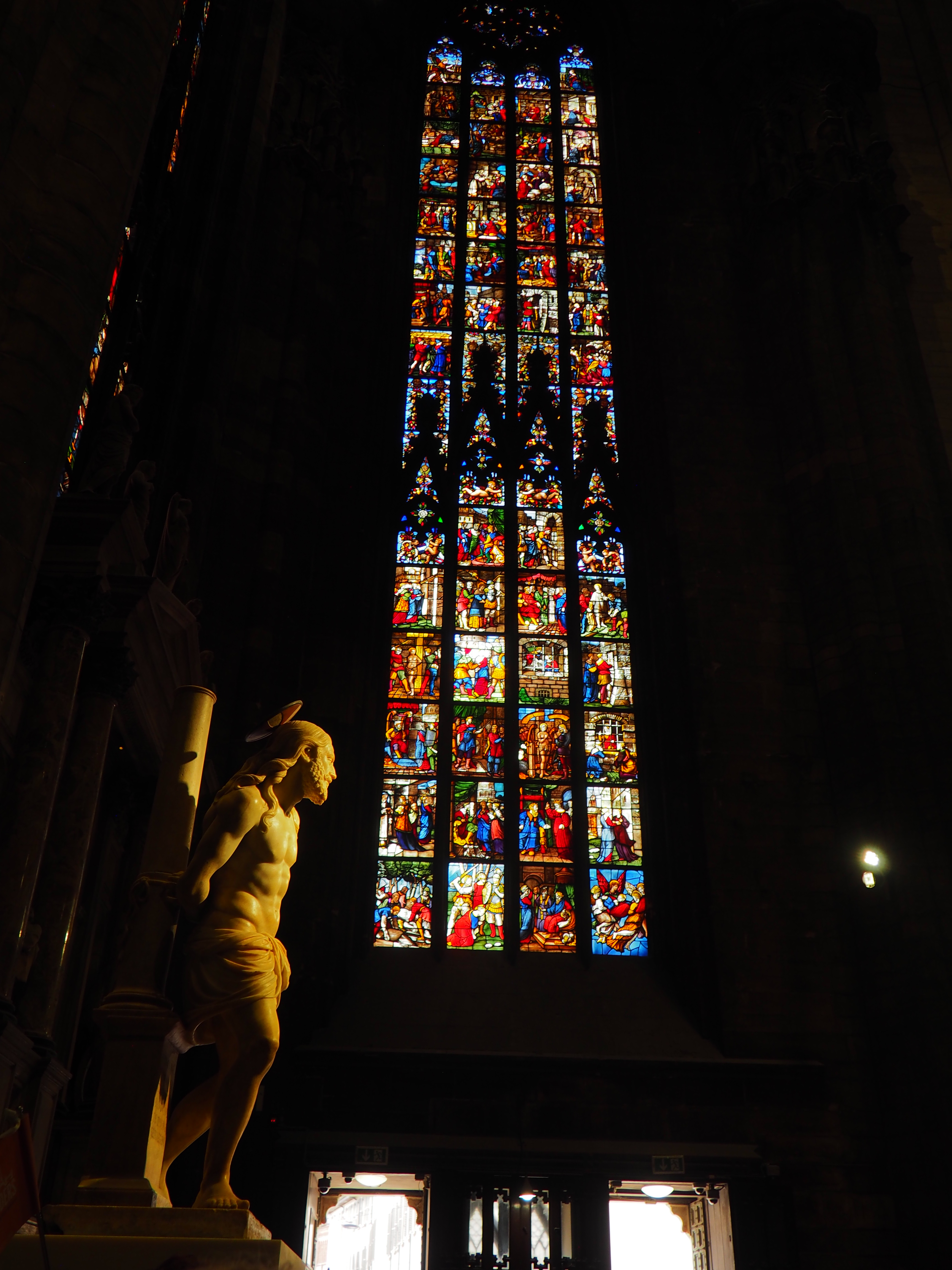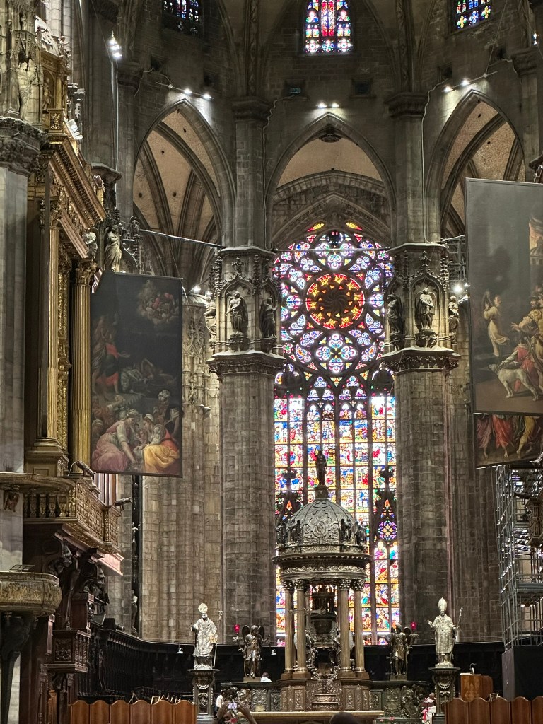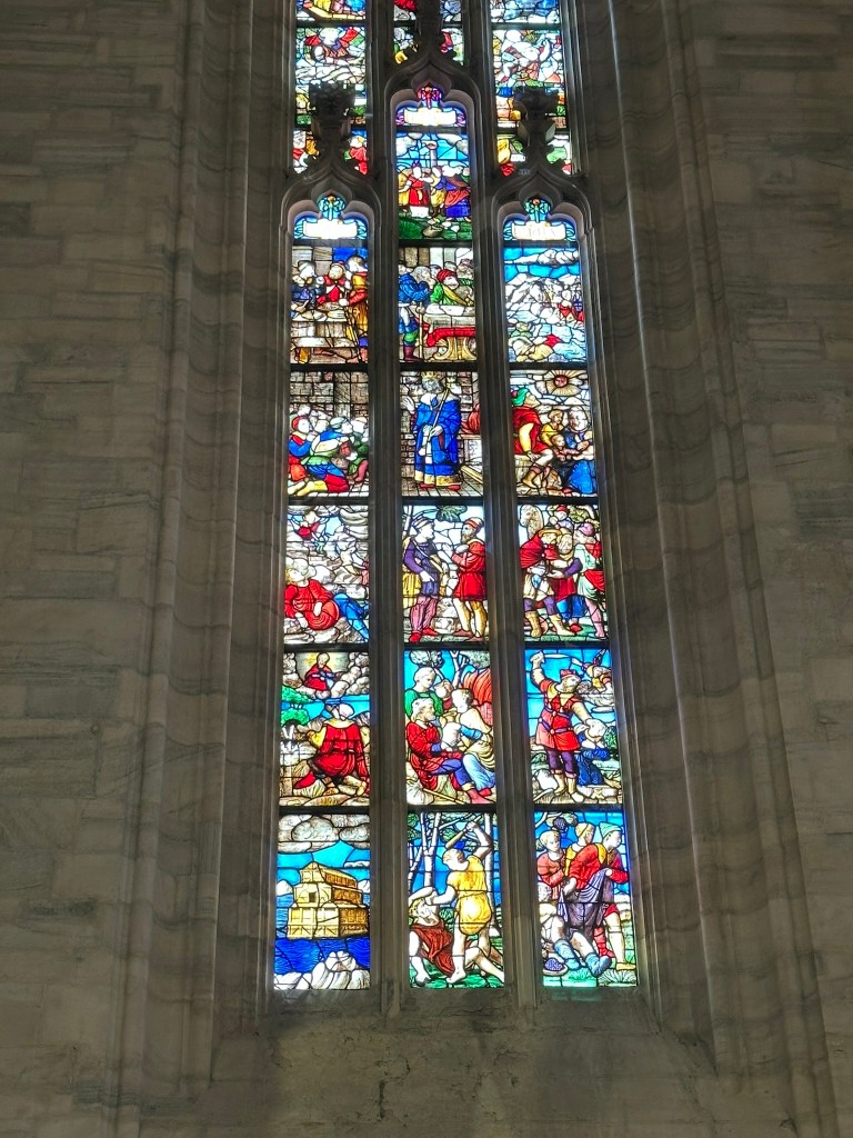 Milan’s Duomo. We began the tour at the Duomo, where we were met by our guide, Lara. We’ve been to a lot of Duomos and Italian Basilicas on our previous three trips to Italy; this one is special. There are 55 stained glass windows, 135 spires and pinnacles, 3,400 statues, 135 gargoyles and over 700 bas reliefs. Construction probably began in 1386 and has basically never stopped as it continues to be restored to this day.