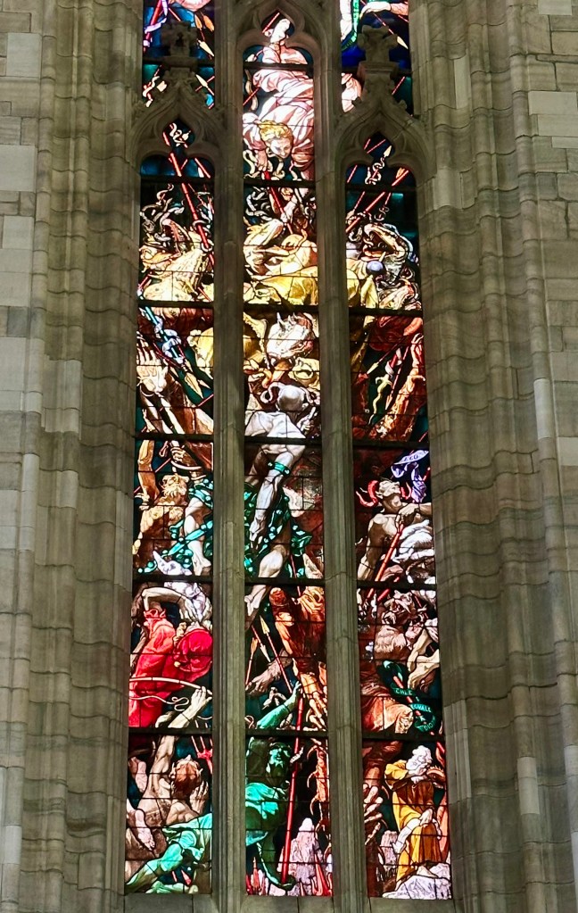 During World War II, the stained-glass windows were deconstructed piece by piece, glass stored in an undisclosed location and then reconstructed after the liberation of Italy in 1943. Because of Milan’s climate and smog from traffic and the factories of the city’s industrial roots, the Duomo is constantly being restored and cleaned from its marble floors to its spires and its glass. Proceeds are raised from tours, tickets and donations, not from the Catholic Church.