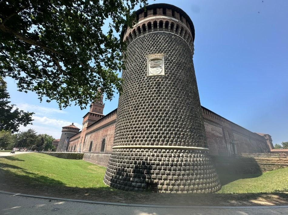 The Medieval Castle. Sforzesco castle was built by Francesco Sforza, Duke of Milan, on top of the remnants of a 14th century fort beginning in 1450. The castle changed hands over the years as France, Italy and the Austrians came to power in Milan. Once Italy was unified under King Emmanuel II, it was turned over to the Italian army. Severely damaged during World War II bombardments, it was reconstructed and now houses museums. We stopped there on our walking tour for a beverage in its courtyard and because the toilets are free to use.