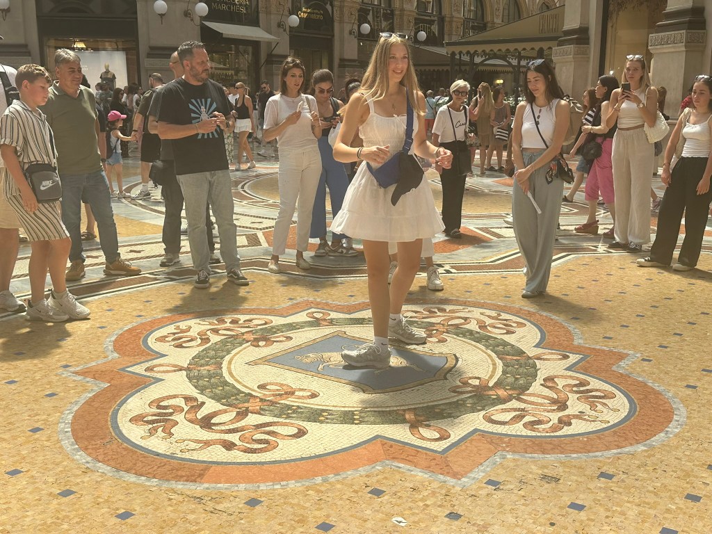 On a mosaic in the center, an image of a bull was placed on the floor, a slight to Torino (Turin) whose emblem is a bull. Since this one was on the floor, it could be stepped, or rather, stomped on. Apparently, some enterprising Milanese created a rumor that if you spin on your heel three times on the bull’s testicles it’ll bring you good luck, so you can watch tourists spinning away on the deep indentation in the center of the bull for sport. Who can say if it really brings them luck?
