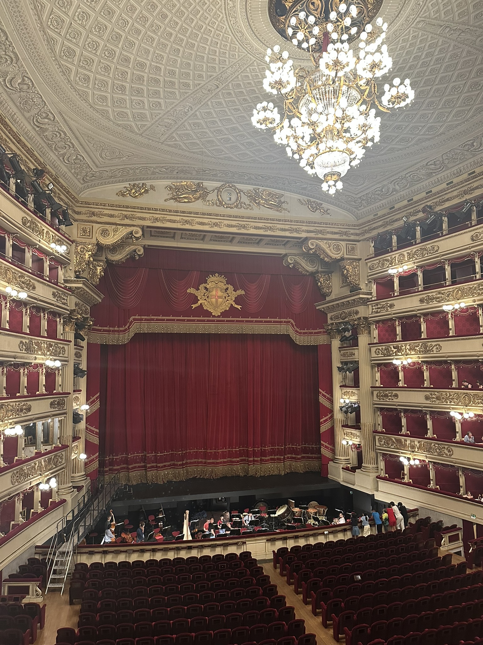 The day after our walking tour, we booked another guided tour, this one of La Scala opera house and the museum. This tour wasn’t quite so good, mostly for the slow cadence of our guide’s speech on a hot afternoon, but we did get to watch a ballet rehearsal for a short time and return to view the opera house fully opened up when rehearsal wrapped.